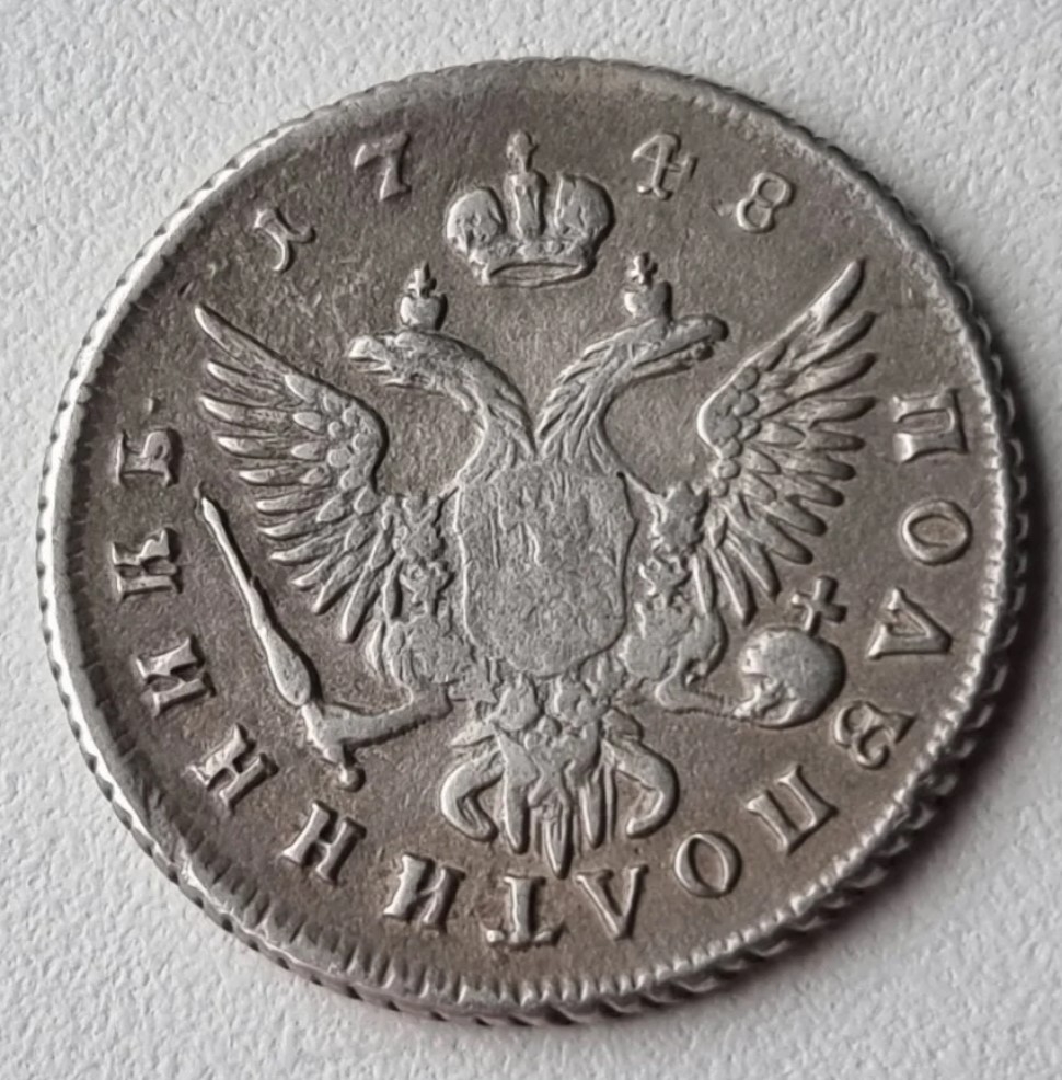Полуполтинник 1748 года — серебряная монета Российской Империи, выпущенная в период правления императрицы Елизаветы Петровны. Номинал в 25 копеек был частью денежной реформы. Представленный экземпляр является копией, о чём прямо указано в описании поста.