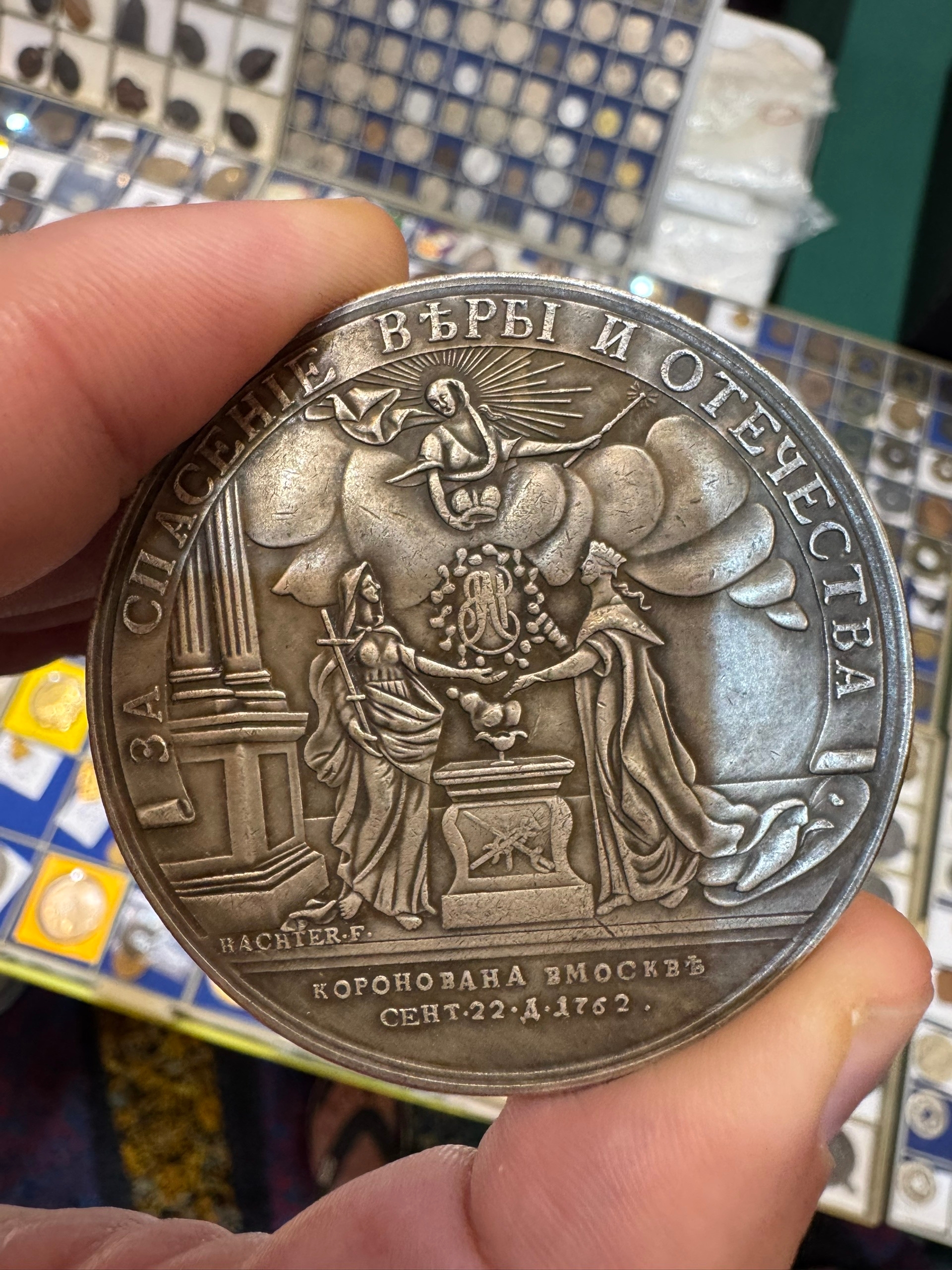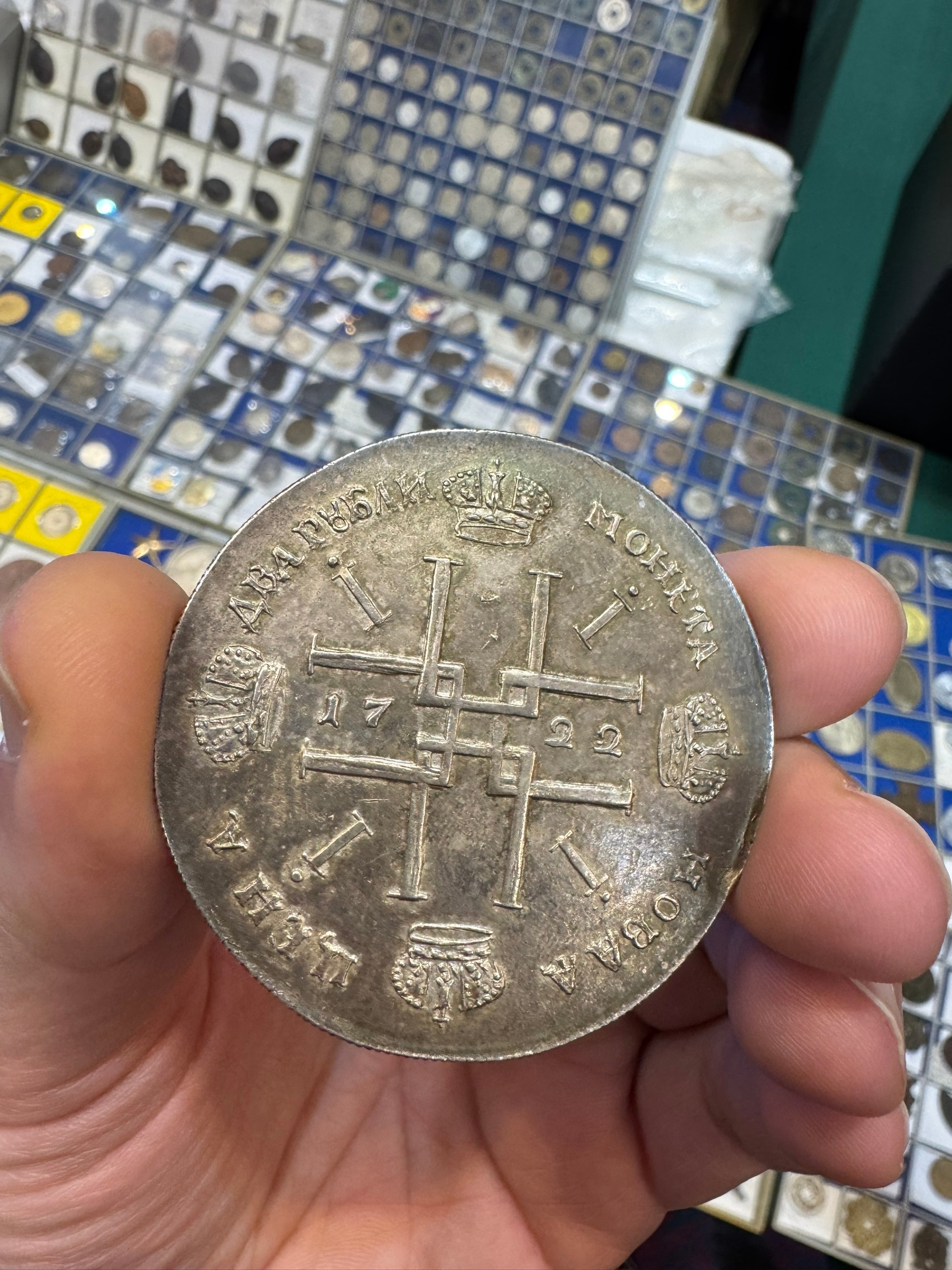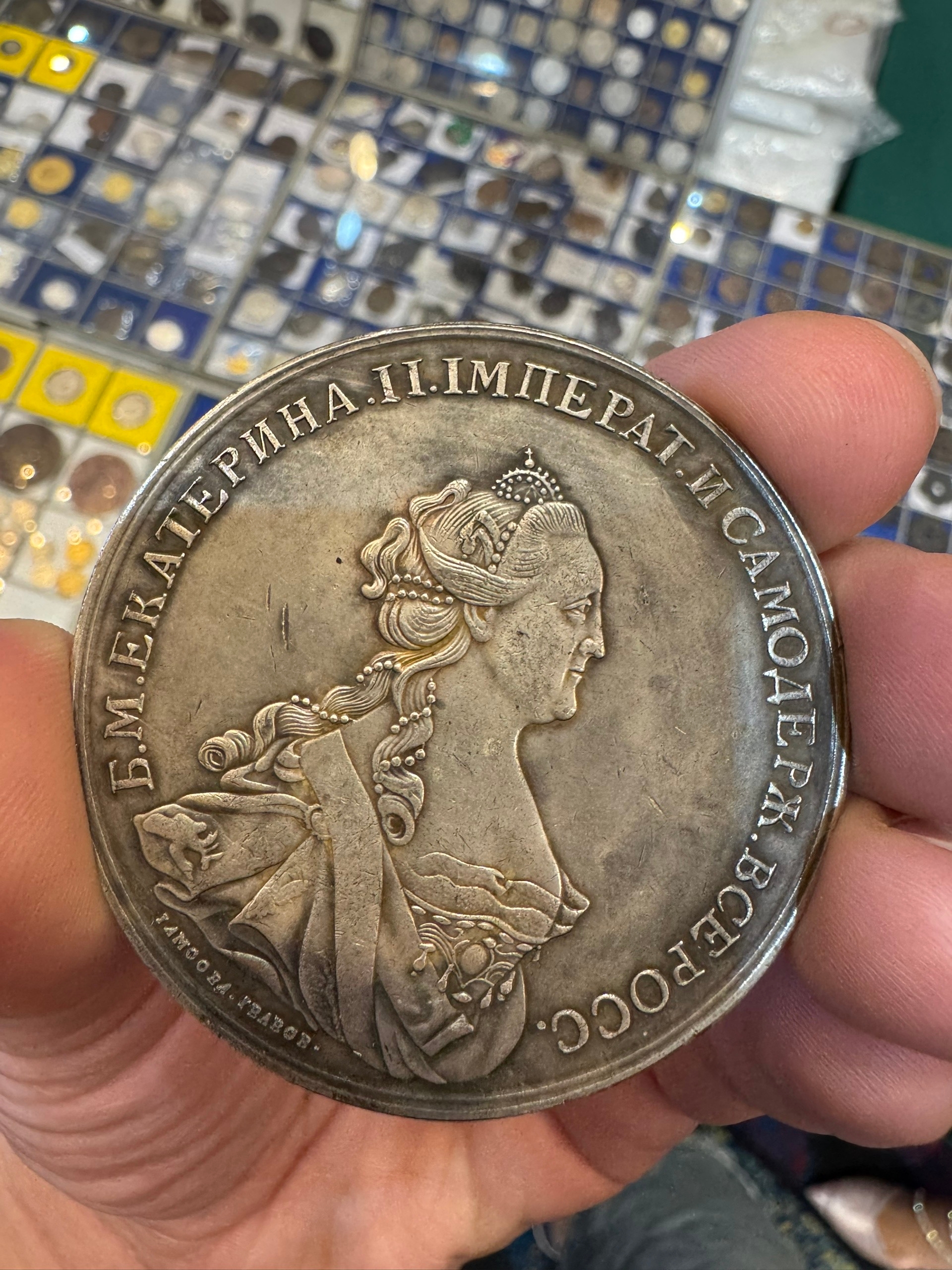 Представленная монета — рубль времён Екатерины II. Продавалась на нумизматической выставке TINF 2026 в Бангкоке по завышенной цене. Её подлинность вызывает серьёзные сомнения, так как оригинальные экземпляры такой сохранности и происхождения крайне редко встречаются в подобных условиях продаж.