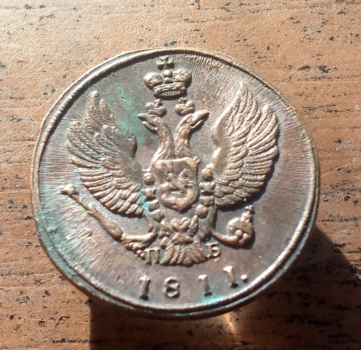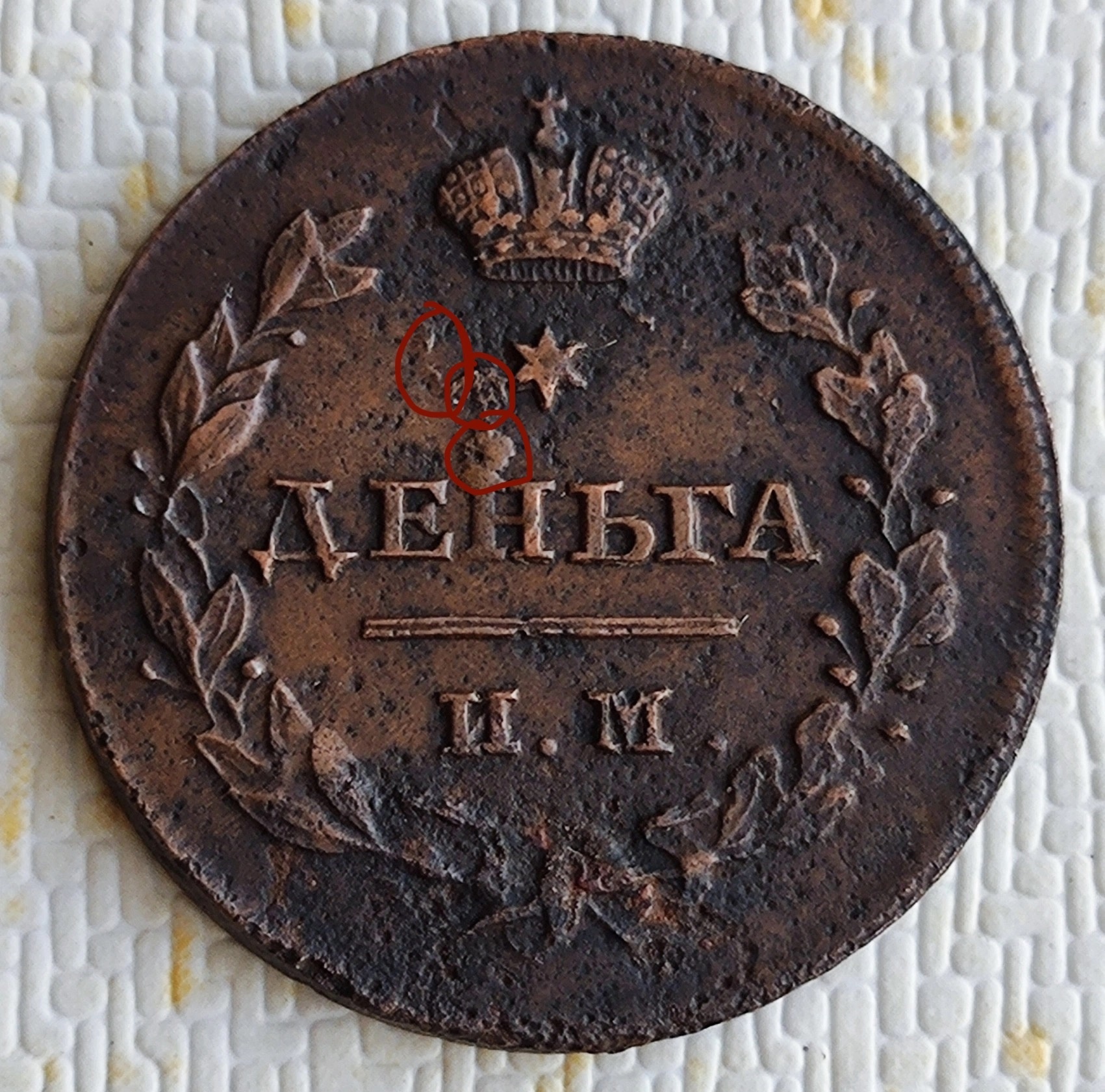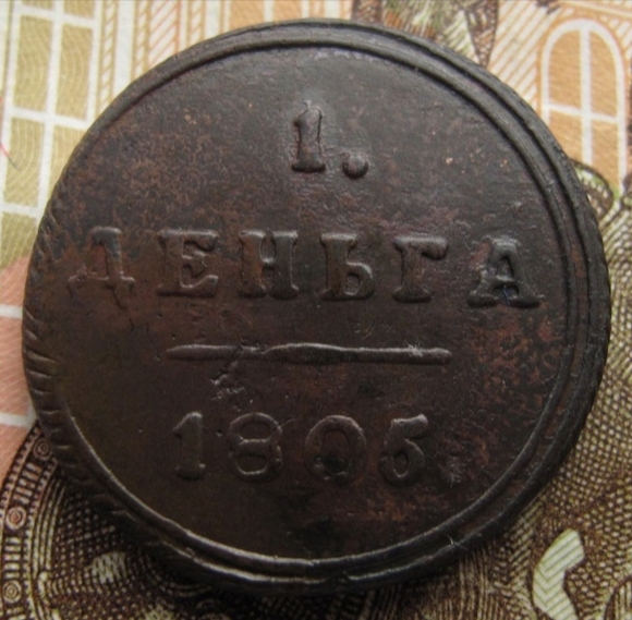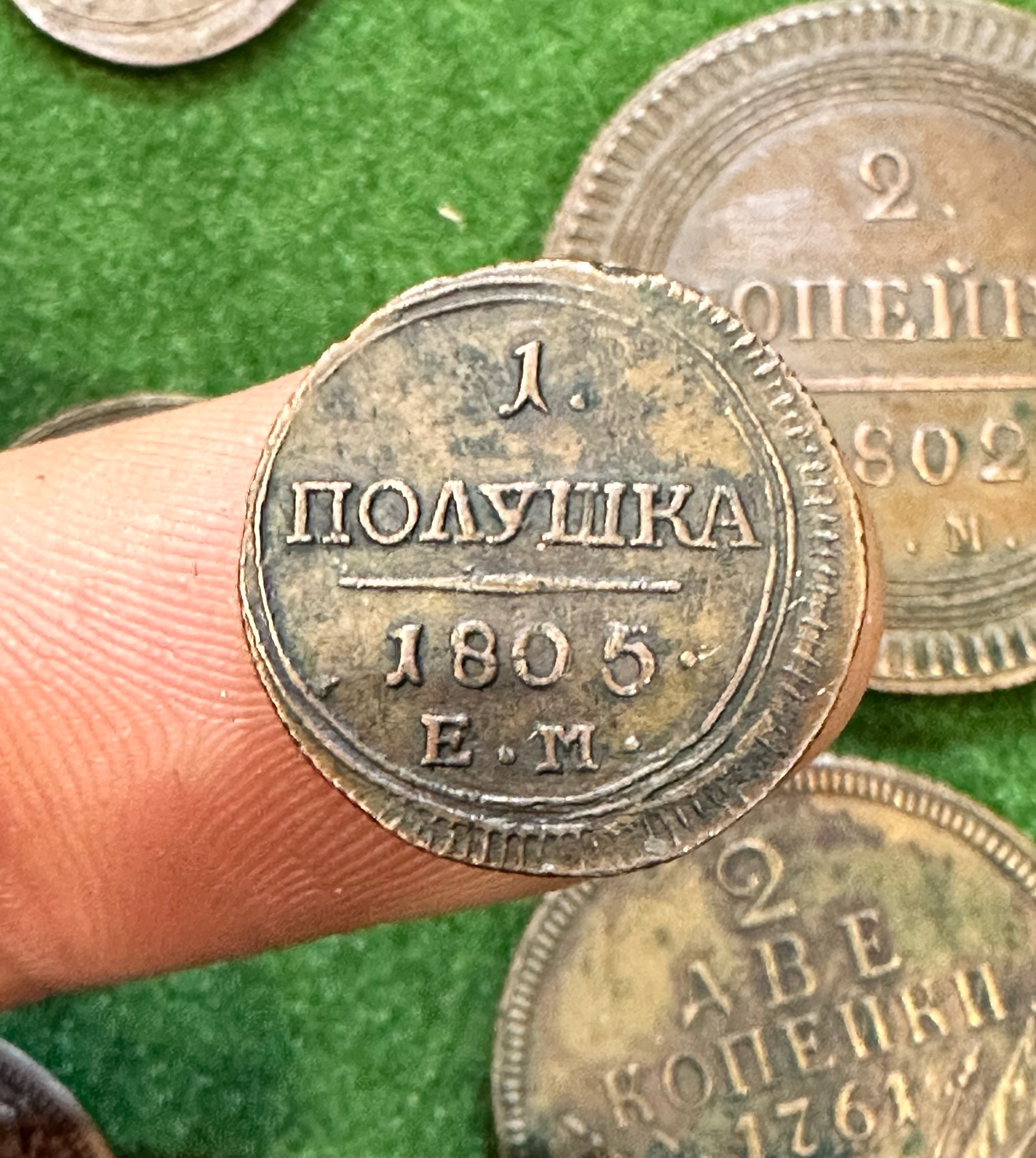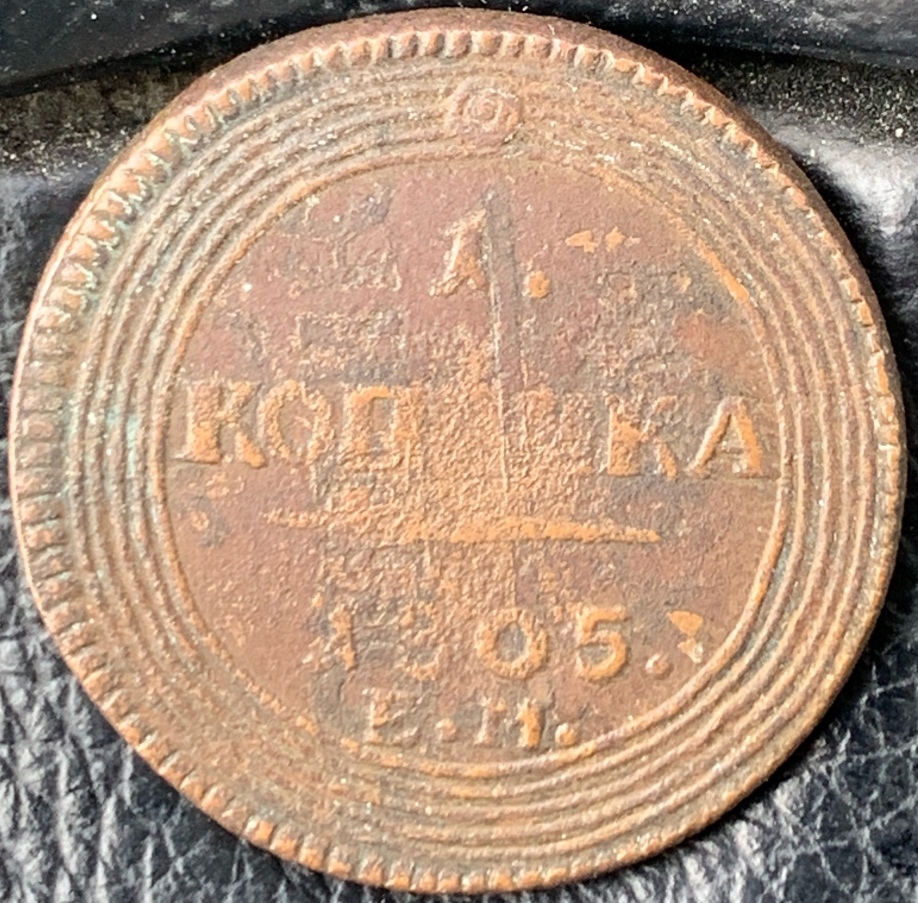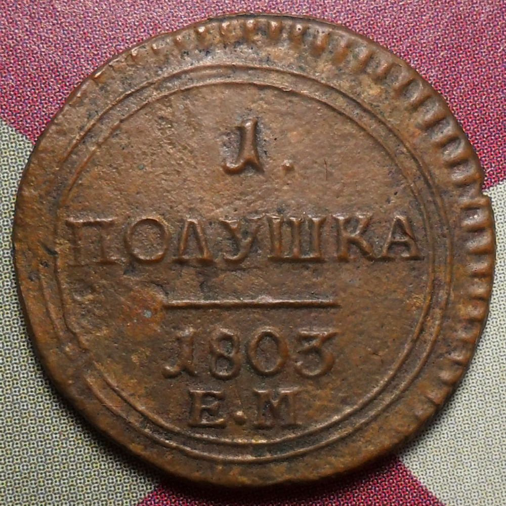 Медная полушка 1803 года с монограммой Екатеринбургского монетного двора (ЕМ), отчеканенная в правление Александра I. Владелец в посте утверждает, что это подделка, однако комментаторы не нашли явных признаков фальшивки. Из-за низкого качества фотографий и отсутствия чётких аргументов в комментариях установить подлинность монеты не представляется возможным.