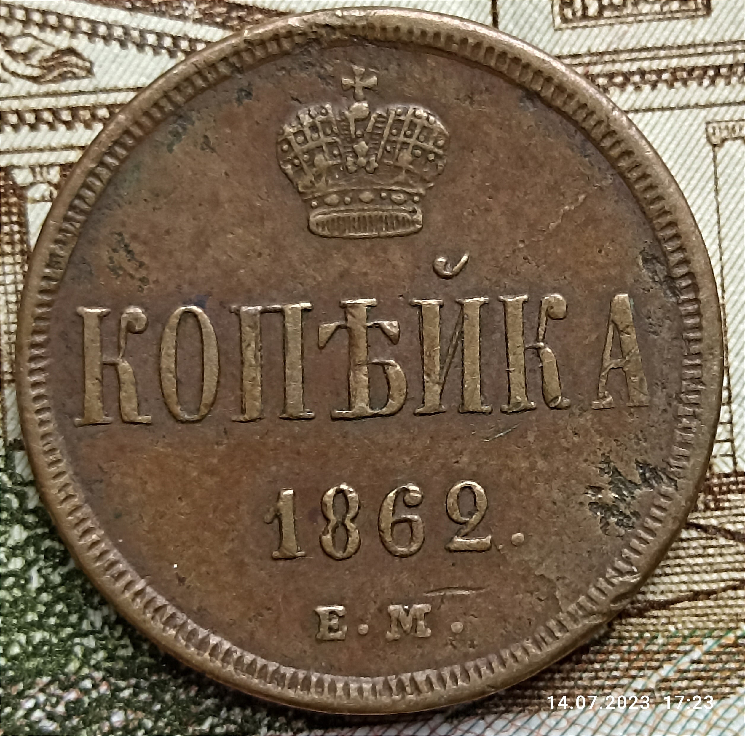Медная копейка 1862 года, отчеканенная в период правления императора Александра II. Это стандартная монета регулярного чекана, не представляющая большой нумизматической редкости. Судя по консенсусу в комментариях, представленный экземпляр является подлинным, без признаков литья или иных методов подделки.