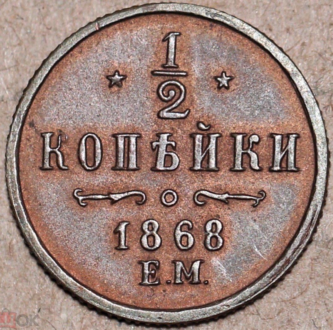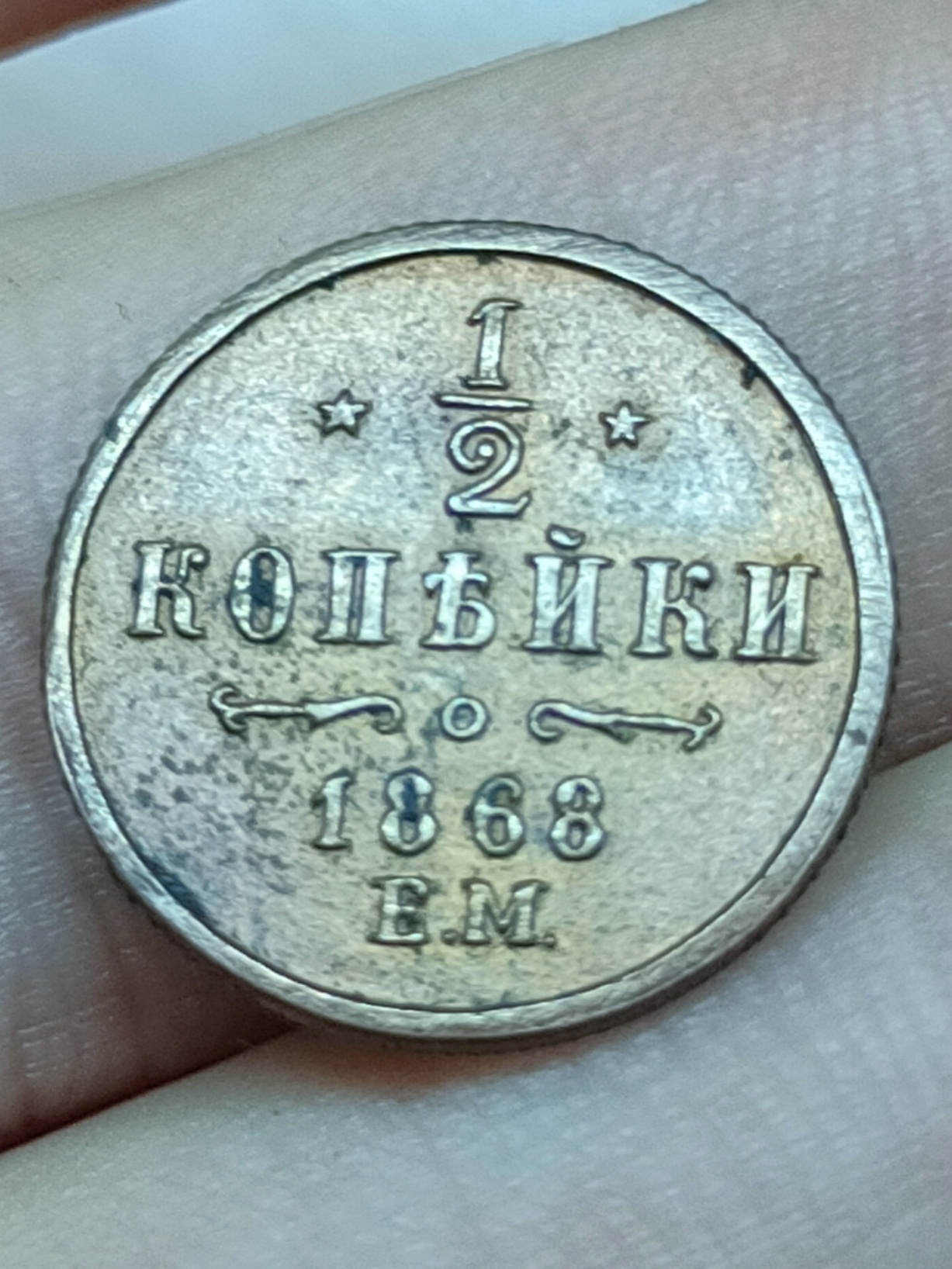 Монета представляет собой копию медной 1/2 копейки 1868 года, отчеканенной в период правления Александра II. Оригинальные монеты этого номинала и года имеют определённые характеристики штемпеля и качества металла. В данном случае автор поста прямо указал, что это копия, что исключает её подлинность.