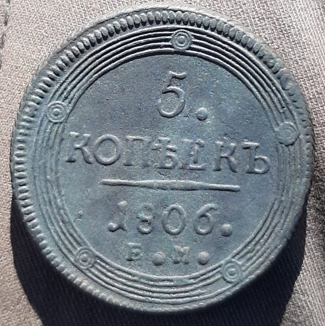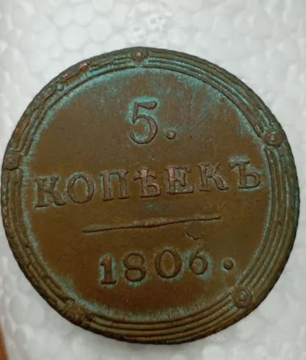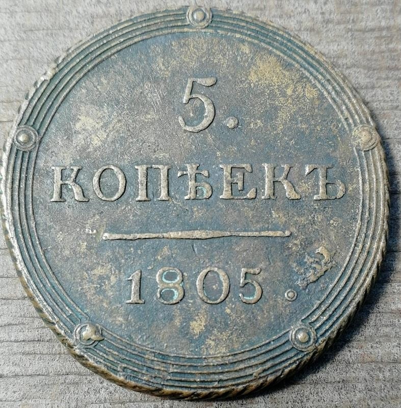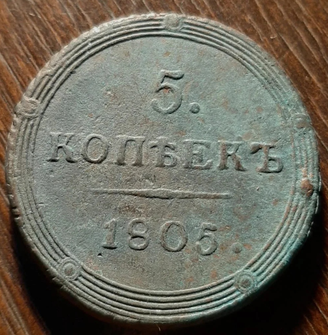 Монета номиналом 5 копеек 1801 года, отчеканенная при императоре Александре I на Екатеринбургском монетном дворе (инициалы минцмейстера Фёдора Цетреуса — ЕМ-ФЦ). В посте автор прямо указывает, что это подделка, а в комментариях её называют «сувениром», что в нумизматическом сленге также означает неоригинальную монету, созданную для коллекционеров, а не для обмана.