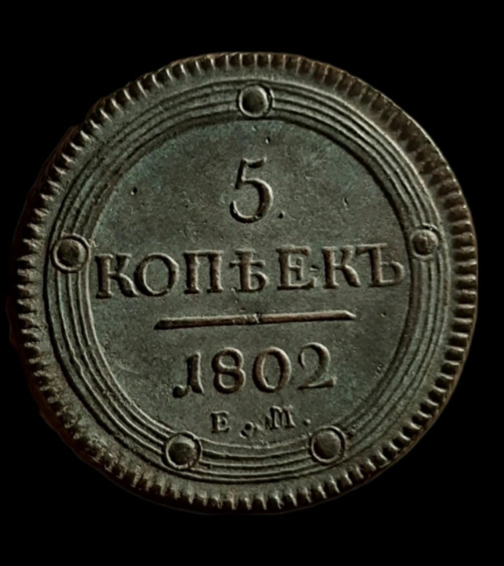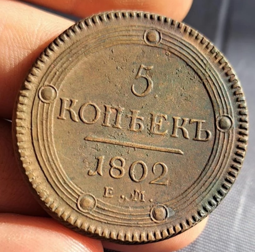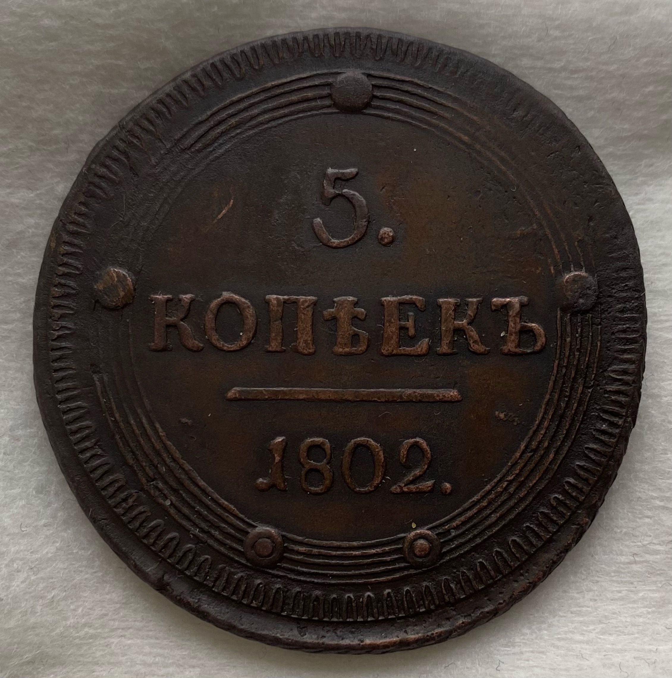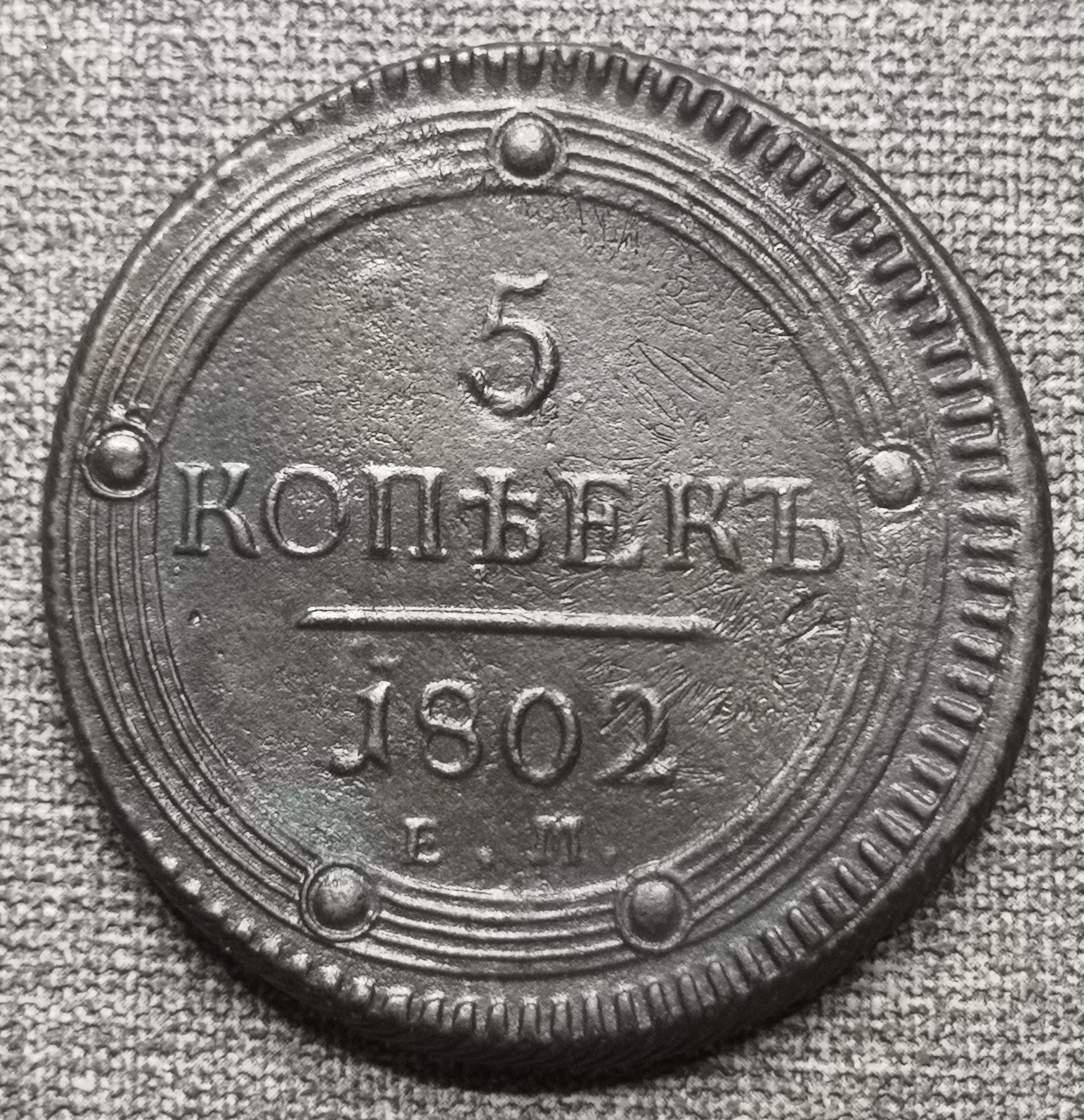 Медная 5-копеечная монета 1802 года с инициалами минцмейстера ЕМ (Егор Мейджер), отчеканенная в правление Александра I. На основе консенсуса в комментариях экспертов, данная монета признана копией. Коллекционеры указывают на наличие ряда отличий от оригинальных экземпляров, характерных для современных подделок.