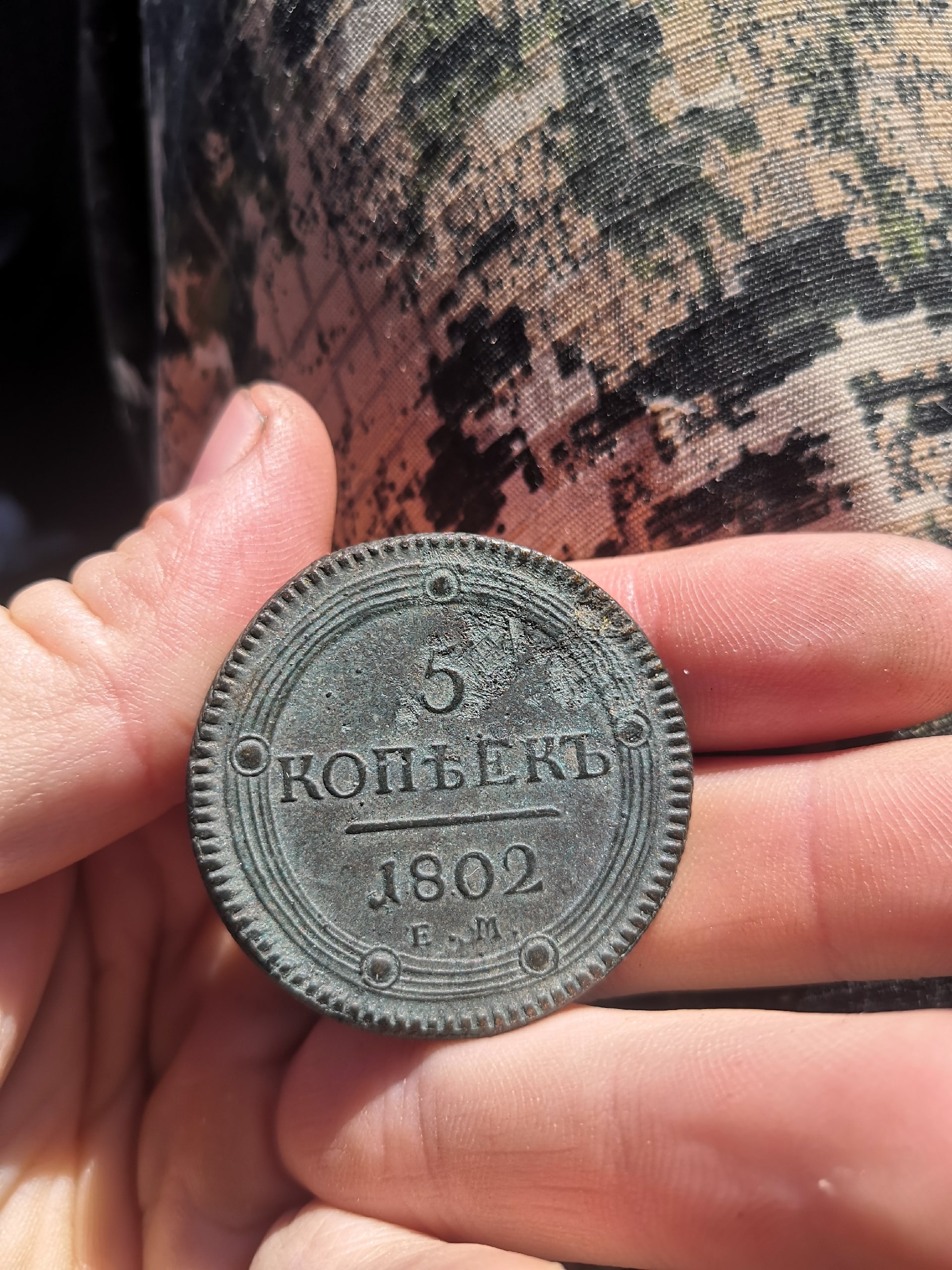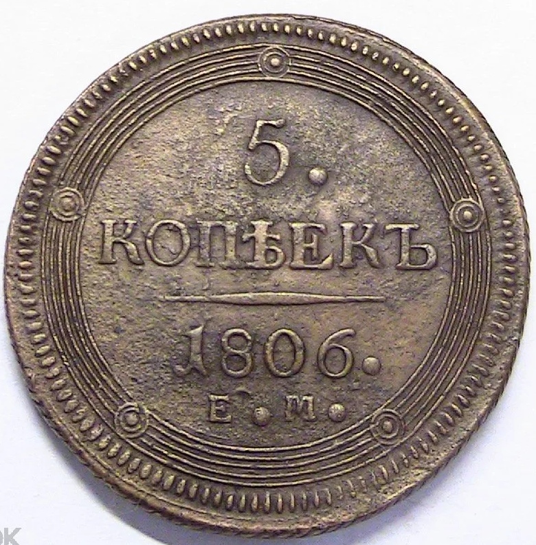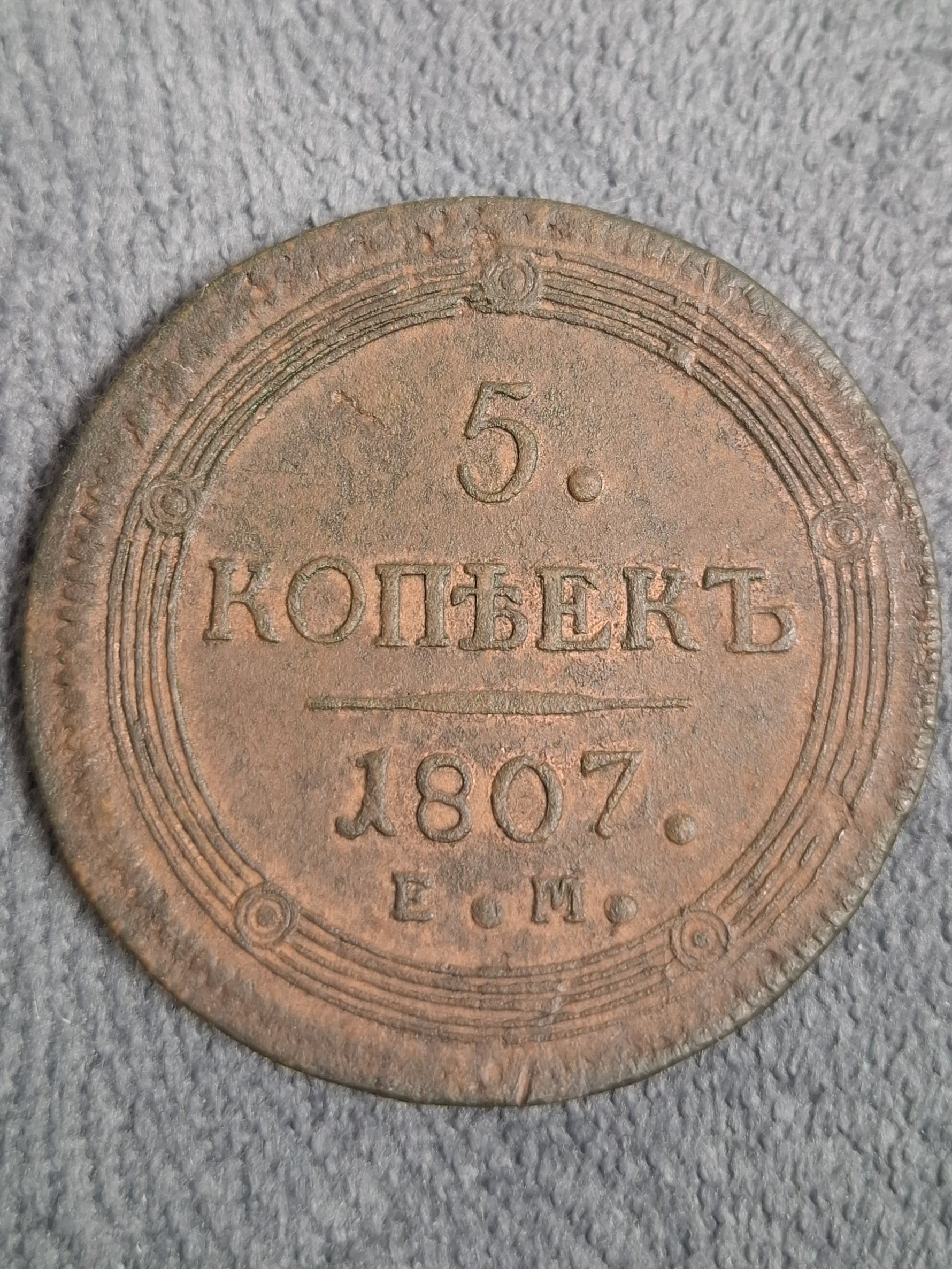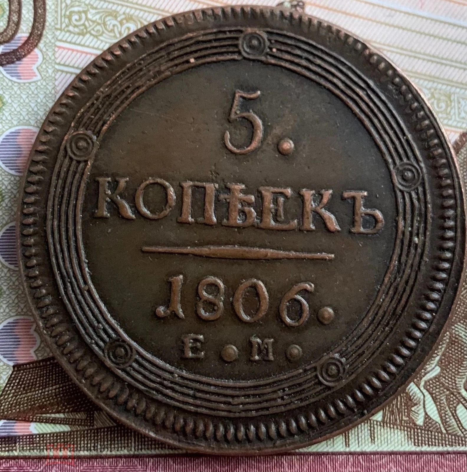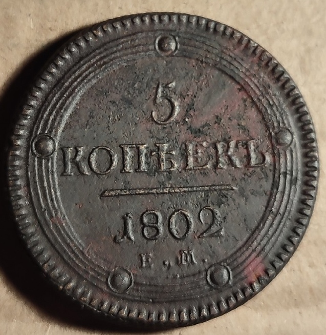 Медная 5-копеечная монета 1802 года с инициалами минцмейстера ЕМ (Егор Мейджер), отчеканенная в правление Александра I. На основе консенсуса в комментариях экспертов, данная монета признана копией. Коллекционеры указывают на наличие ряда отличий от оригинальных экземпляров, характерных для современных подделок.