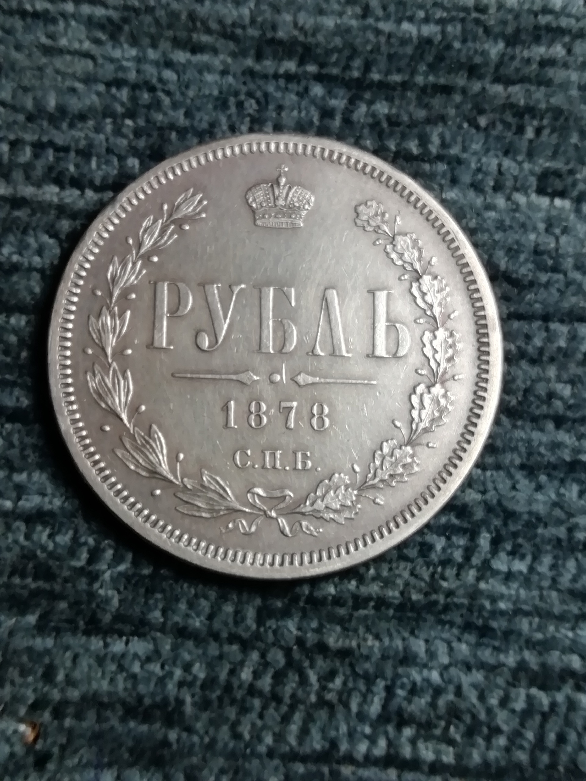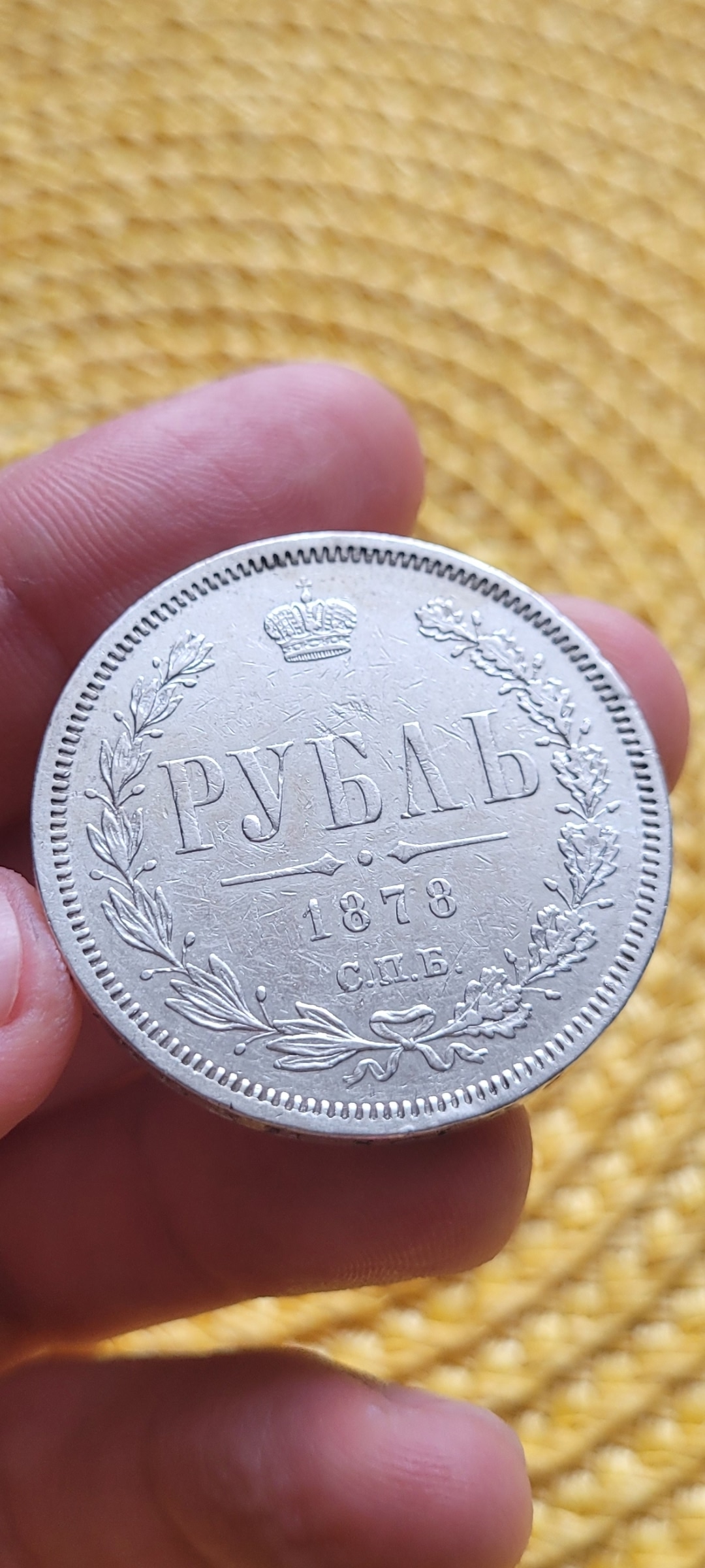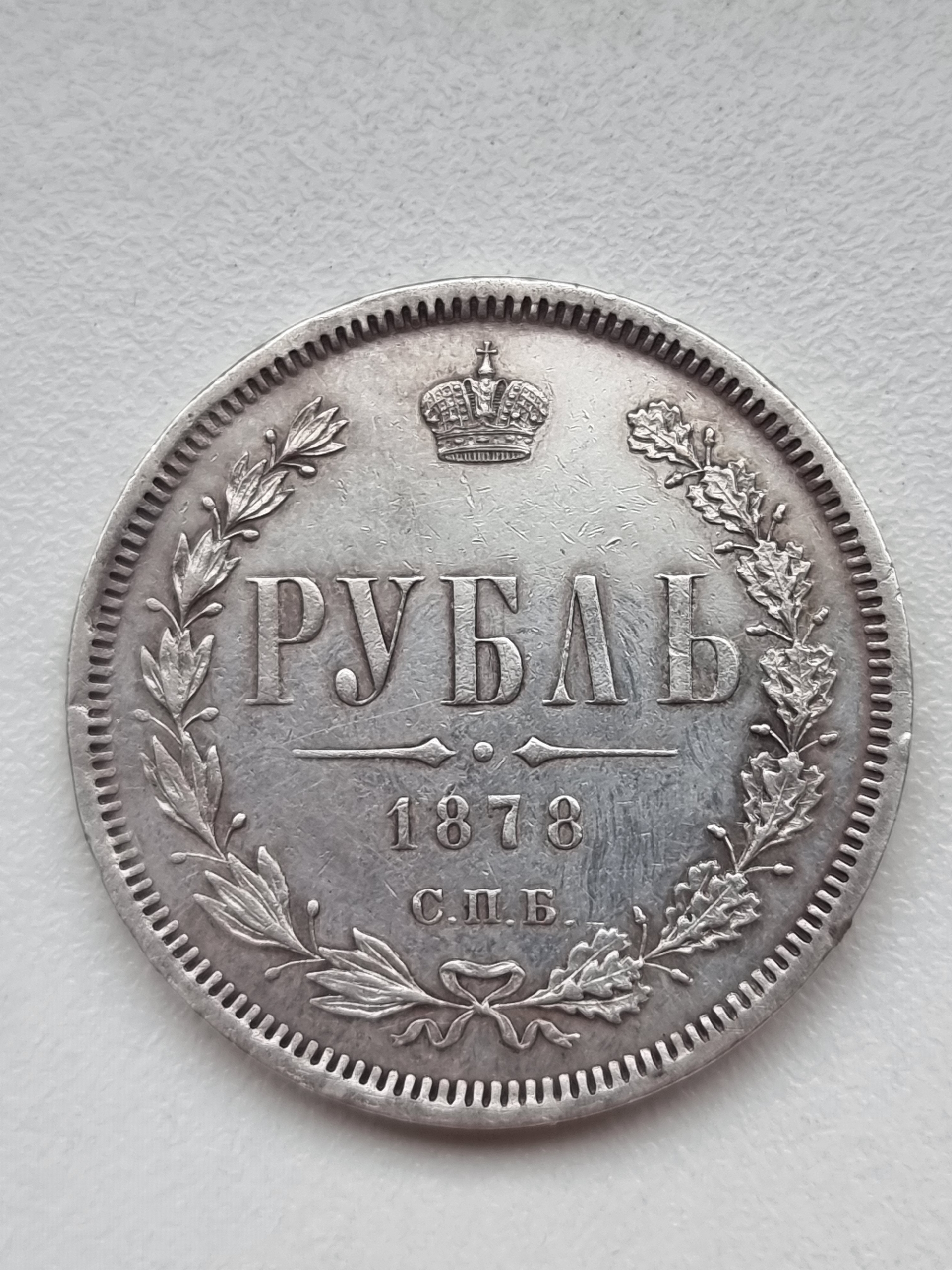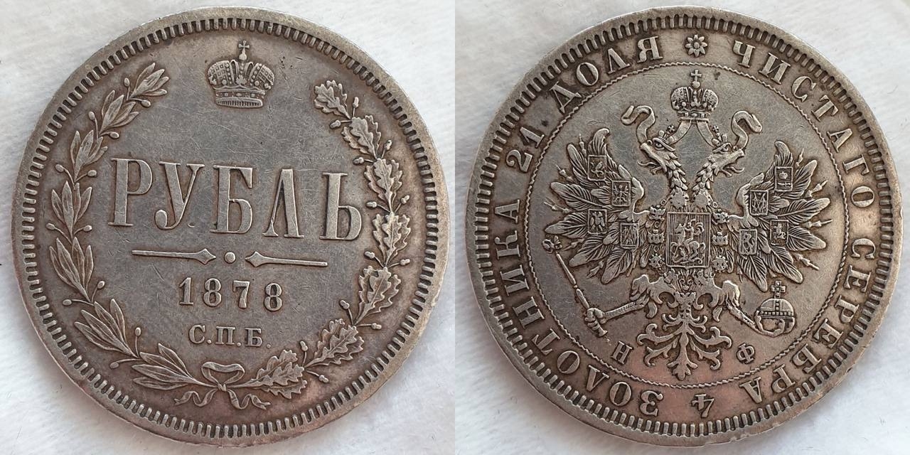 Серебряный рубль 1878 года, отчеканенный в период правления императора Александра II. Монета стандартного чекана Санкт-Петербургского монетного двора. Большинство экспертов в обсуждении признали её подлинной, несмотря на некоторые вопросы к состоянию гурта.