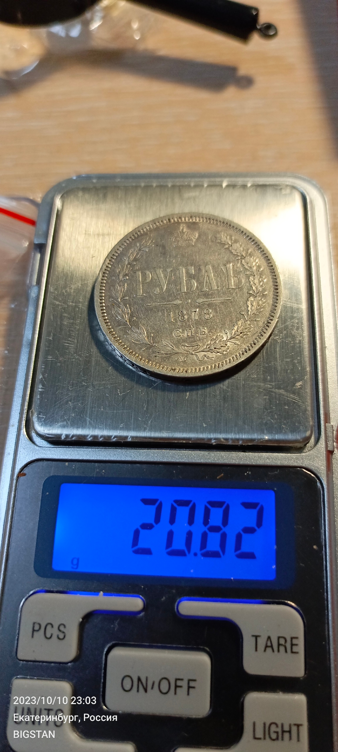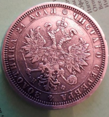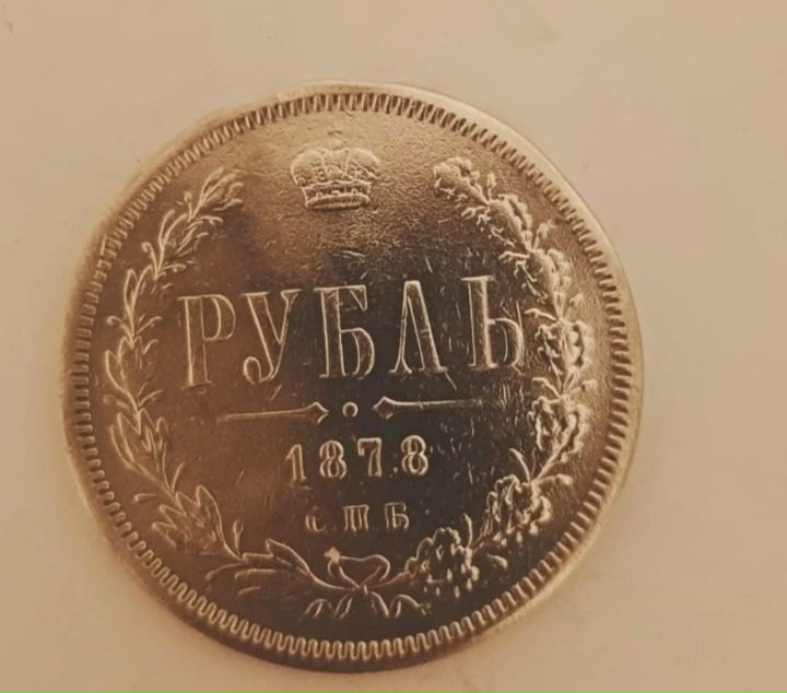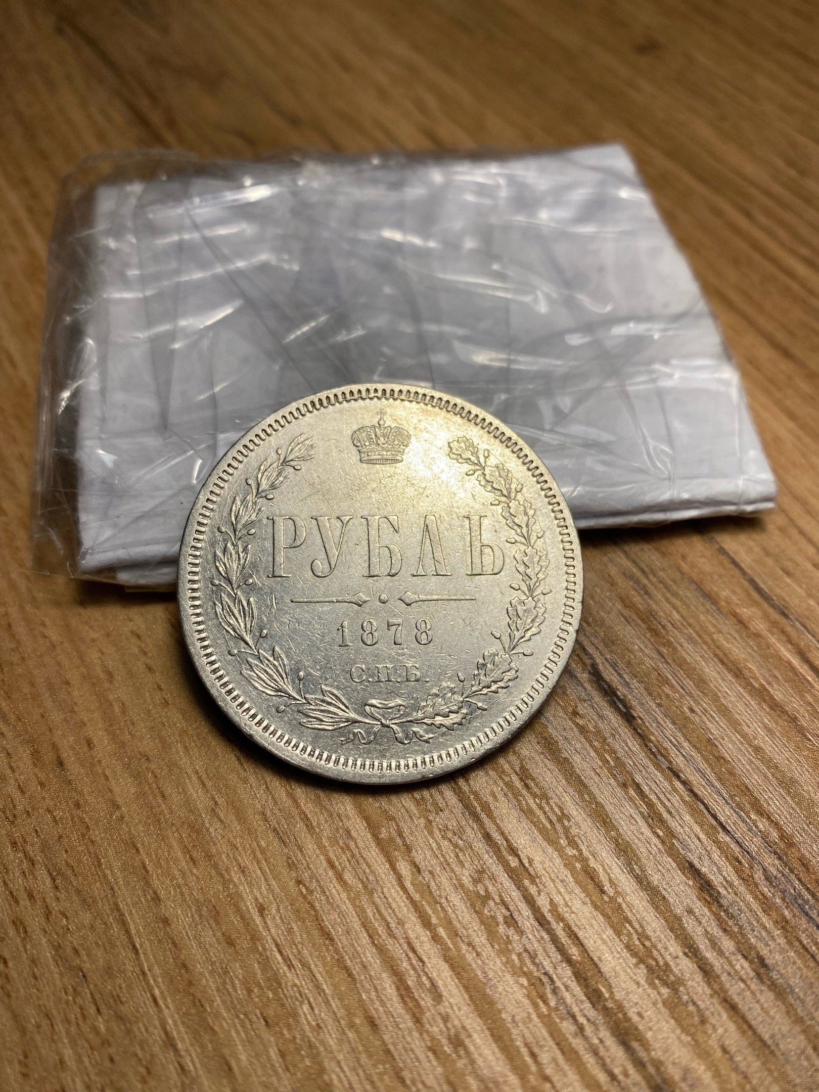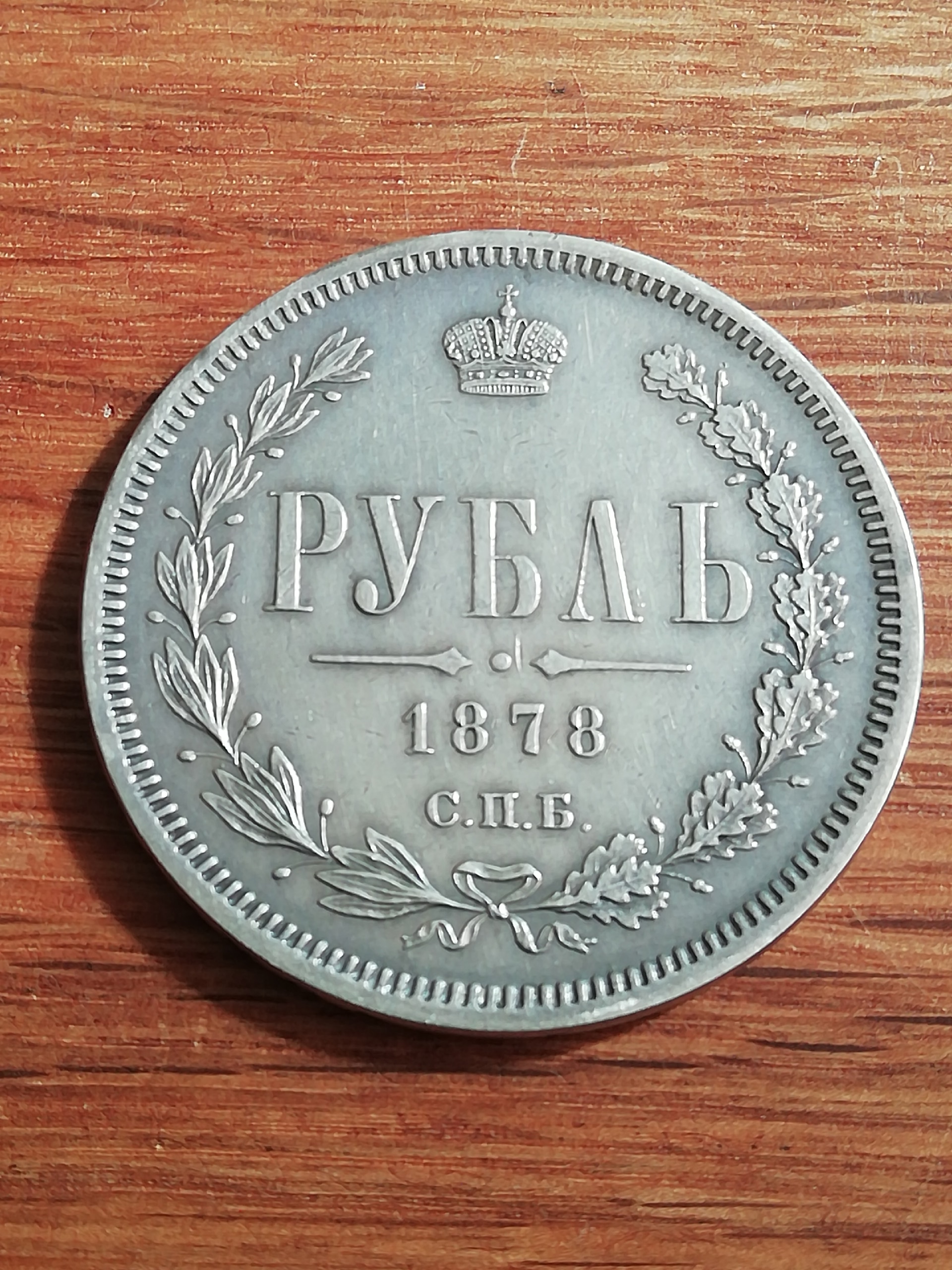 Серебряный рубль 1878 года, отчеканенный в период правления императора Александра II. Монета стандартного чекана Санкт-Петербургского монетного двора. Большинство экспертов в обсуждении признали её подлинной, несмотря на некоторые вопросы к состоянию гурта.