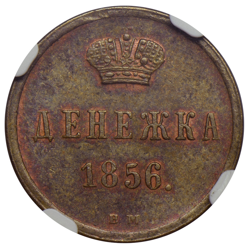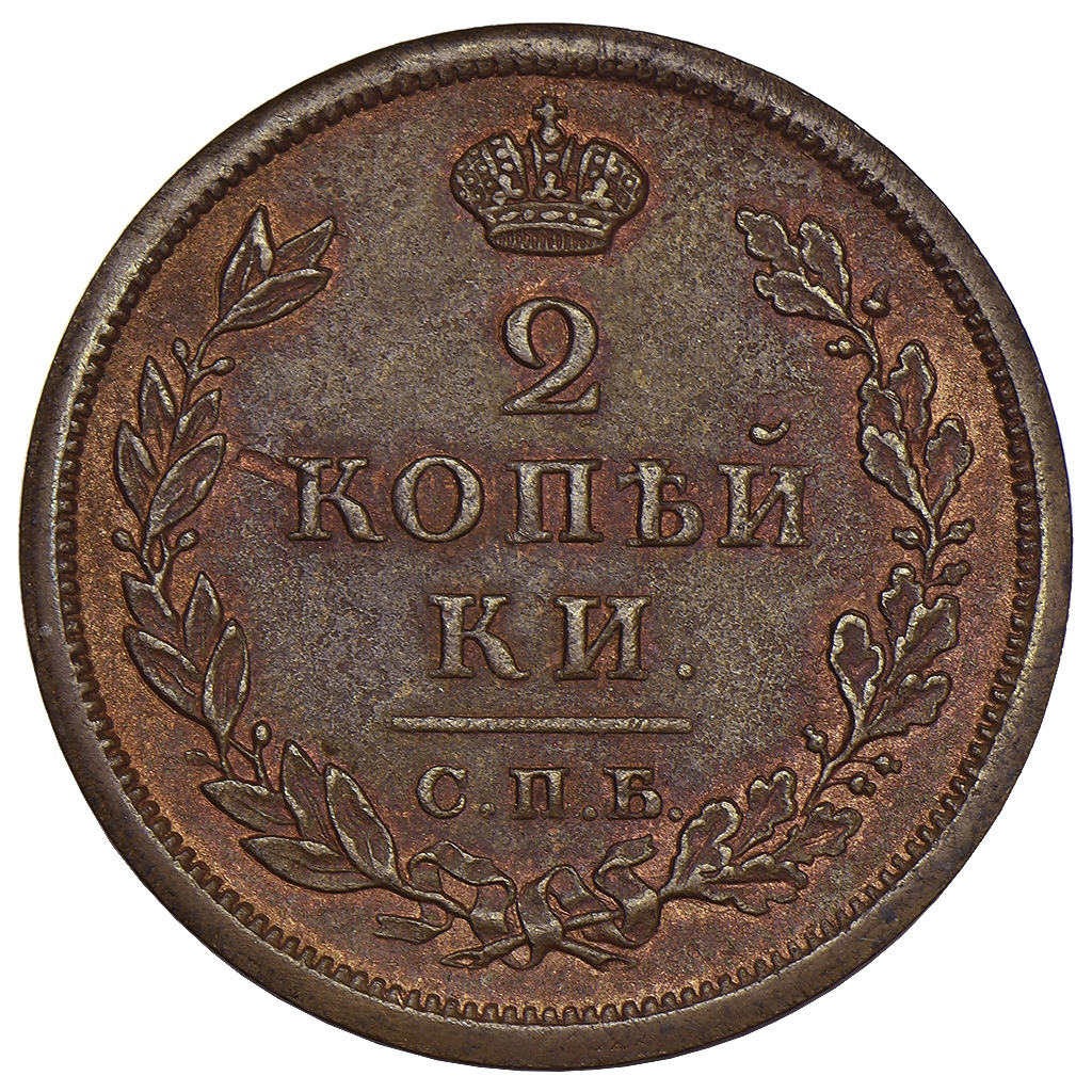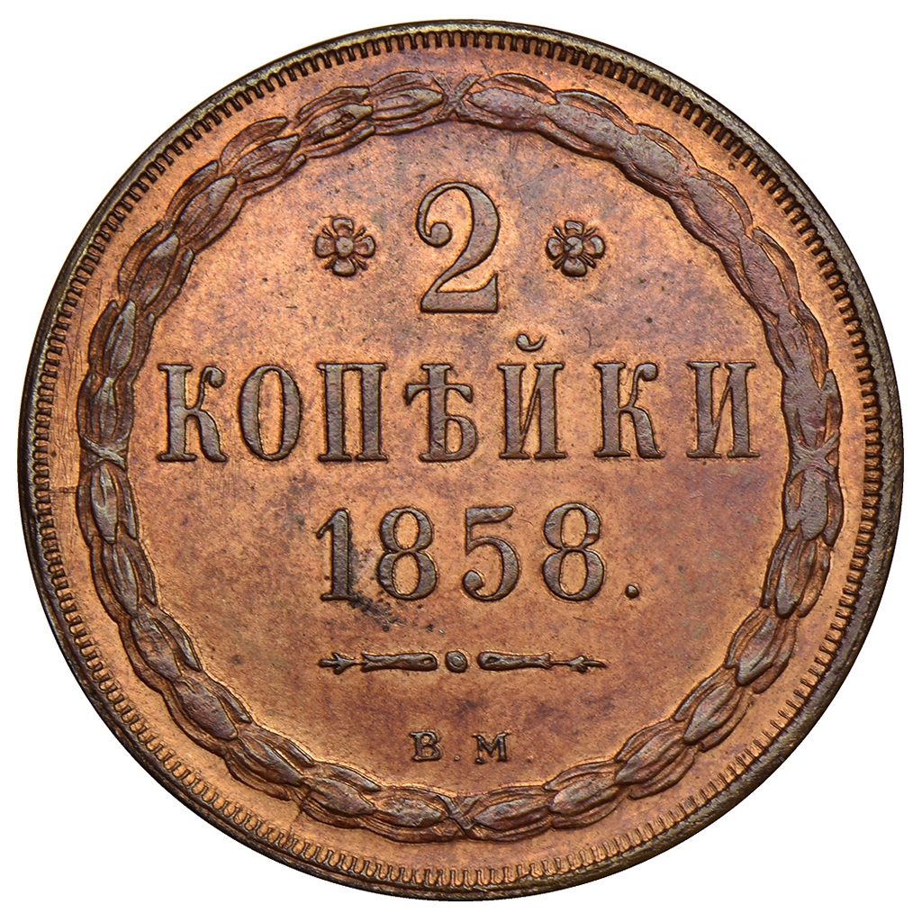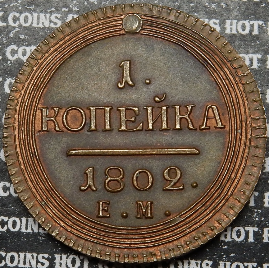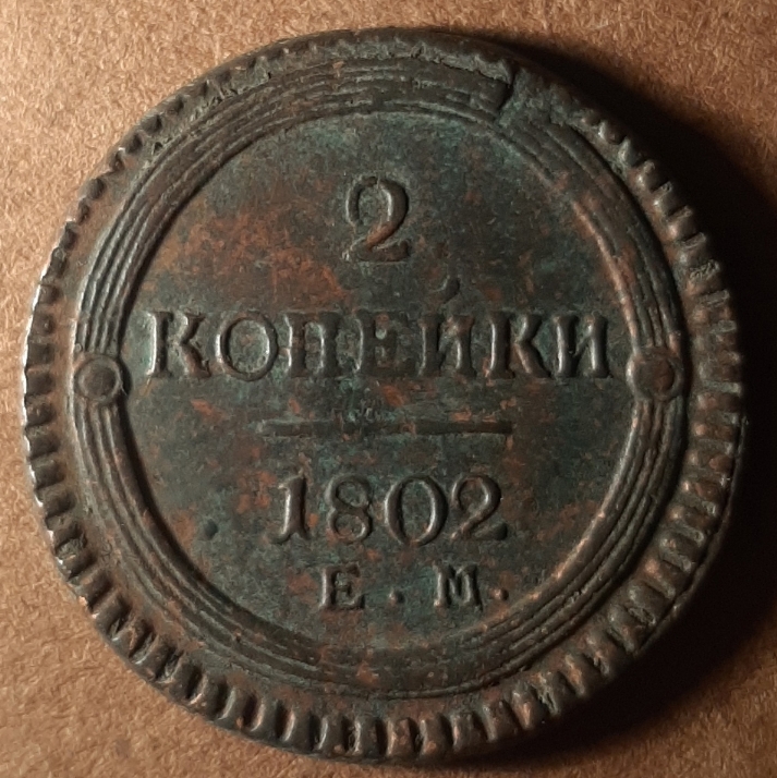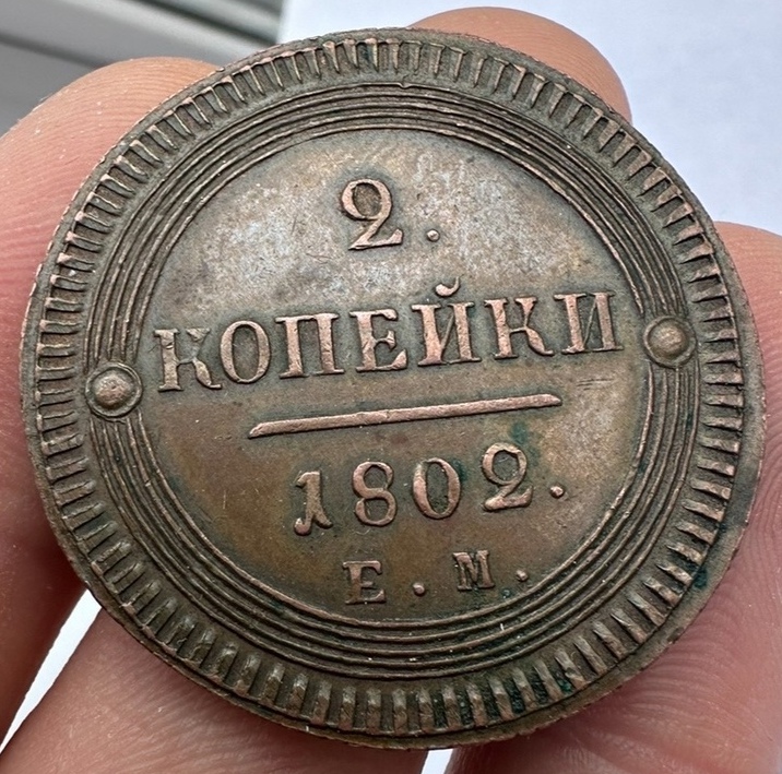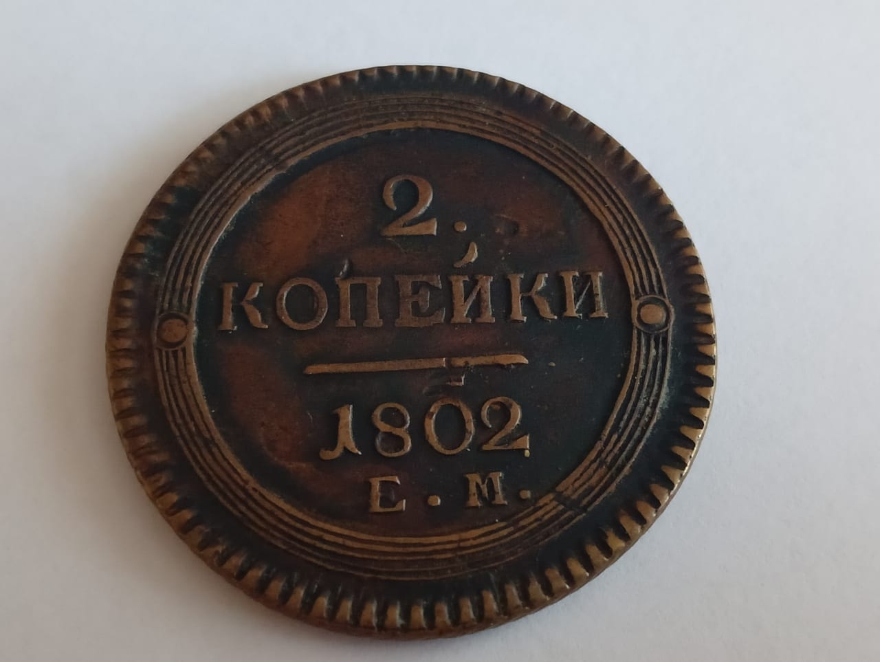 Медная монета номиналом 2 копейки 1802 года с инициалами минцмейстера ЕМ (Егор Мейджер), отчеканенная в период правления Александра I. В нумизматическом сообществе данная монета признана фейком, о чём свидетельствует консенсус экспертов в комментариях. Подделка отличается низким качеством исполнения деталей, в частности, проработки перьев на орле, что характерно для современных реплик.