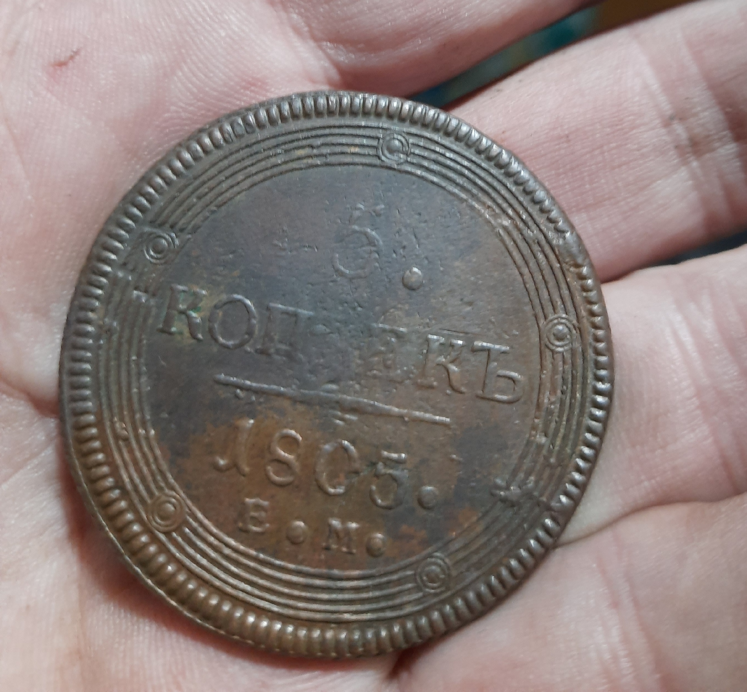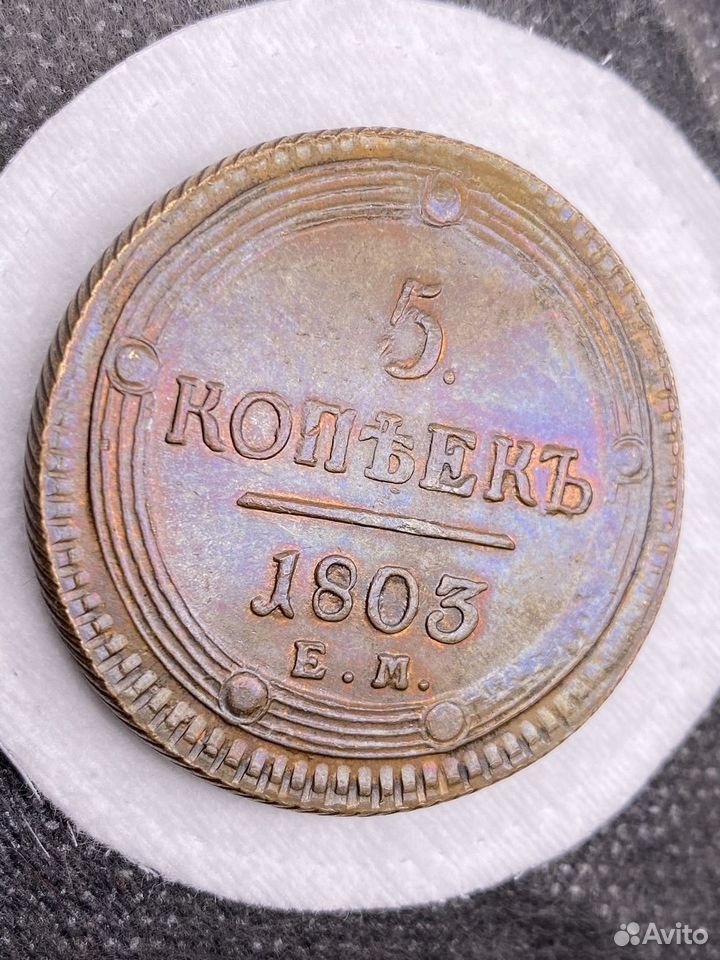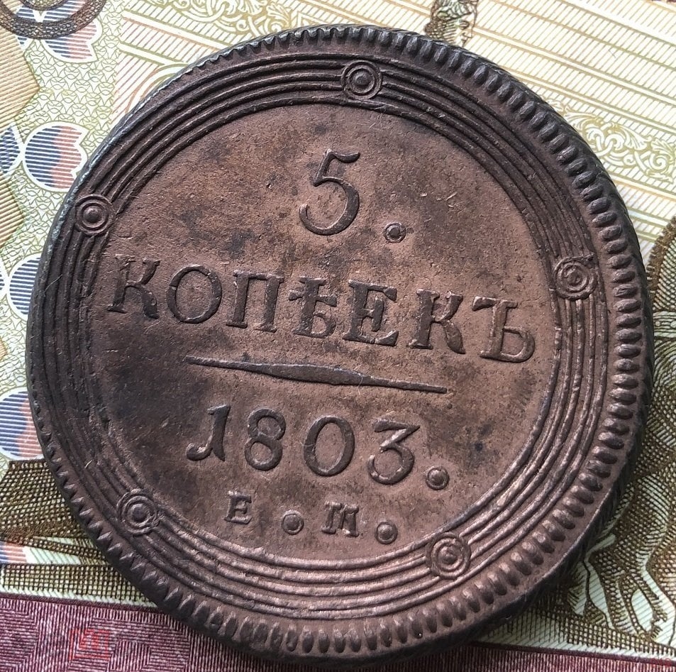 Монета представляет собой копию медных 5 копеек 1803 года, отчеканенных на Екатеринбургском монетном дворе (знак «ЕМ»). Оригинальные монеты этого типа весили около 51 грамма. Данный экземпляр является фейком, так как автор поста прямо указывает на его поддельность, называет «фуфелом» и отмечает аномально большой вес около 65 грамм, что не соответствует стандартам.