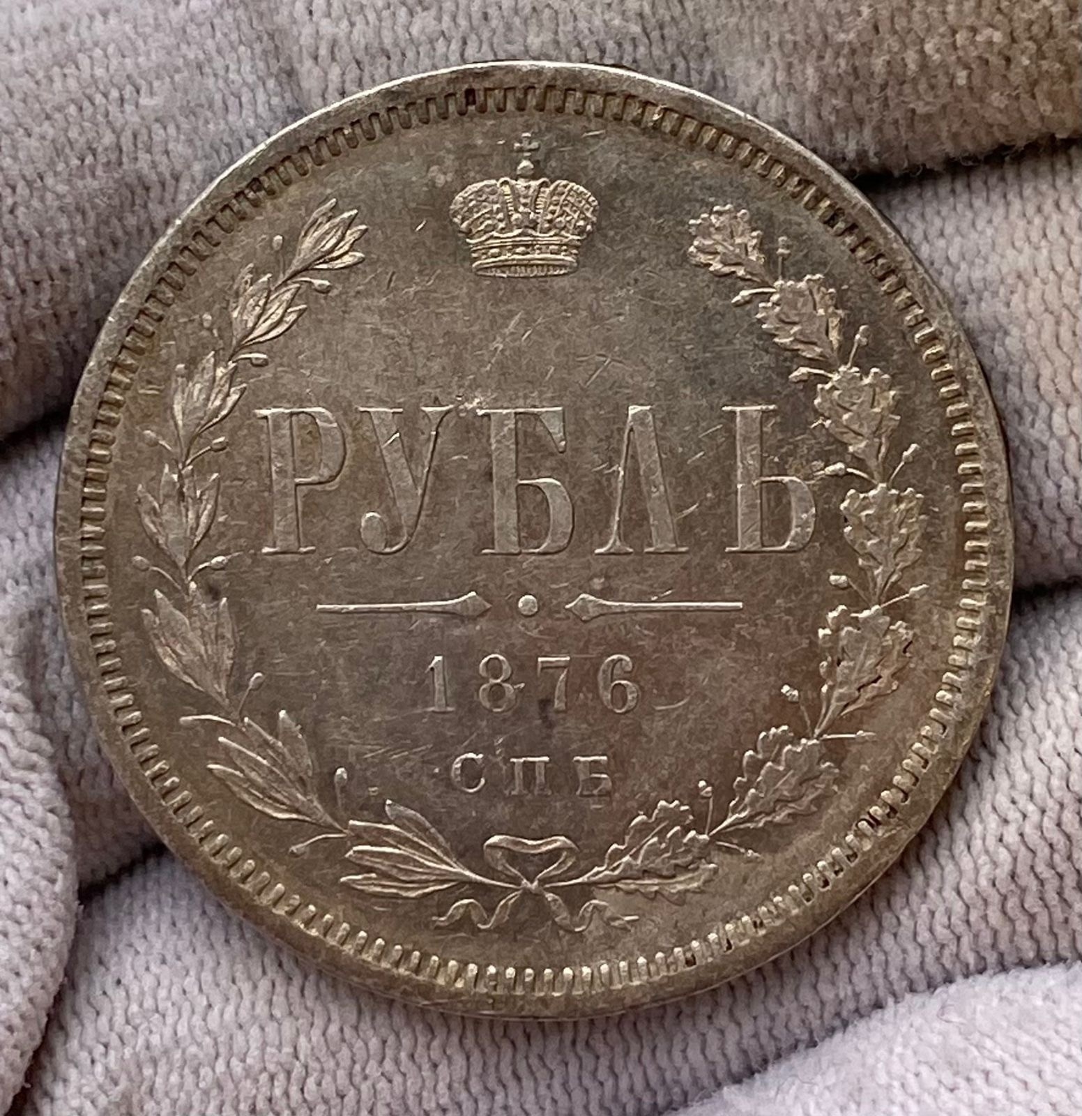 Серебряный рубль 1876 года, отчеканенный в период правления императора Александра II. Монета стандартного образца с портретом монарха и государственным гербом. Комментарии опытных коллекционеров в обсуждении не выявили признаков подделки, монета признана оригинальной.
