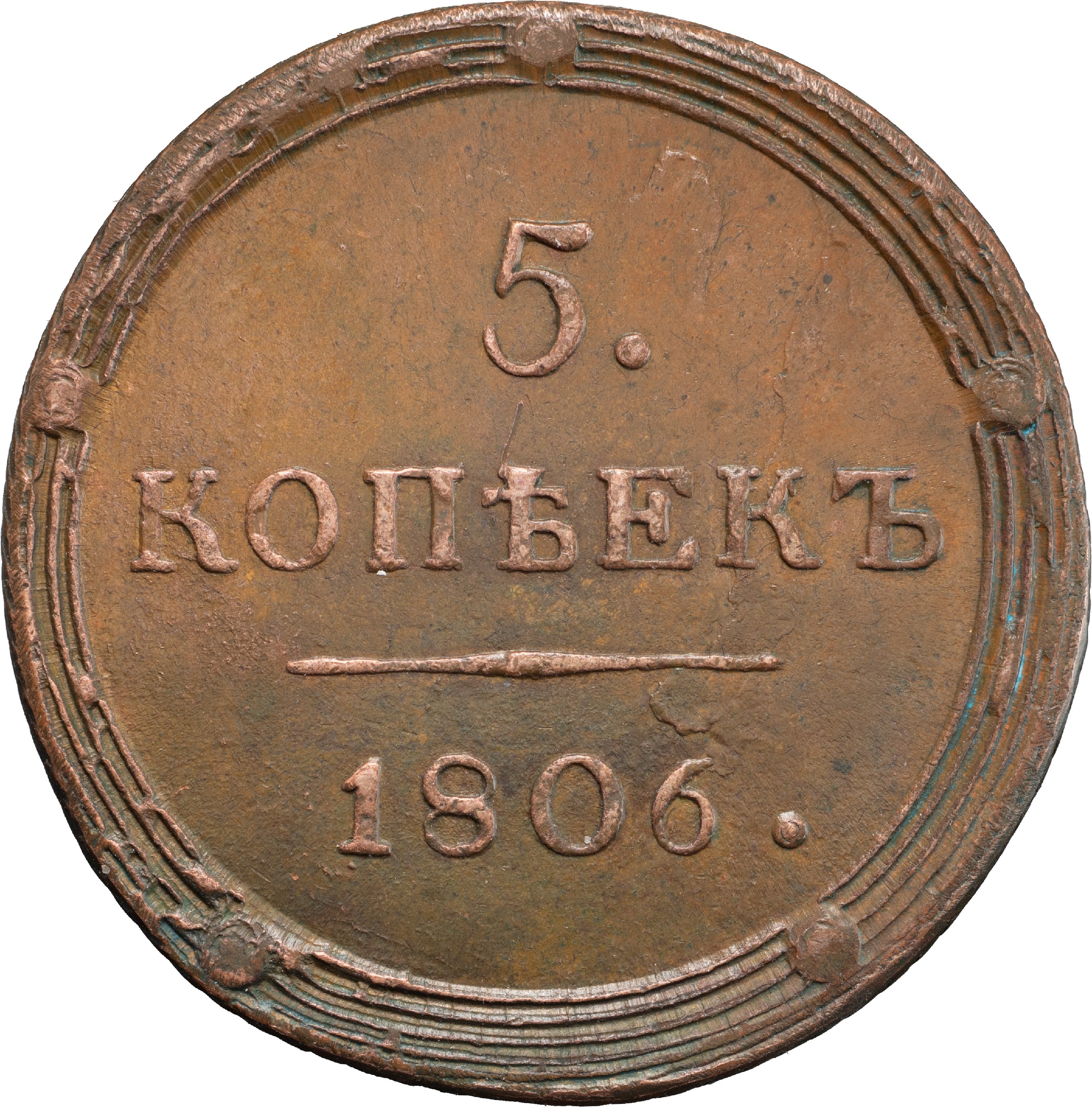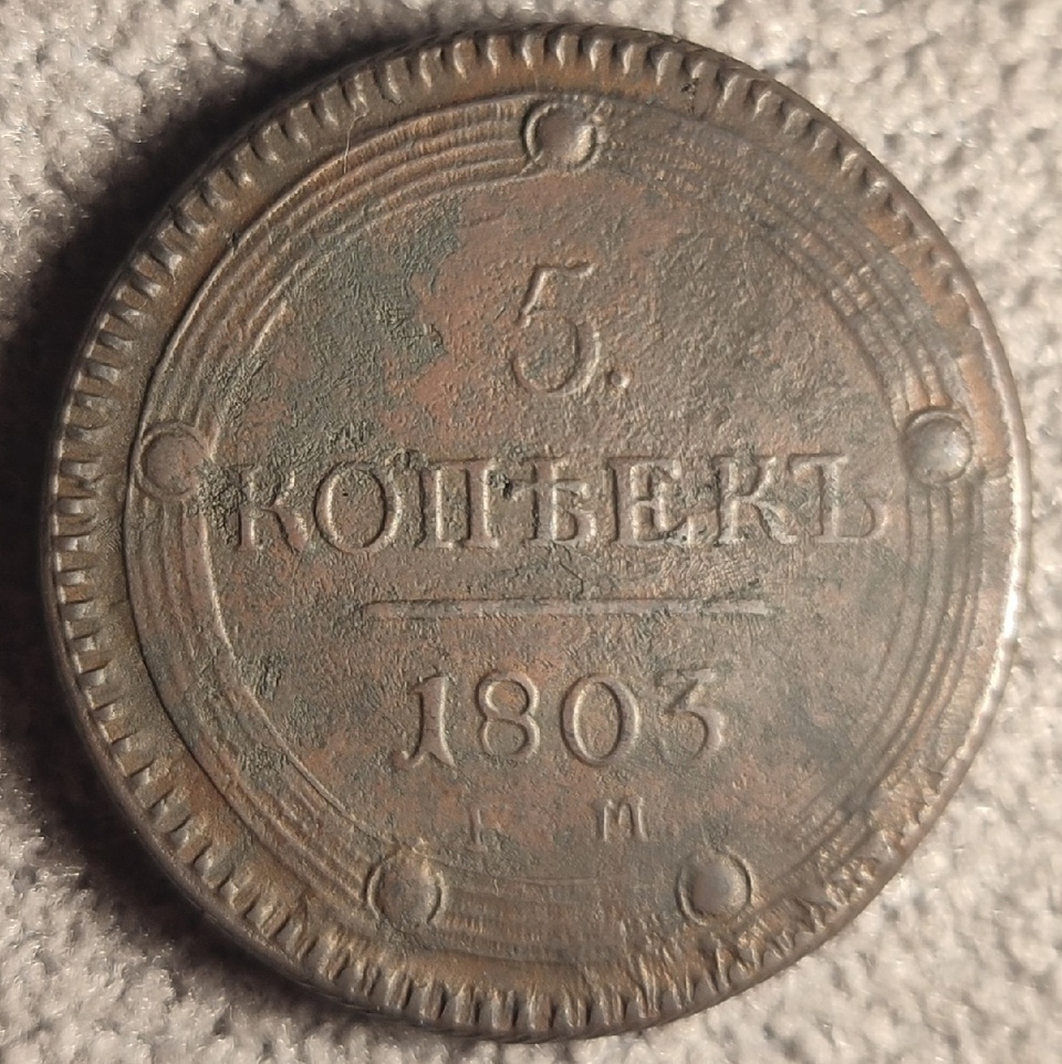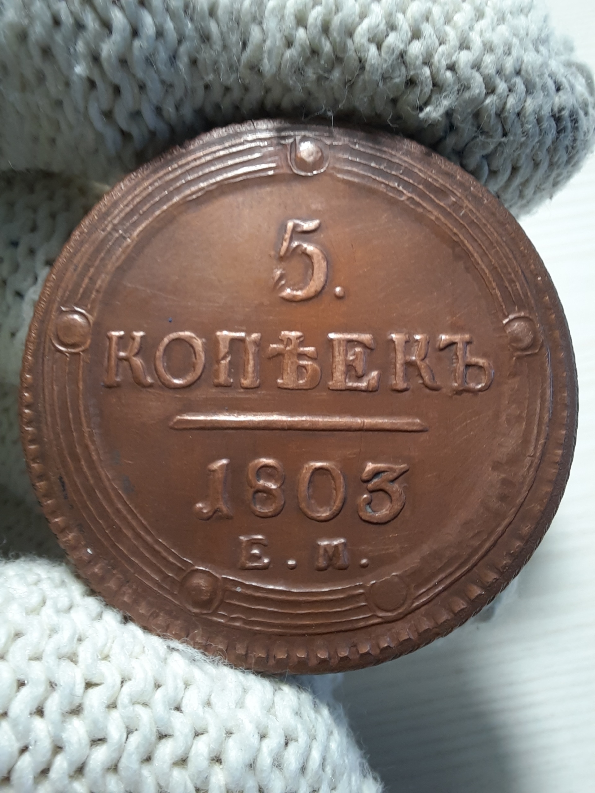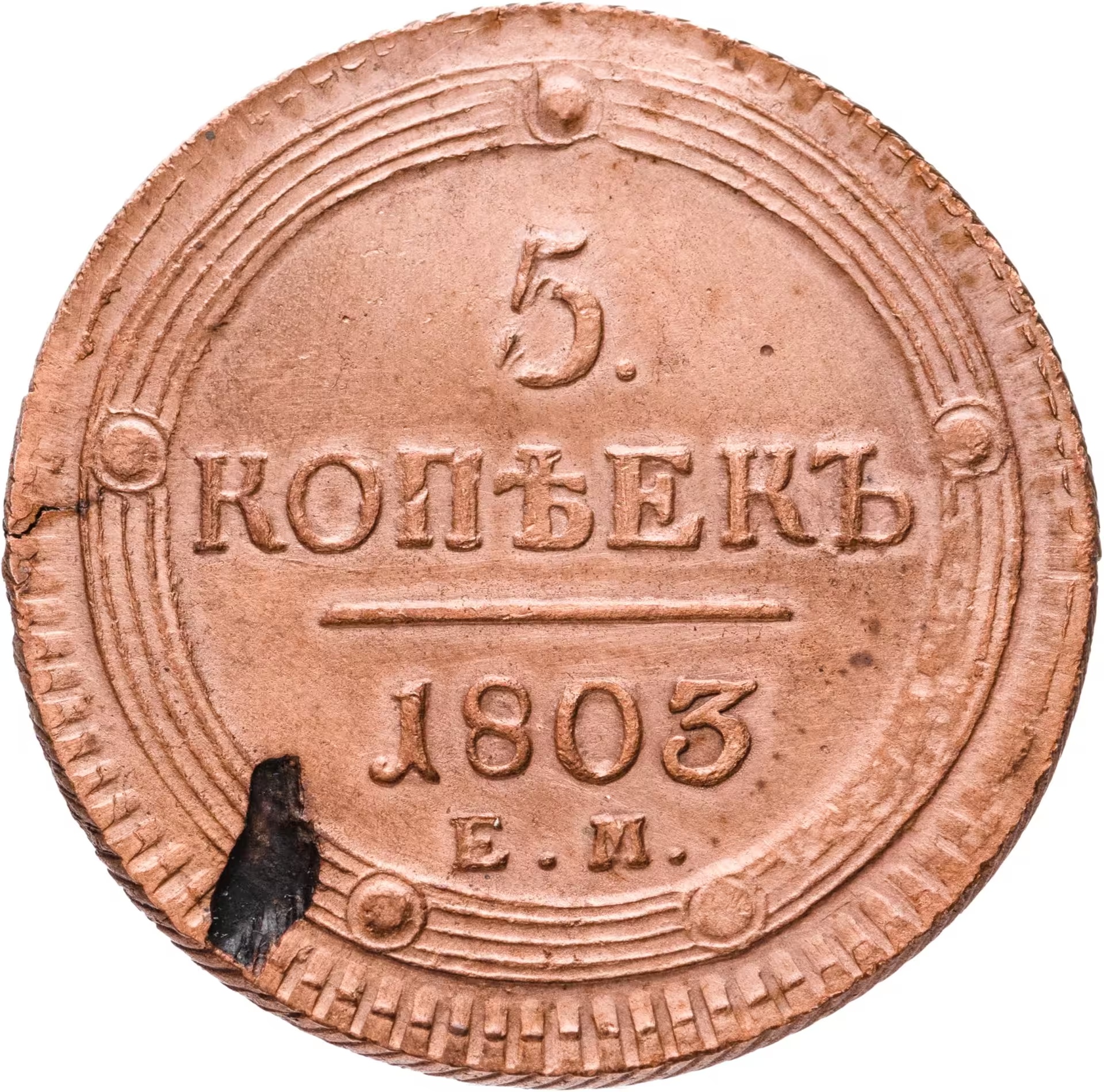 Медная монета номиналом 5 копеек 1803 года, отчеканенная на Екатеринбургском монетном дворе (обозначение «ЕМ»). Выпущена в период правления императора Александра I. Комментарии опытных коллекционеров не выявили признаков подделки, монета признана подлинной. Особый интерес представляет использование штемпеля орла 1802 года, что является известным вариантом для этого года.