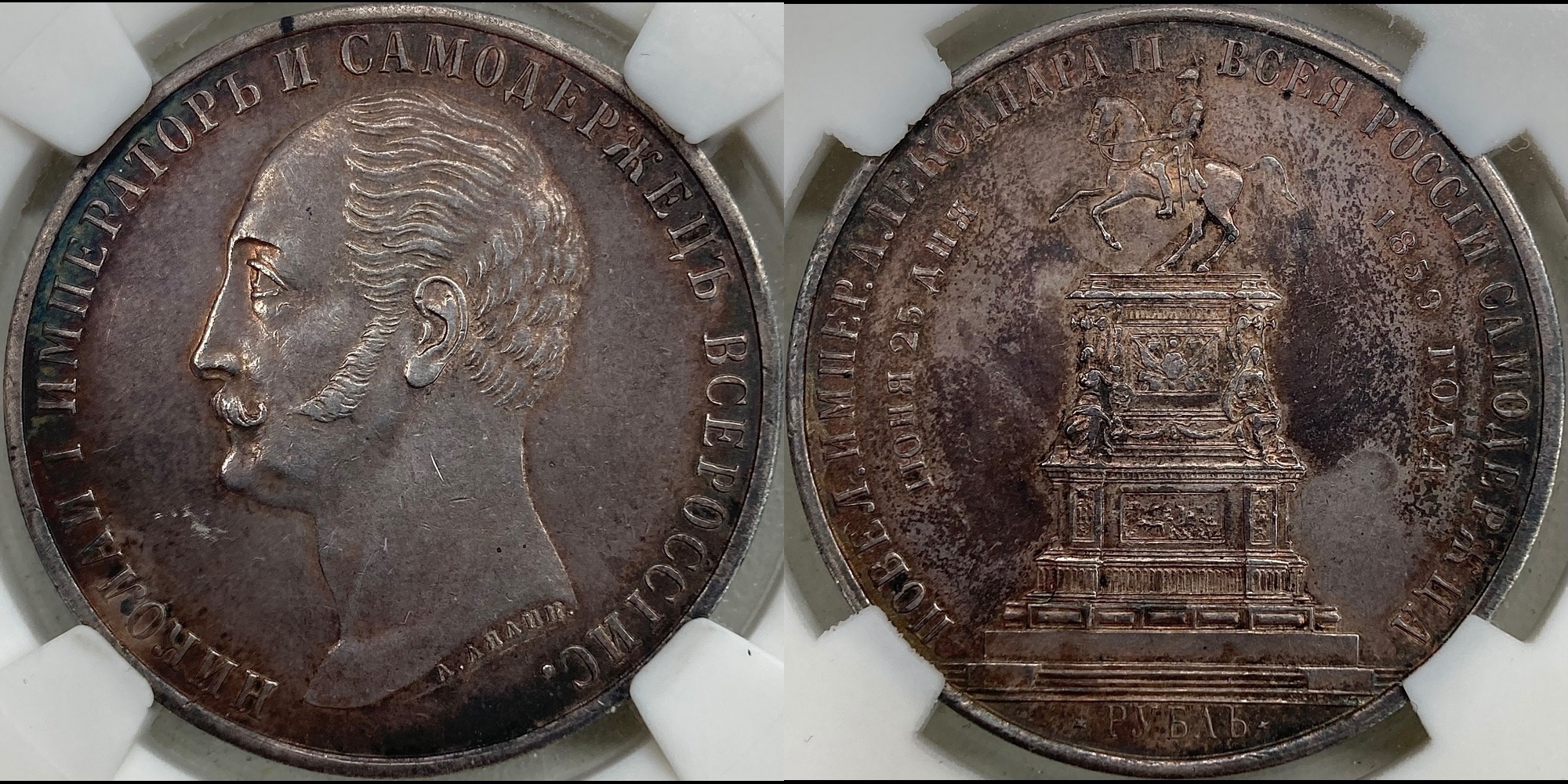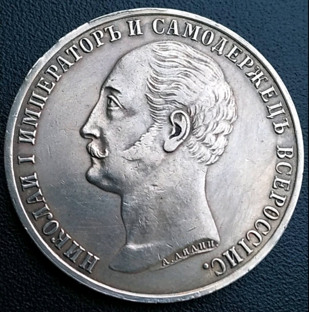 Монета представляет собой копию серебряного рубля 1859 года (так называемого «Коня») периода правления Александра II. Оригинальные монеты этого типа чеканились на Санкт-Петербургском монетном дворе и имеют высокий коллекционный интерес. В данном случае, как указано в посте, это откровенная подделка, созданная для обмана начинающих нумизматов.