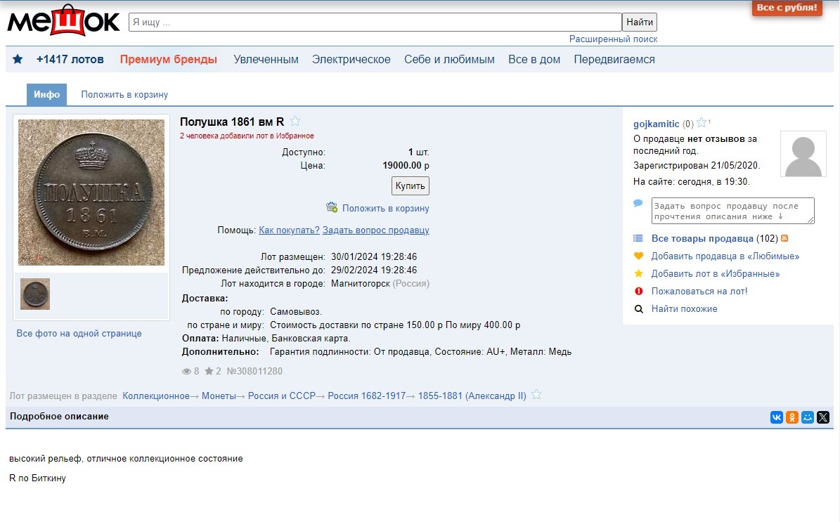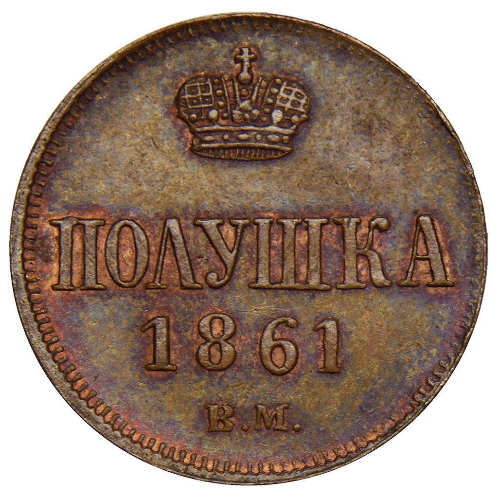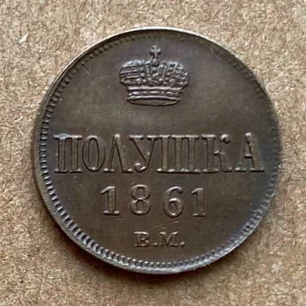 Представленная монета — медная полушка 1861 года, отчеканенная в правление Александра II. Владелец изначально пытался вернуть её как подделку, но в итоге решил продать. Монета является фейком, о чём прямо указано в посте и подтверждено комментаторами.