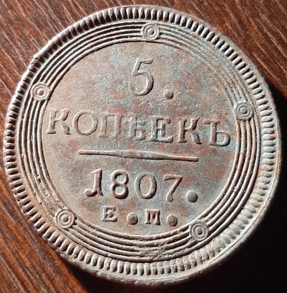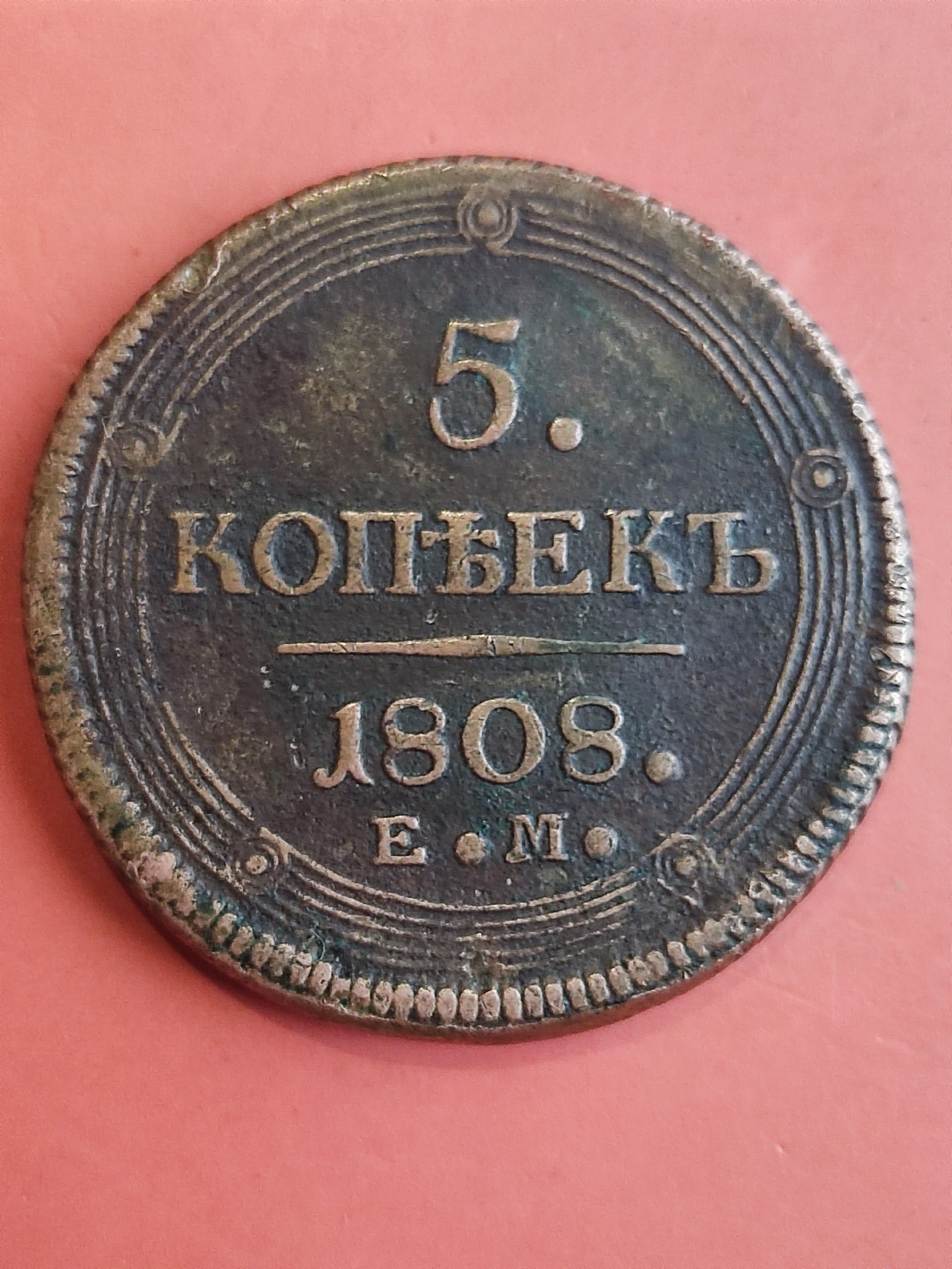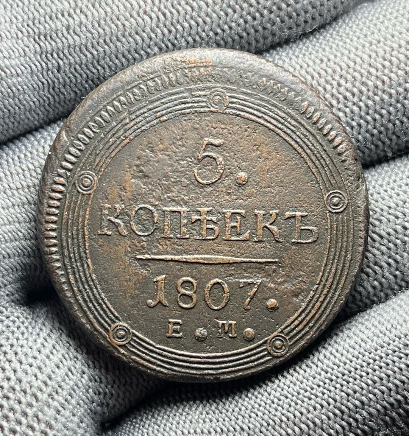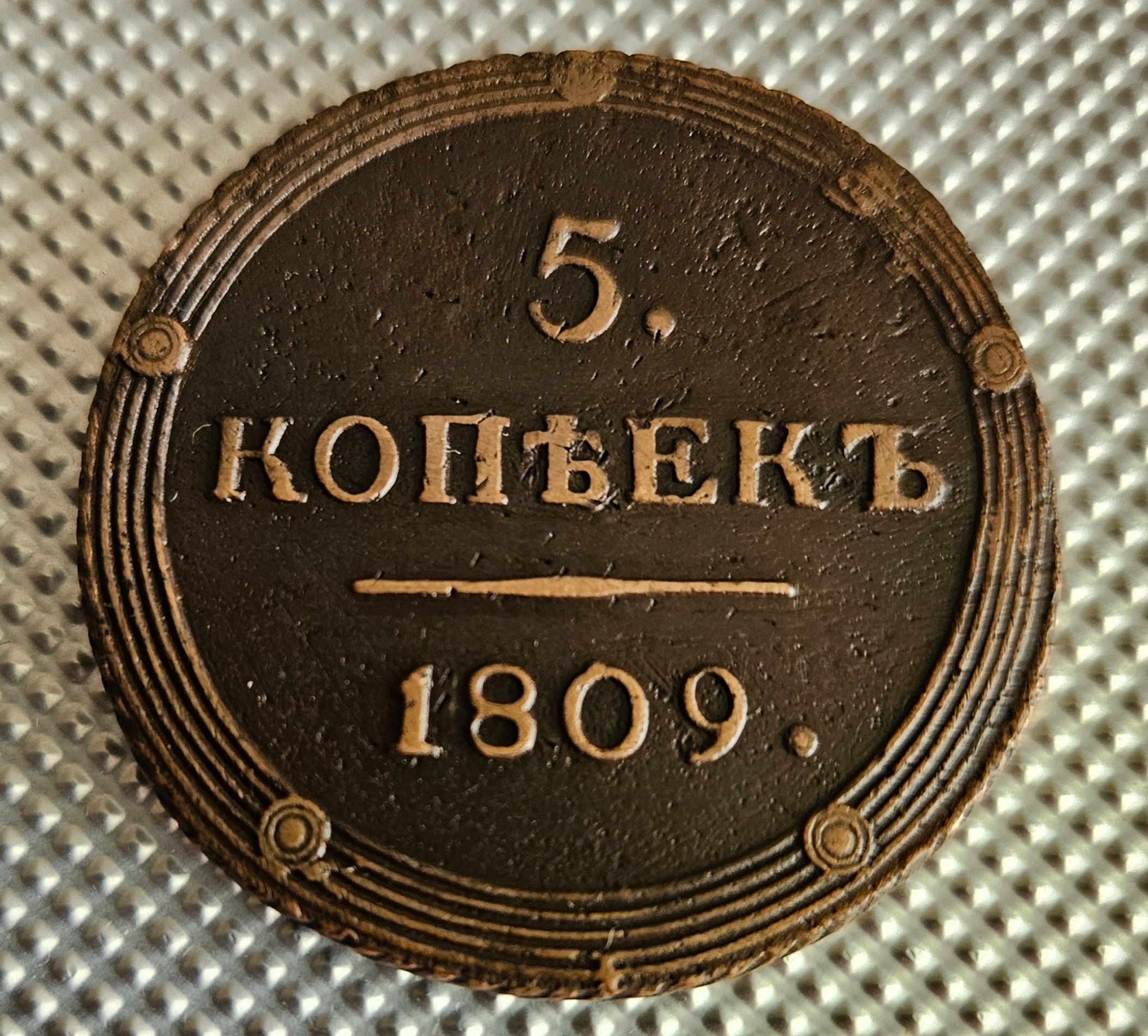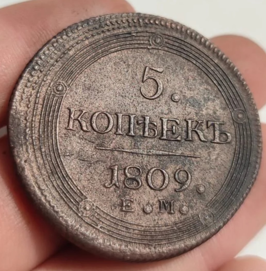 Монета представляет собой копию медных 5 копеек периода правления Александра I, отчеканенных на Екатеринбургском монетном дворе (обозначение «ЕМ»). Оригинальные монеты этого типа чеканились крупными тиражами и являются массовыми. Данный экземпляр является заведомой репликой, о чём прямо указано в описании поста.