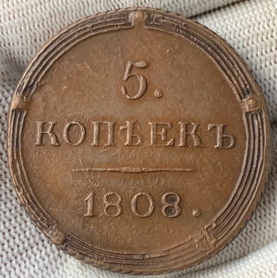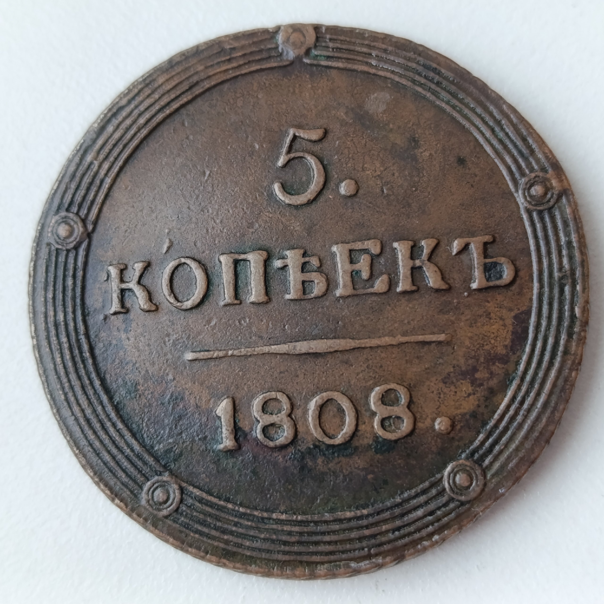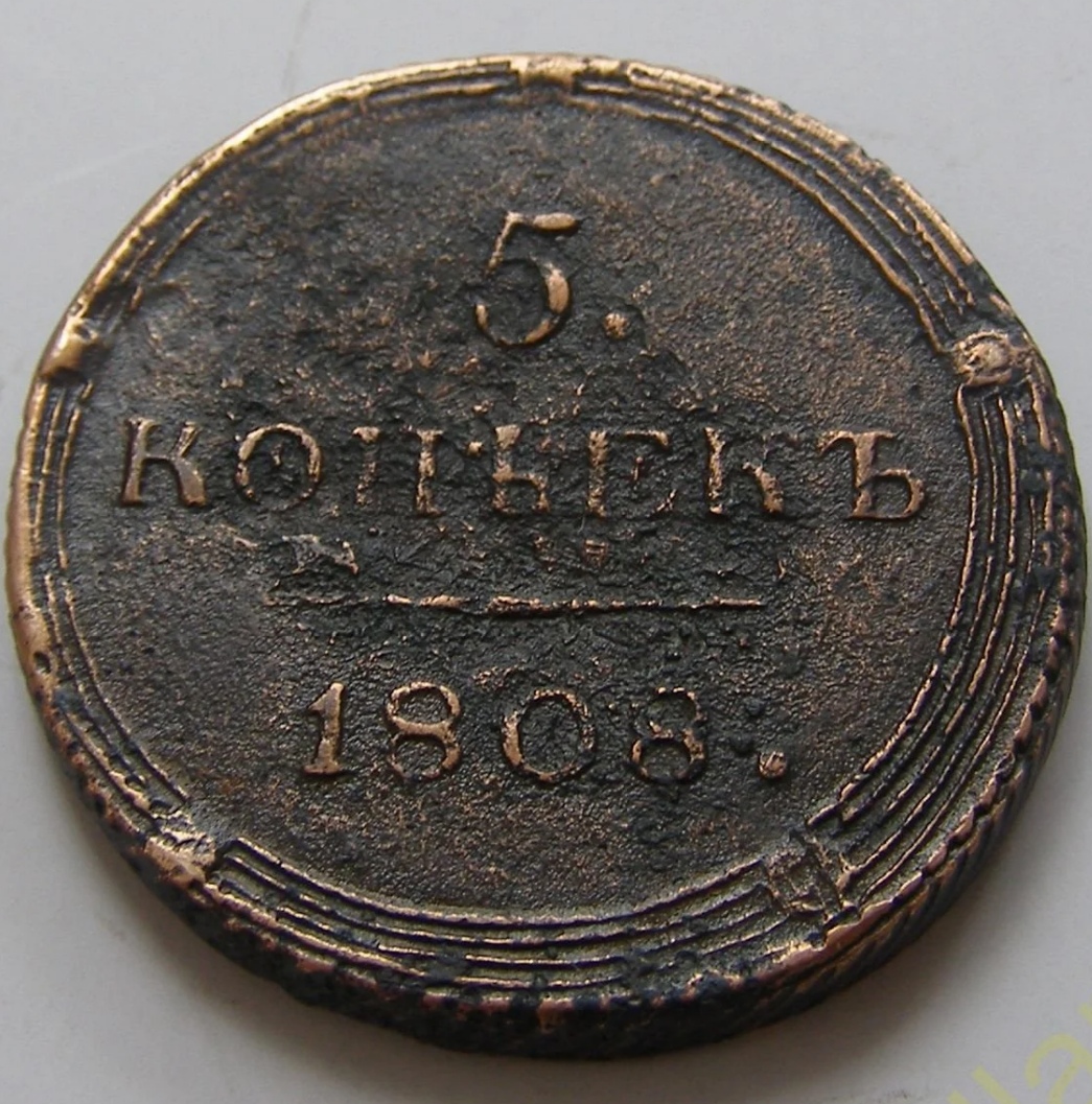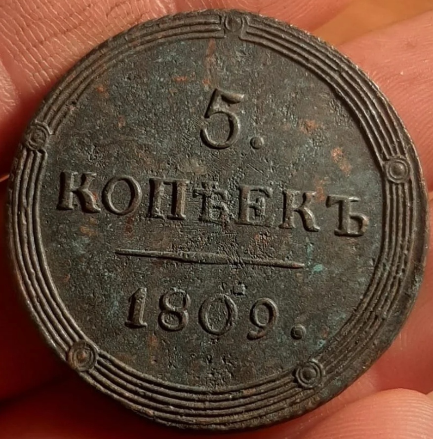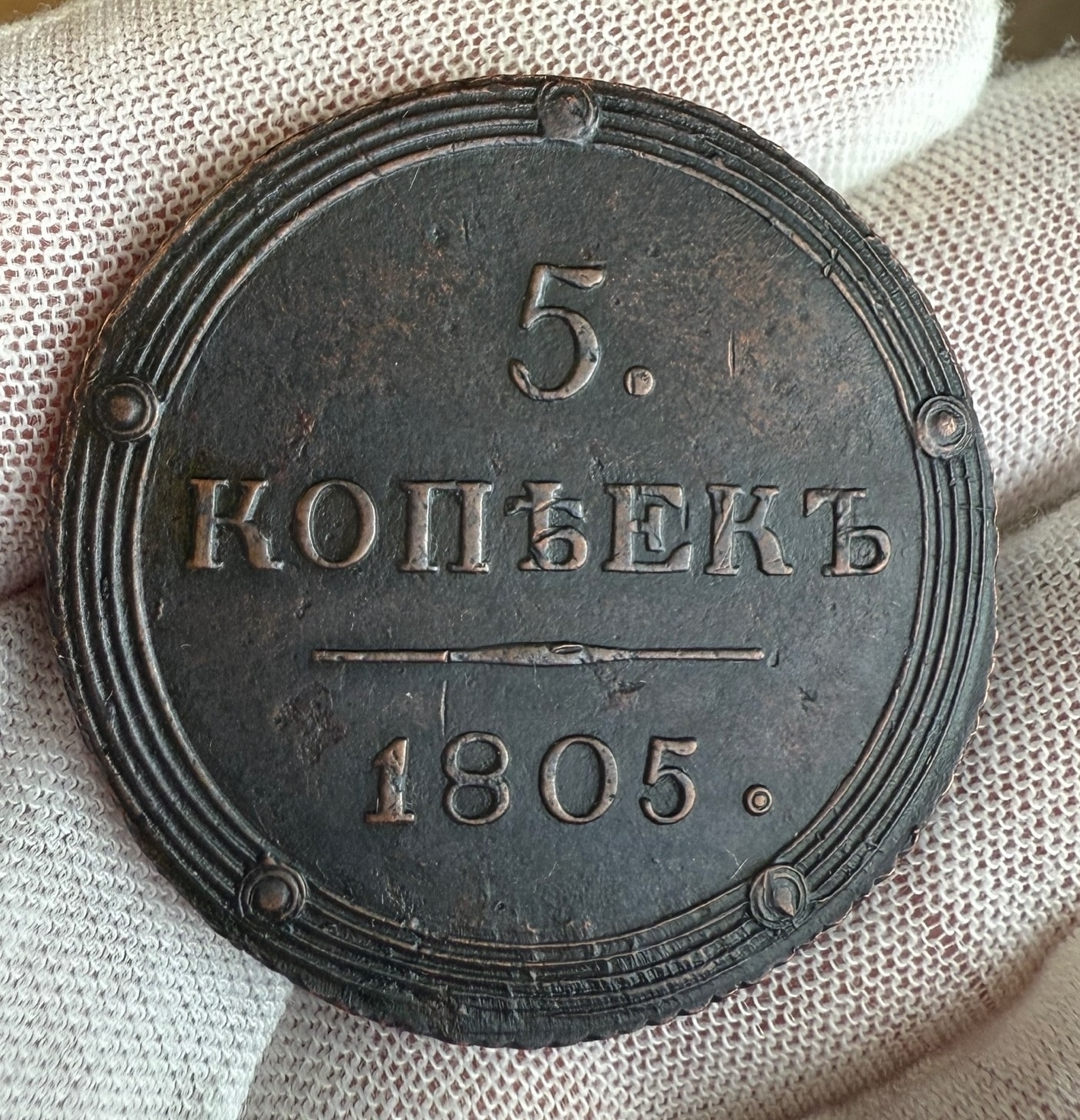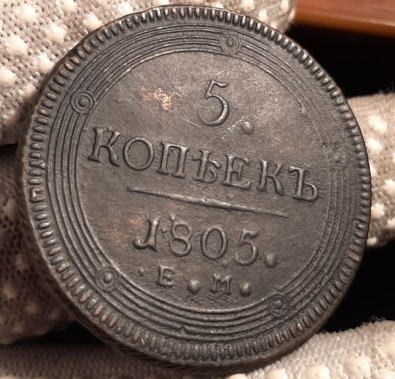 Монета представляет собой копию медных 5 копеек периода правления Александра I, отчеканенных на Екатеринбургском монетном дворе (обозначение «ЕМ»). Оригинальные монеты этого типа чеканились крупными тиражами и являются массовыми. Данный экземпляр является заведомой репликой, о чём прямо указано в описании поста.