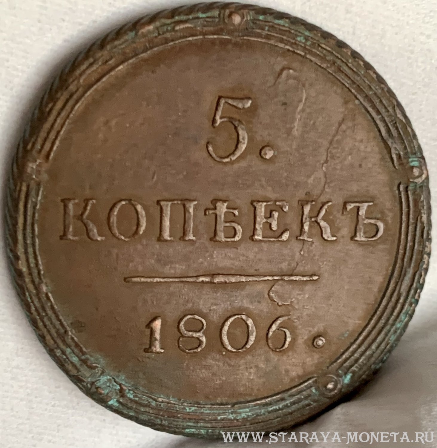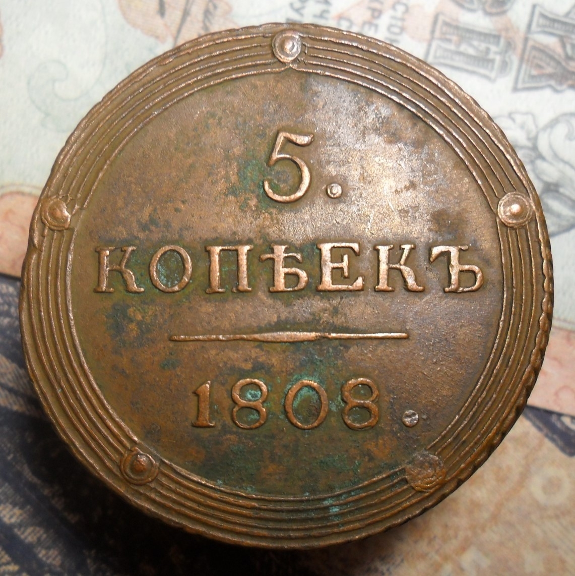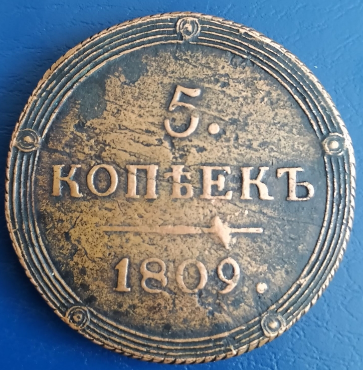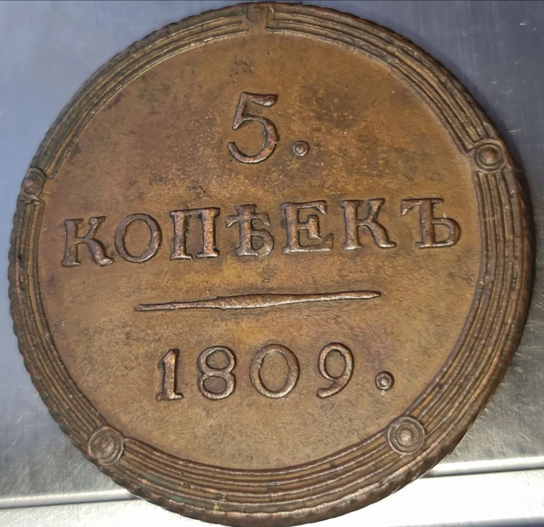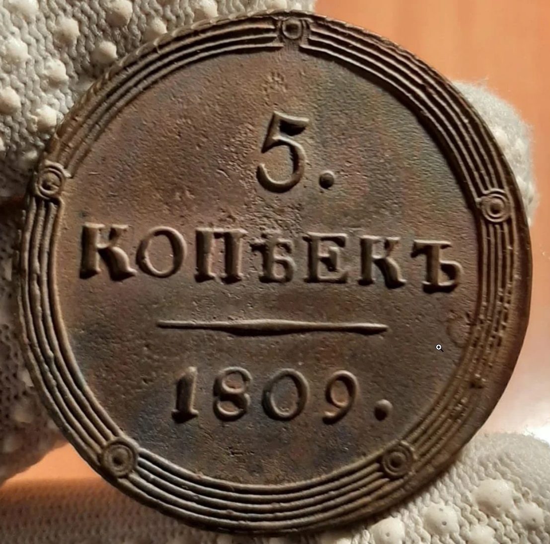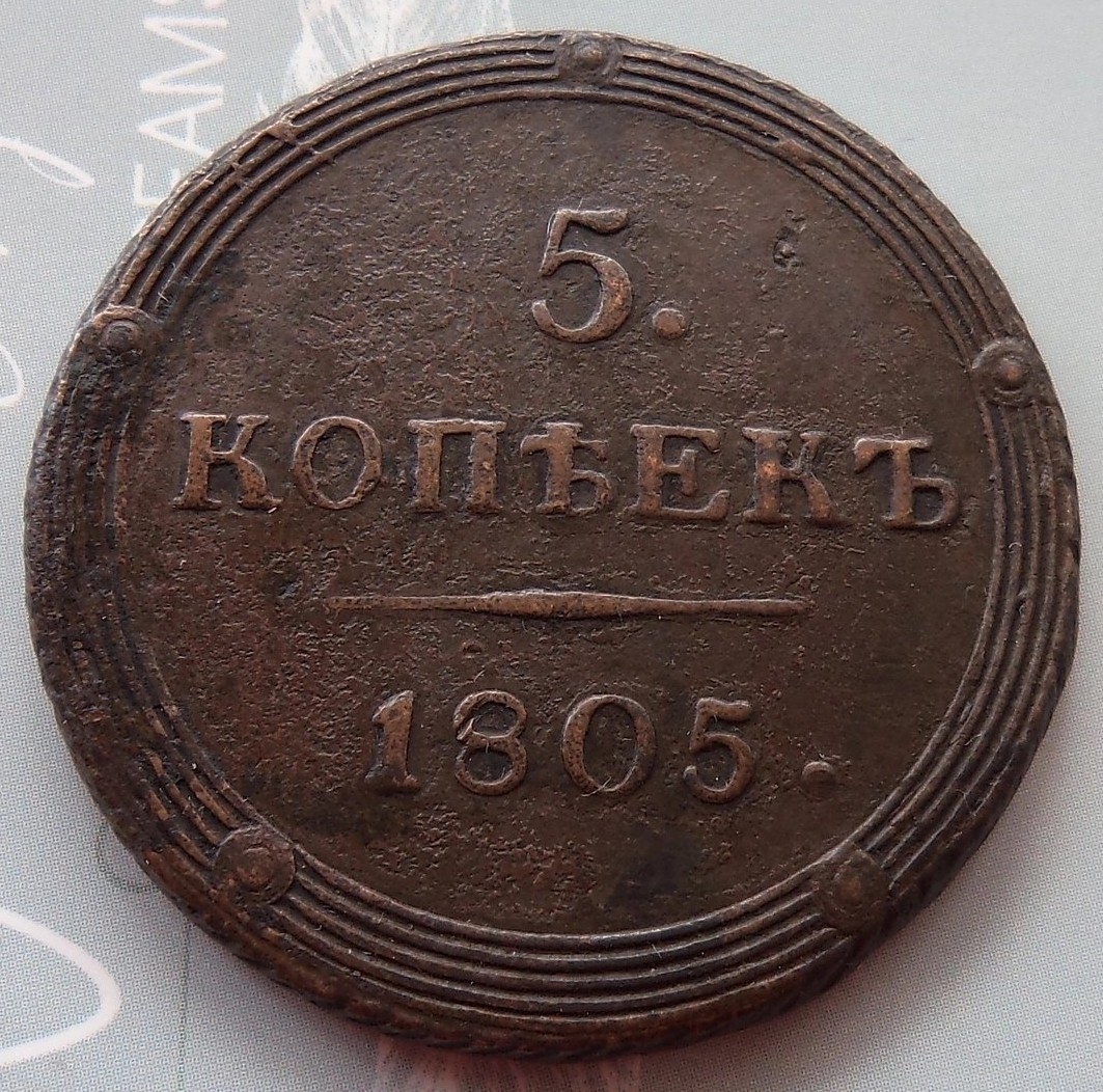 Монета представляет собой копию медных 5 копеек периода правления Александра I, отчеканенных на Екатеринбургском монетном дворе (обозначение «ЕМ»). Оригинальные монеты этого типа чеканились крупными тиражами и являются массовыми. Данный экземпляр является заведомой репликой, о чём прямо указано в описании поста.