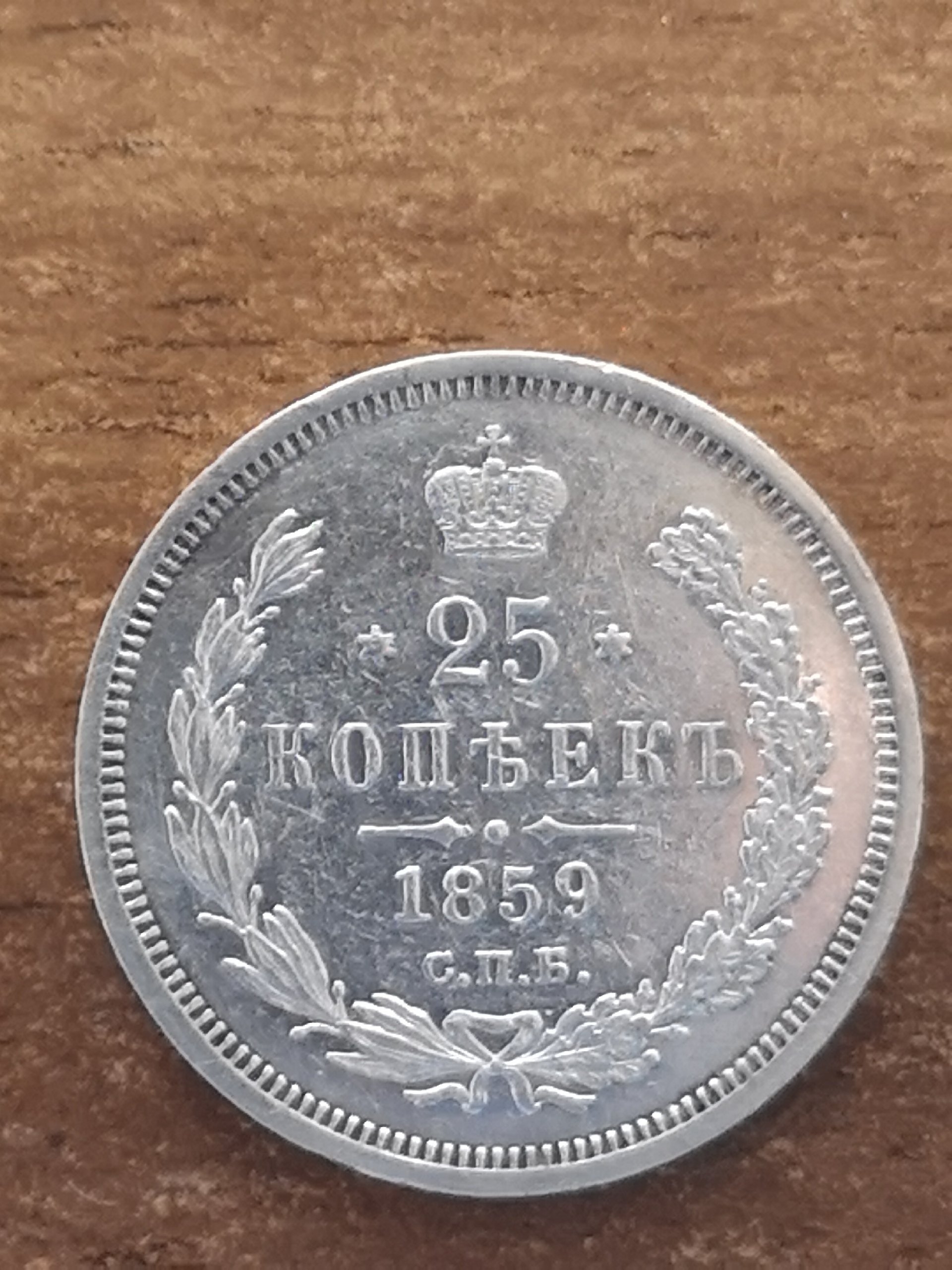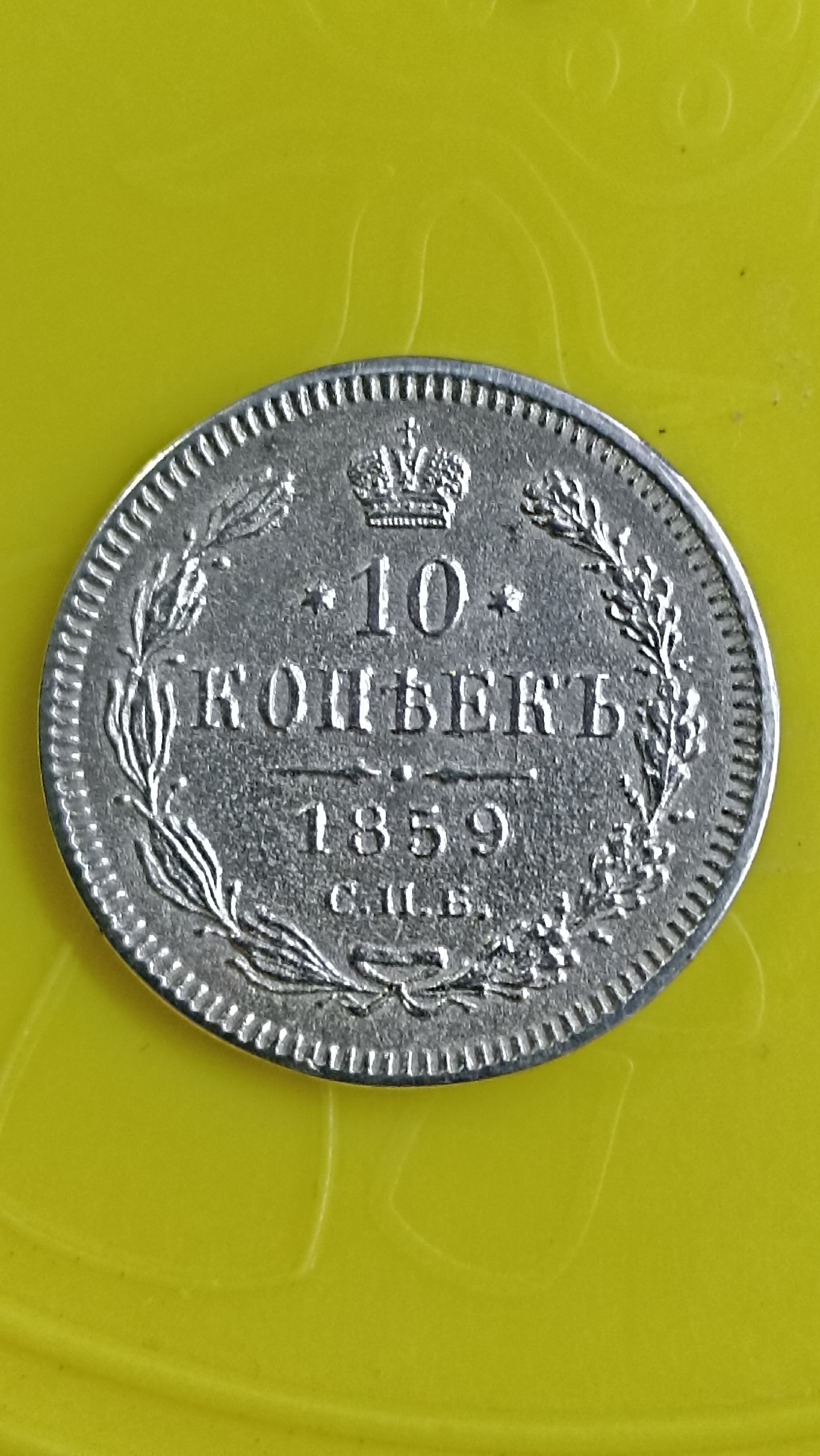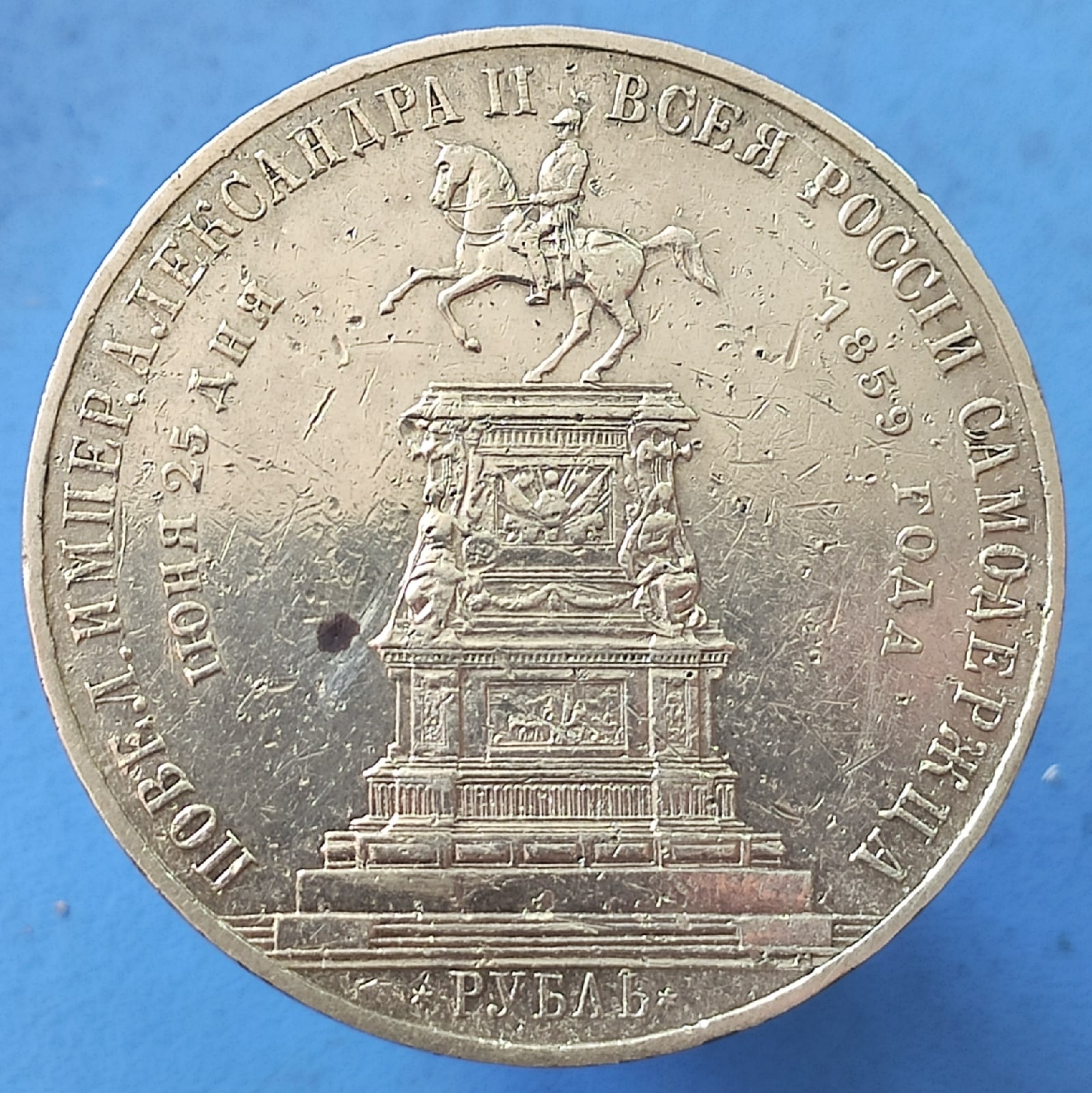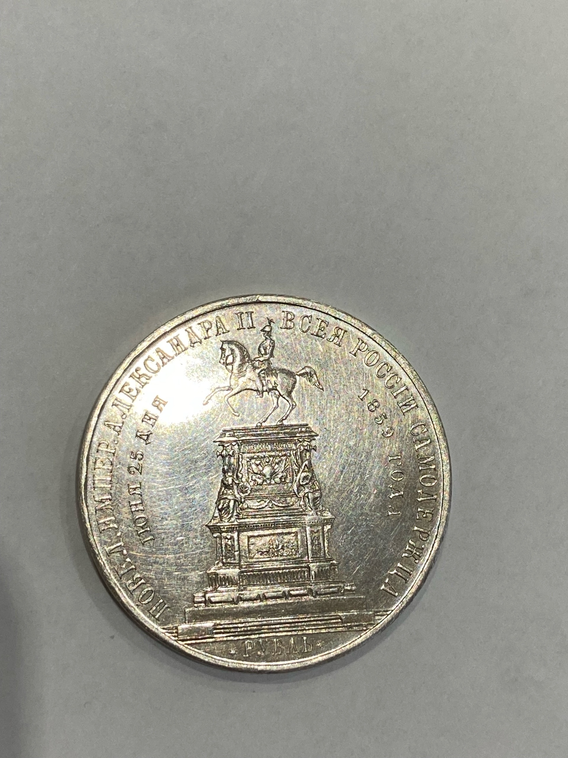 Монета представляет собой подделку серебряного рубля 1859 года, отчеканенного в период правления Александра II. Судя по консенсусу в комментариях, это современная копия низкого качества, вероятно, литая или сувенирного производства. Отсутствие чётких деталей и характерный вид «нового чекана» указывают на фейк, не имеющий коллекционной ценности.