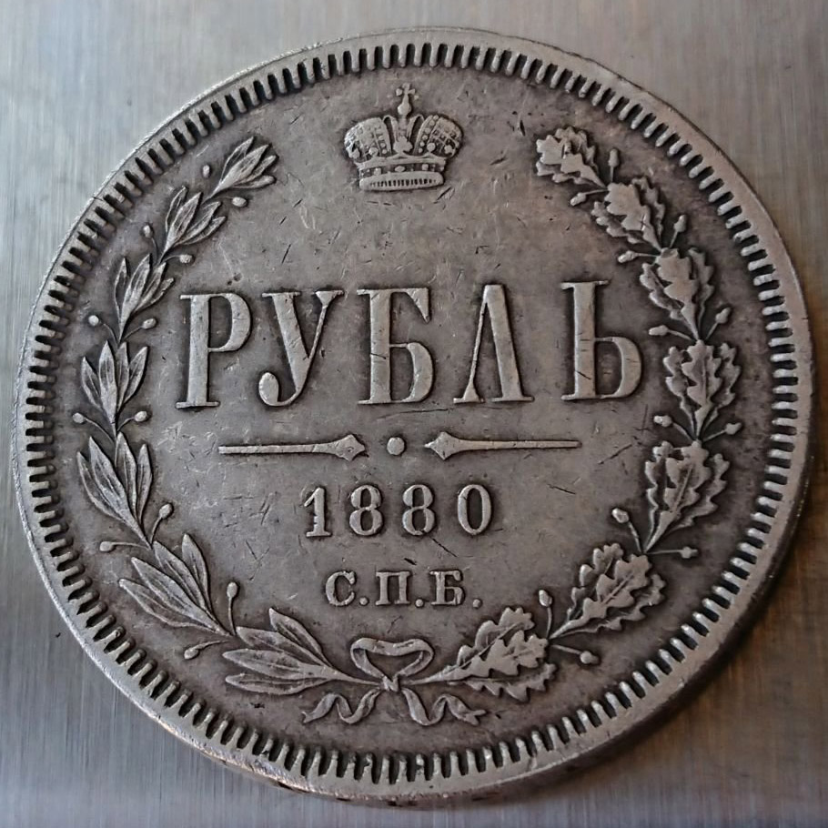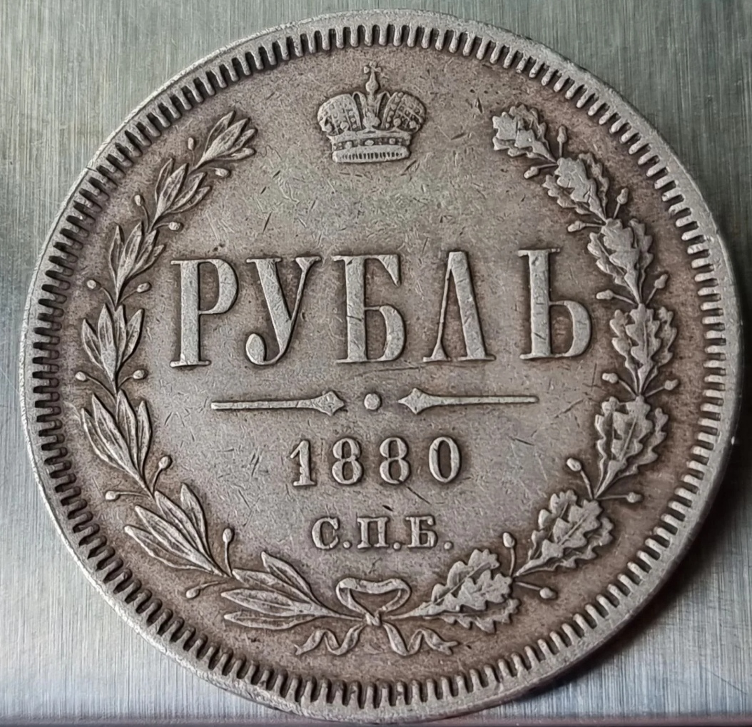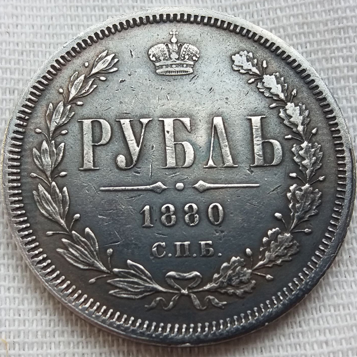 Монета представляет собой копию серебряного рубля 1880 года, отчеканенного при императоре Александре II на Санкт-Петербургском монетном дворе (обозначение СПБ). Оригинальные рубли этого периода имеют высокую коллекционную ценность. В данном случае автор поста прямо указал, что это копия, что подтверждает её неоригинальное происхождение.