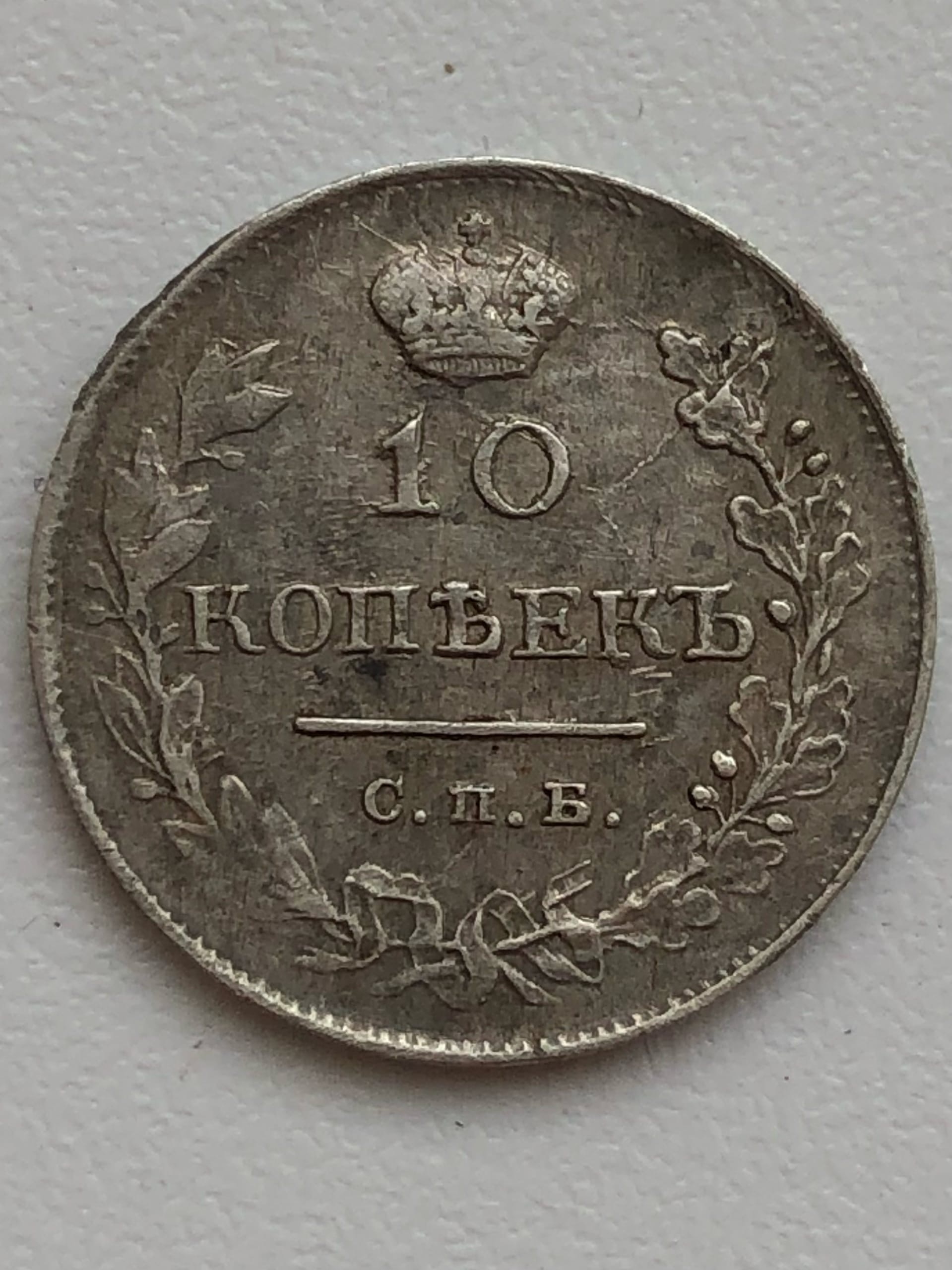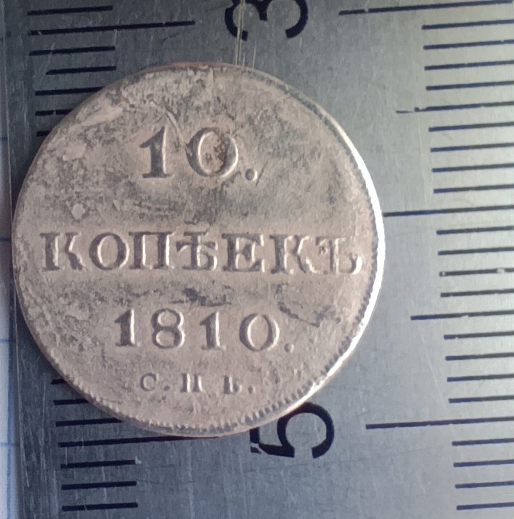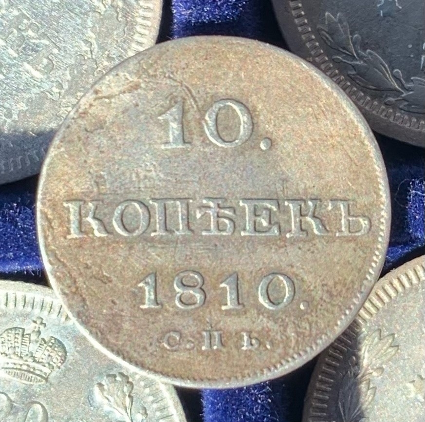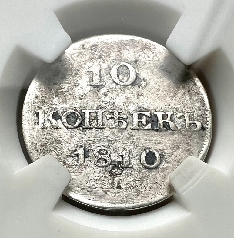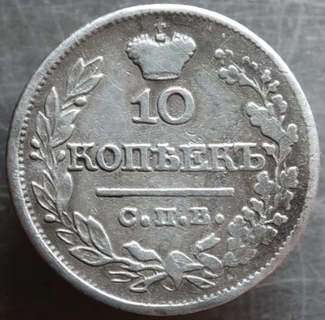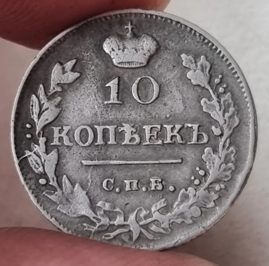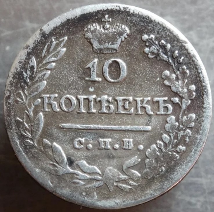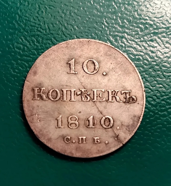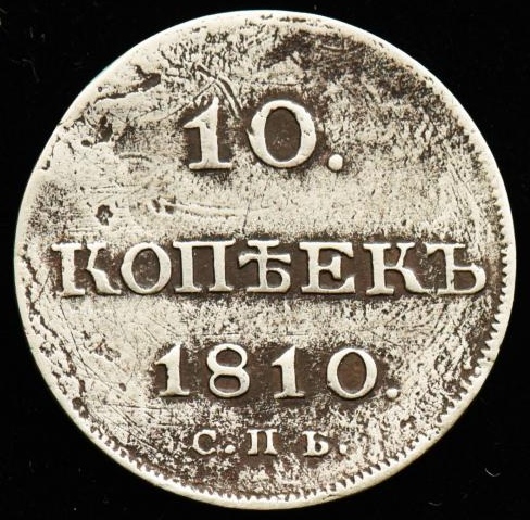 Монета номиналом 10 копеек периода правления Александра I, отчеканенная на Санкт-Петербургском монетном дворе (обозначение «СПБ»). Несмотря на качественное исполнение, признана опытными нумизматами фейком. Это современная подделка, искусственно состаренная, с несоответствующими оригиналу признаками износа.