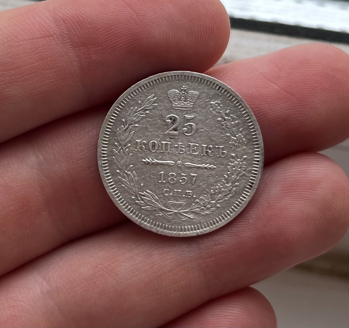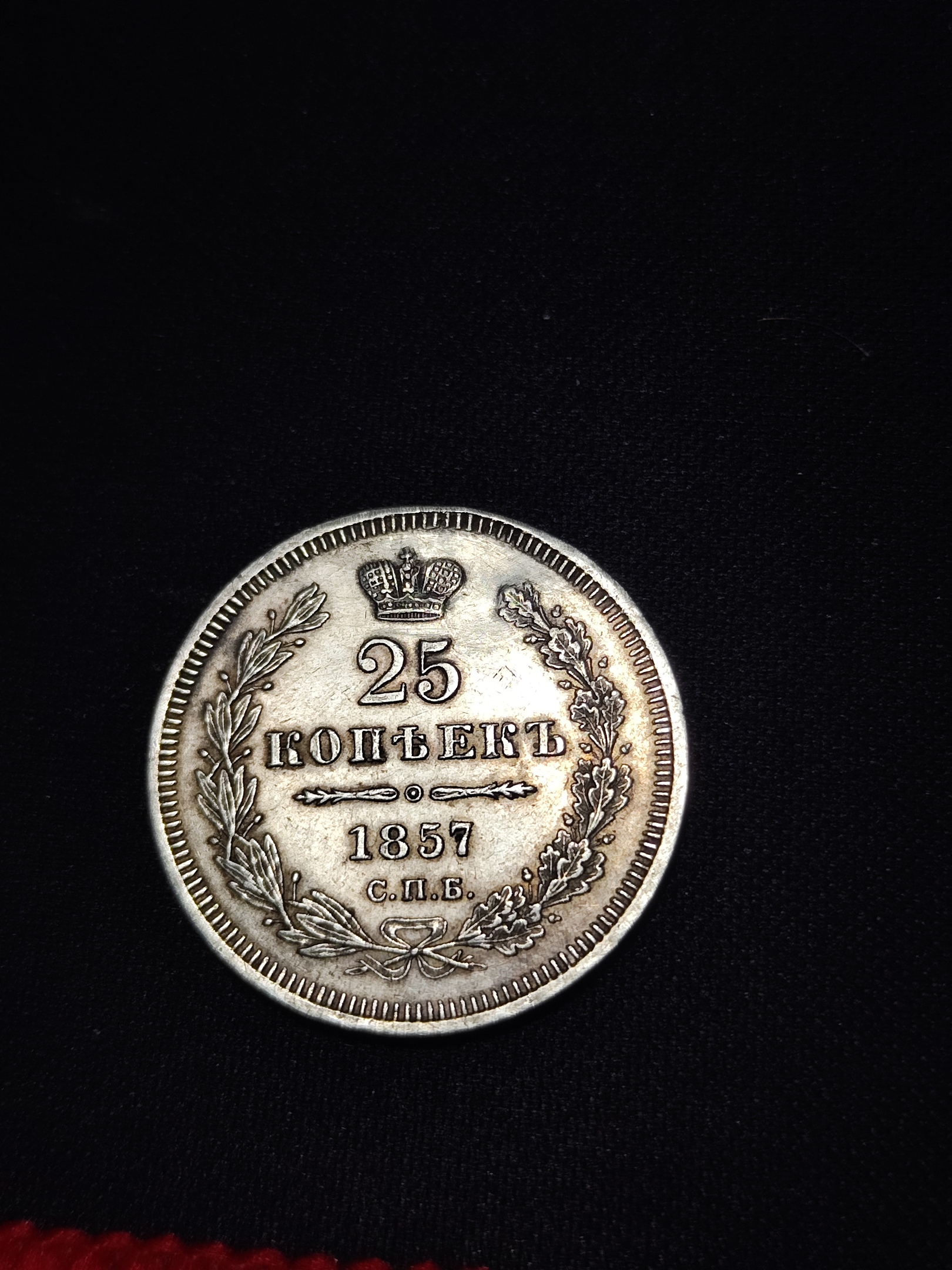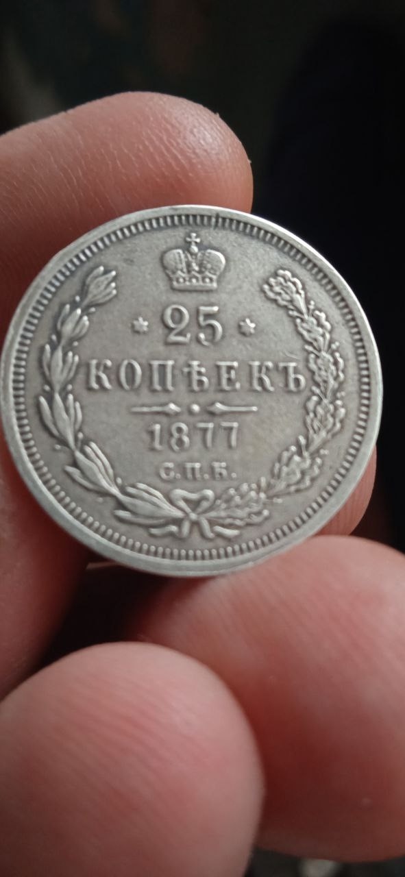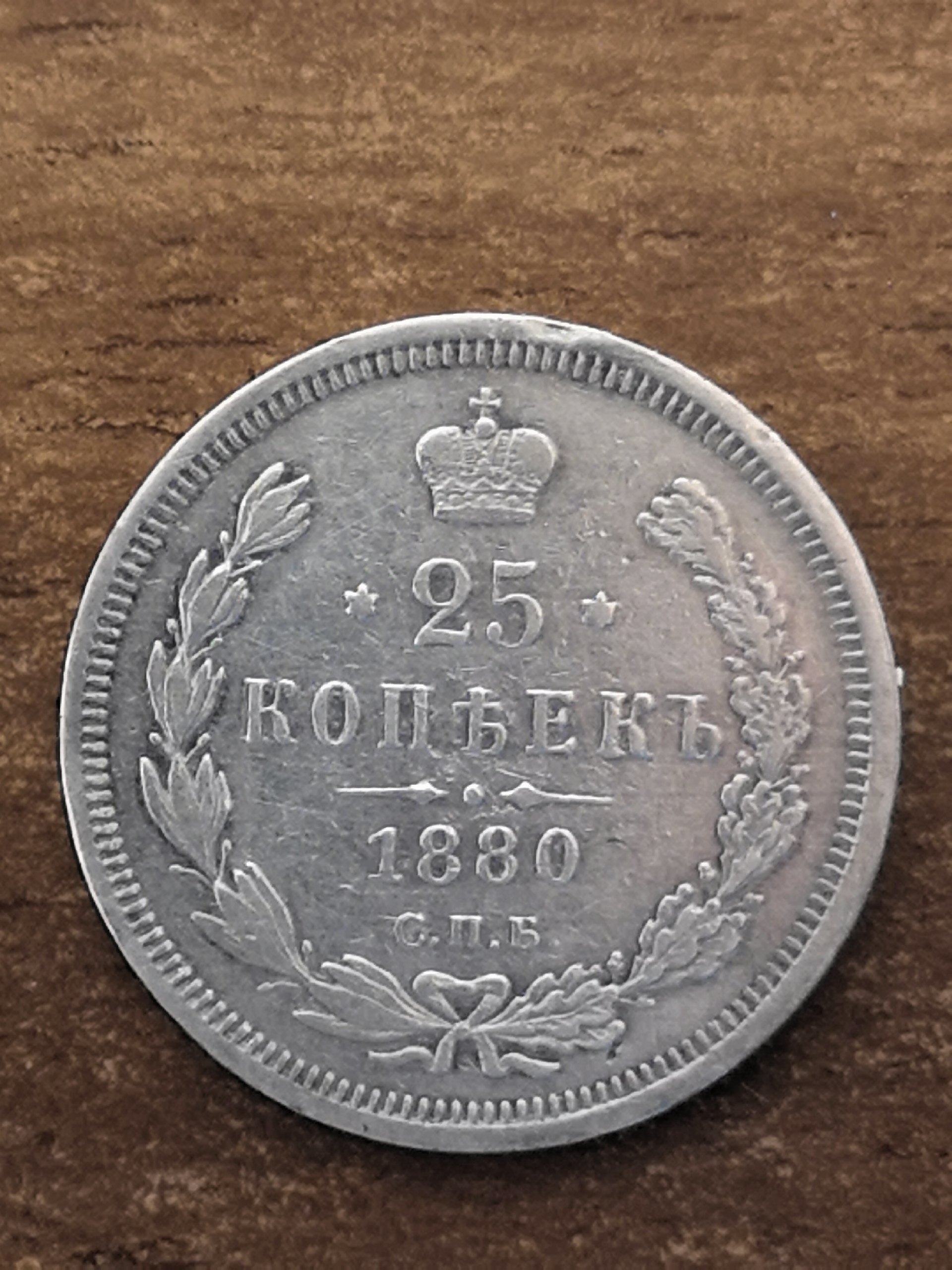 Серебряная монета номиналом 25 копеек 1880 года, отчеканенная на Санкт-Петербургском монетном дворе (обозначение СПБ). Монета периода правления императора Александра II. Инициалы минцмейстера Николая Фоллендорфа (НФ) указывают на её подлинность. Судя по консенсусу в комментариях, это оригинальная и довольно редкая монета.