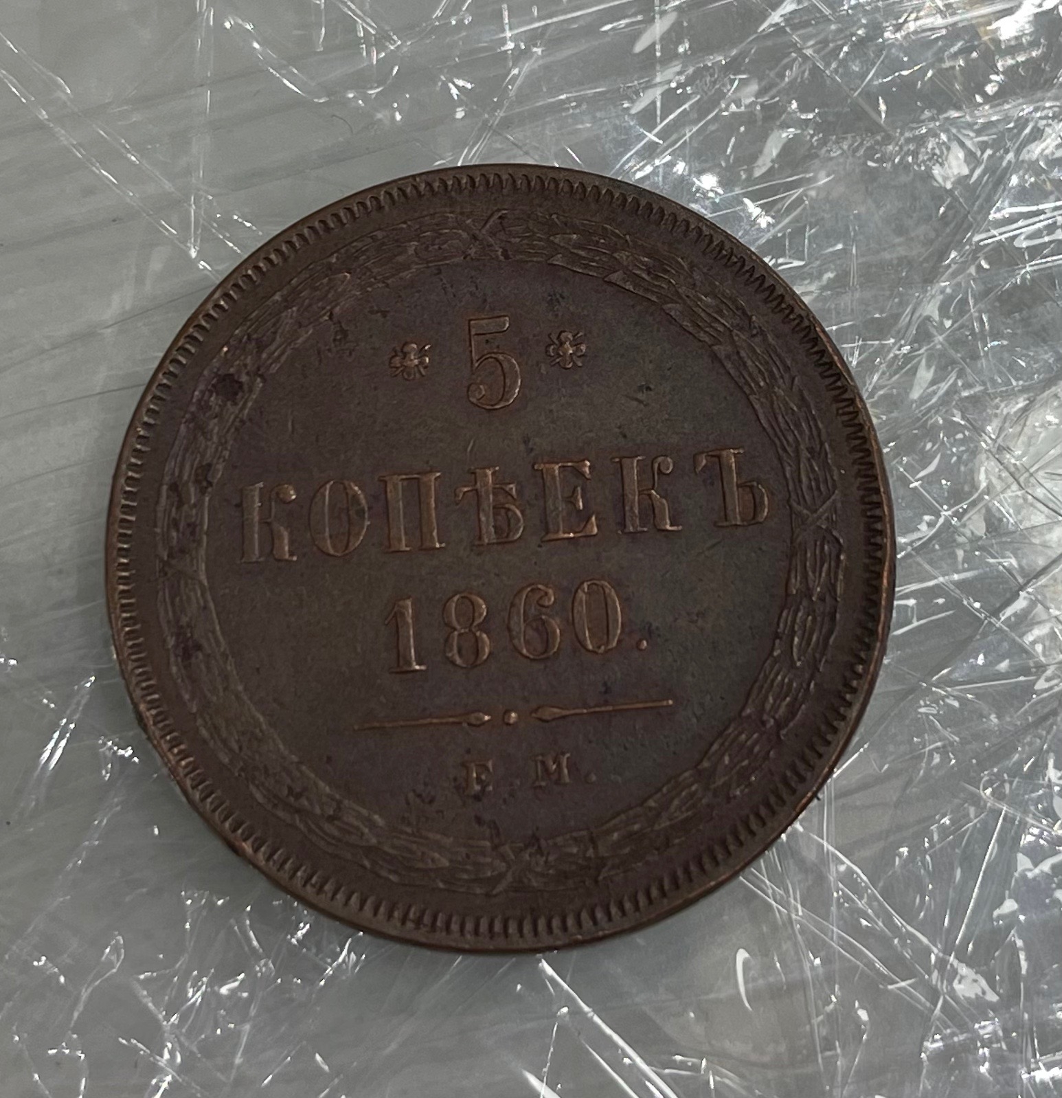 Медная монета номиналом 5 копеек, отчеканенная в 1860 году в период правления императора Александра II. Монета имеет стандартный для этого периода дизайн с двуглавым орлом и обозначением номинала. Судя по консенсусу в комментариях, монета является подлинной, без явных признаков подделки.