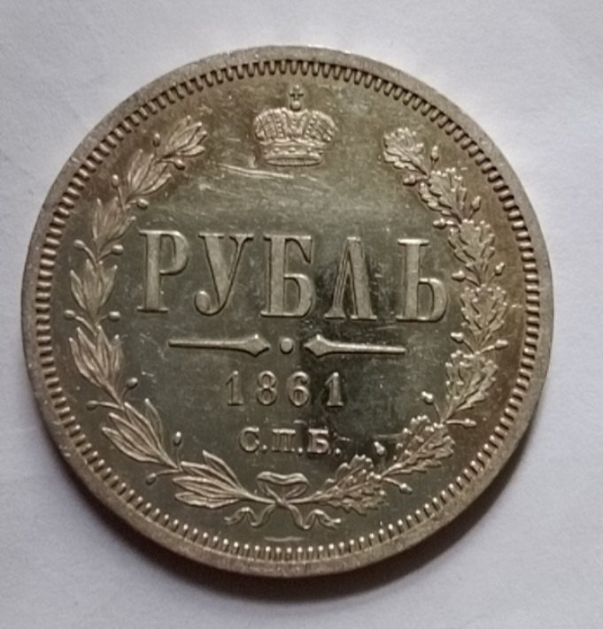 Серебряный рубль 1861 года, отчеканенный в правление императора Александра II. Монета является редким и ценным нумизматическим памятником, особенно в высокой степени сохранности. На основе консенсуса экспертов в комментариях, монета признана подлинной, хотя некоторые детали гурта и цифр года вызвали профессиональную дискуссию.