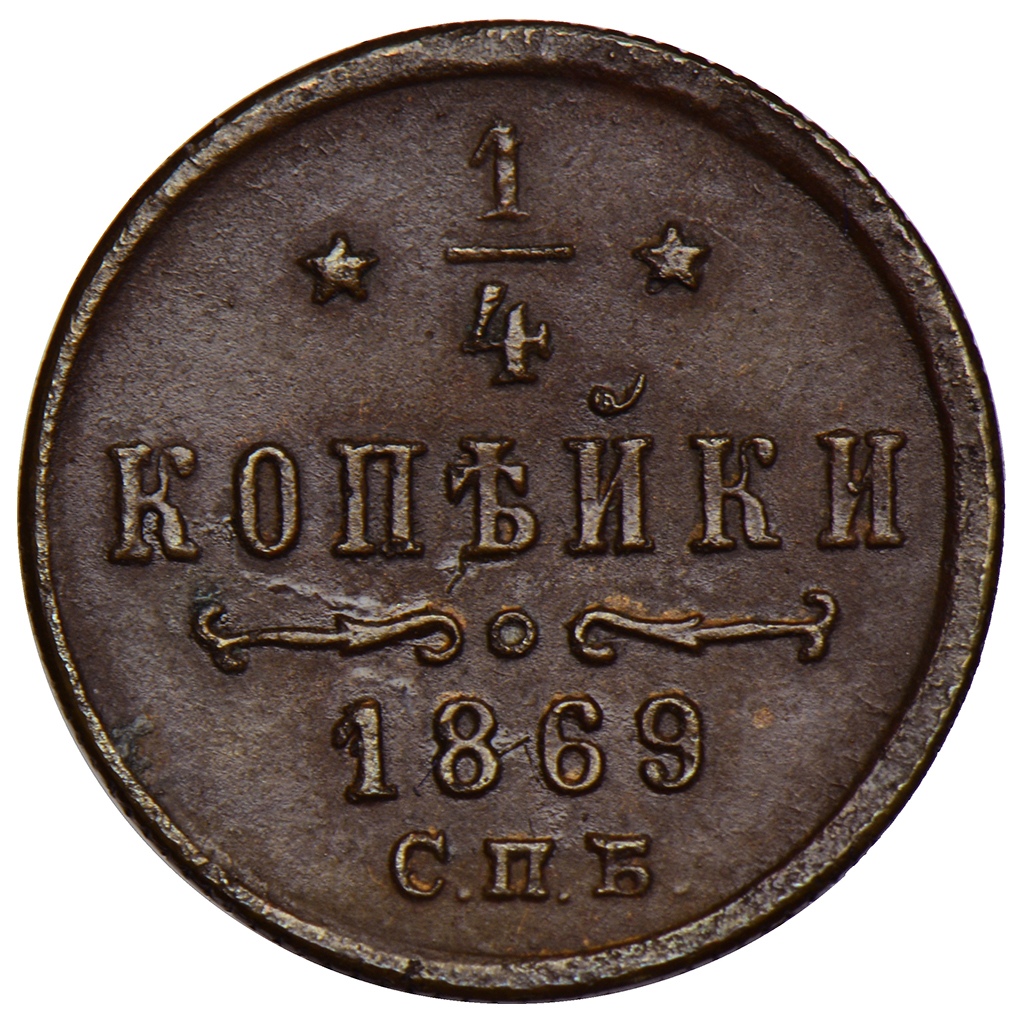 Монета представляет собой медную 1/4 копейки 1869 года с обозначением Санкт-Петербургского монетного двора (СПБ). В оригинале такие монеты чеканились в период правления Александра II и являются редкими. В данном случае, как указано в посте, это подделка, что делает её интересным объектом для изучения фальшивок.