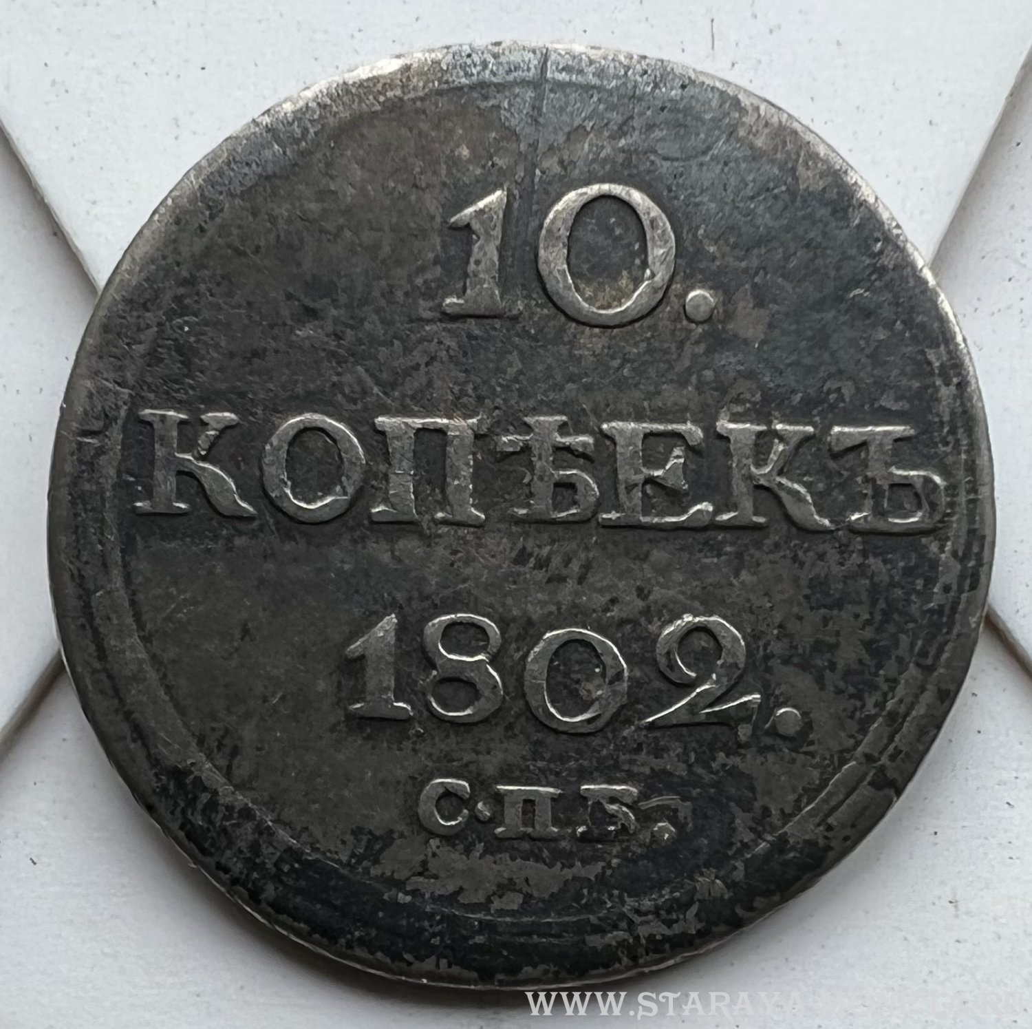 Монета номиналом 10 копеек 1802 года, отчеканенная на Санкт-Петербургском монетном дворе в период правления Александра I. Представленный экземпляр является подделкой, отлитой по распространённому фальшивому штемпелю. Такие копии часто встречаются на нумизматическом рынке и не имеют коллекционной ценности.