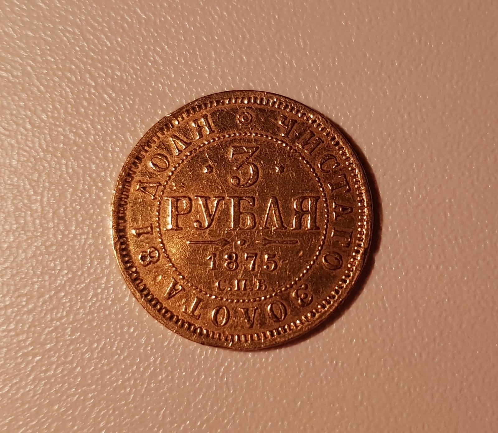 Монета номиналом 3 рубля 1875 года, отчеканенная в период правления Александра II. Оригинальные золотые 3 рубля этого типа являются редкими и ценными. Представленный экземпляр — очевидная современная подделка низкого качества, что подтверждается реакцией сообщества нумизматов.