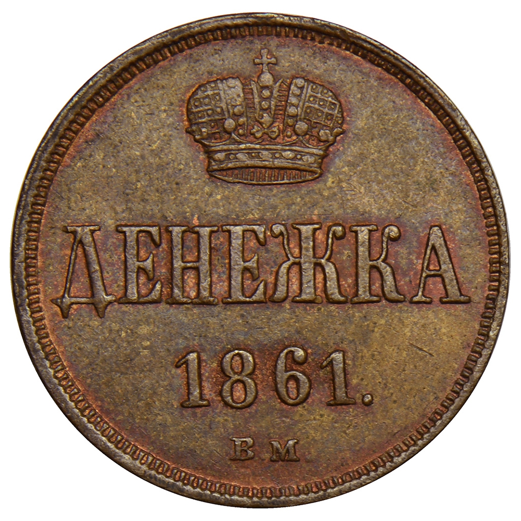 Медная денежка 1861 года, отчеканенная в правление Александра II. Монета представлена как опасная подделка уровня 5/5, выявленная экспертизой. Её характеристики (вес 3.0 г, диаметр 18 мм) и наличие идентичных экземпляров от одного штемпеля указывают на профессиональную фальшивку.