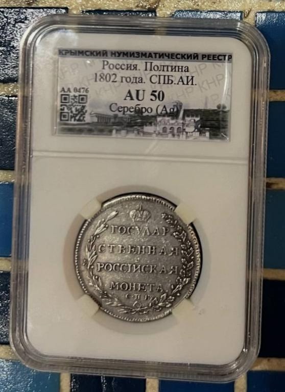 Монета представляет собой копию серебряной полтины 1802 года периода правления Александра I. Подделка была идентифицирована и помещена в слаб (пластиковый холдер) с маркировкой КНР, что указывает на её неподлинное происхождение. Данный экземпляр был выставлен на продажу на аукционном ресурсе, что служит предостережением для коллекционеров.