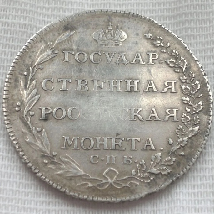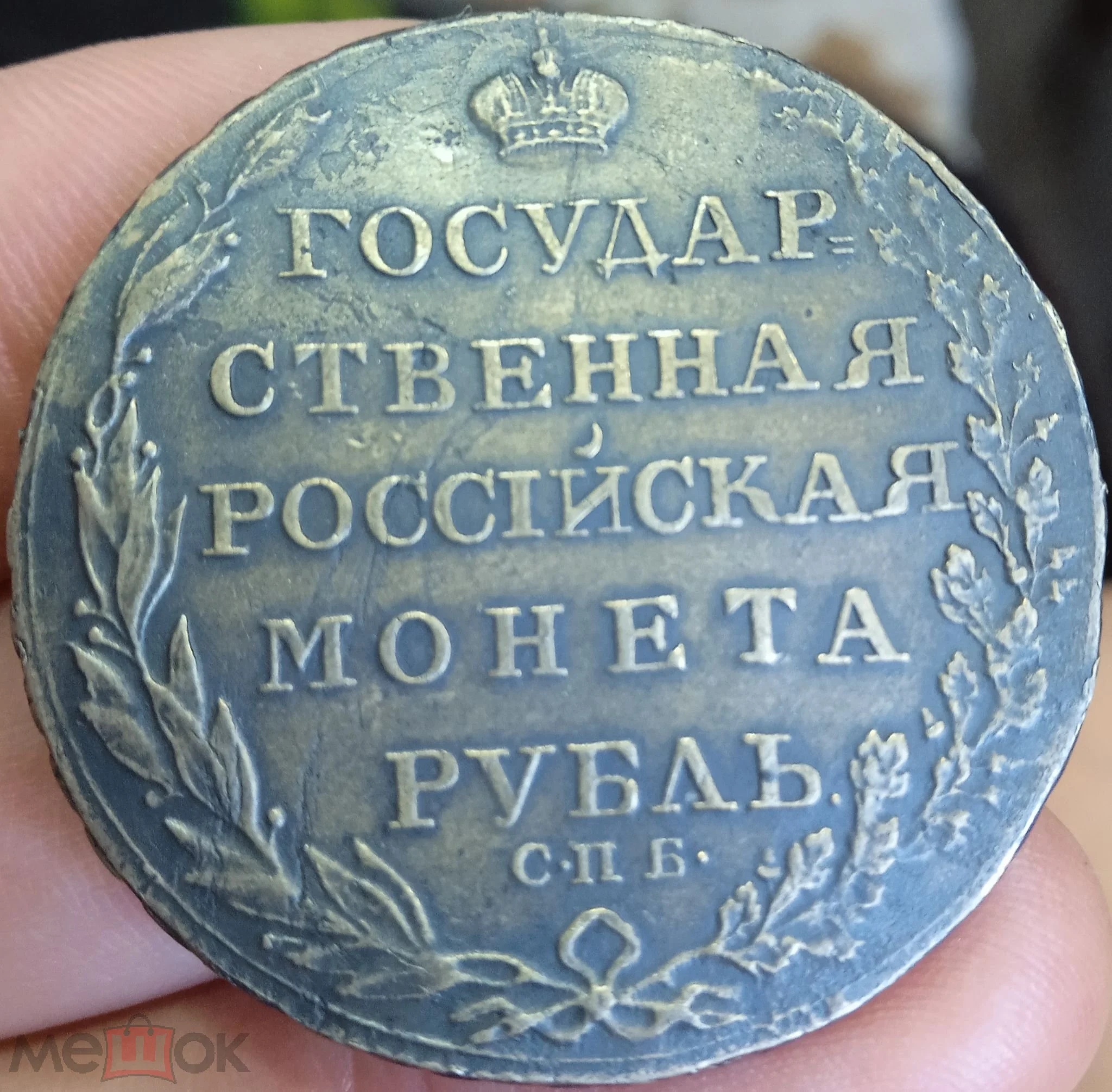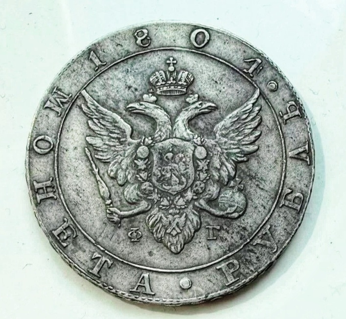 Представленная монета — рубль 1801 года, отчеканенный в правление императора Александра I. Однако это грубая современная подделка, выполненная методом литья. Детали рельефа размыты, а сам металл и патина не соответствуют оригинальным серебряным монетам того периода.