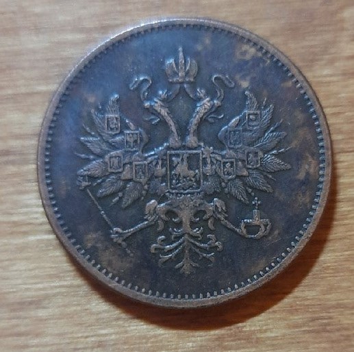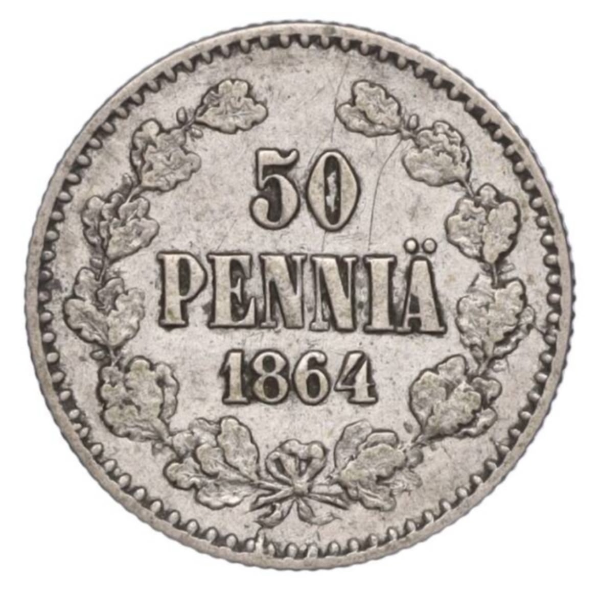 Медная монета номиналом 50 пенни, отчеканенная для Великого княжества Финляндского в 1864 году в период правления императора Александра II. Год выпуска считается не самым частым. Монета признана подлинной на основе консенсуса в экспертном сообществе, несмотря на некоторые вопросы по деталям поверхности.