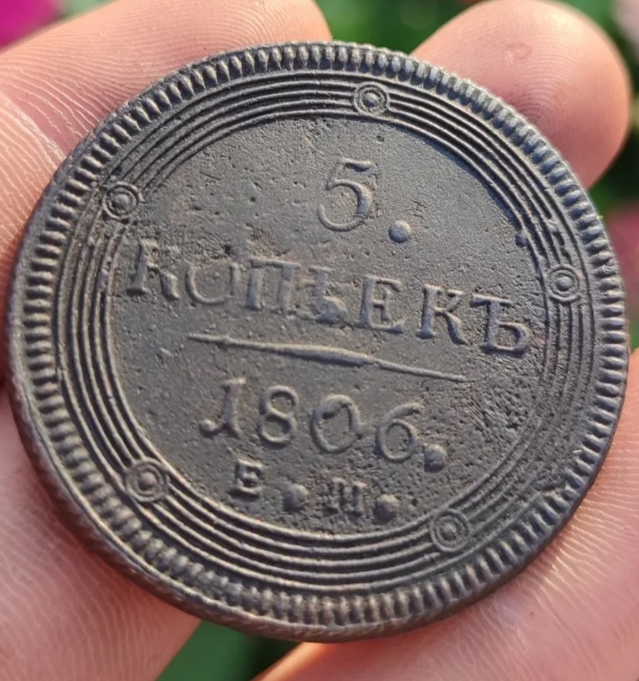 Монета представляет собой копию медной 5-копеечной монеты периода правления Александра I, отчеканенной на Екатеринбургском монетном дворе (инициалы «ЕМ»). Несмотря на внешнее сходство с оригиналом, автор поста прямо указывает, что это реплика. Комментаторы отмечают высокое качество подделки, затрудняющее визуальное определение на первый взгляд.