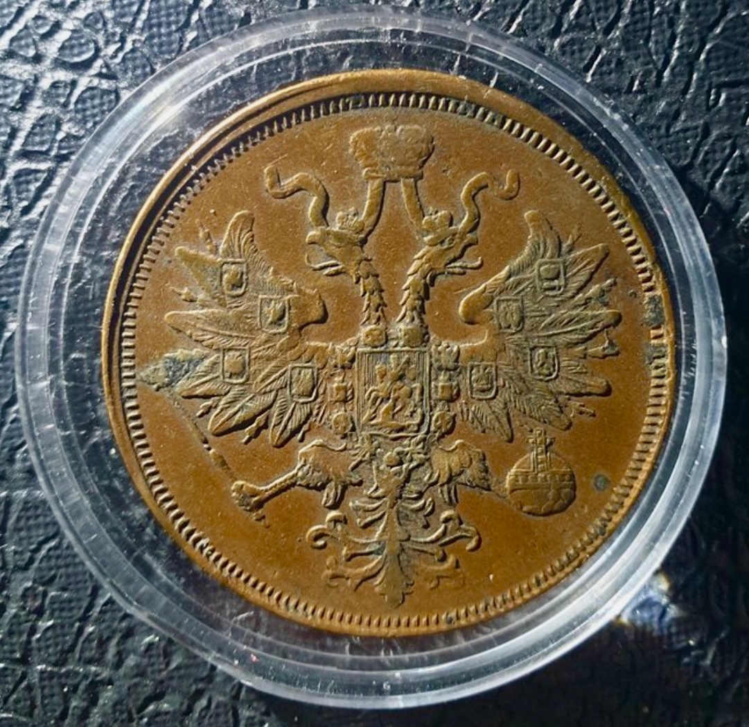 Медная монета номиналом 3 копейки 1863 года, отчеканенная в период правления императора Александра II. Несмотря на внешнее сходство, данная монета является современной копией, о чём свидетельствуют признаки литья и отсутствие характерных для подлинника деталей. Такие экземпляры представляют интерес лишь как сувениры или учебные материалы для коллекционеров.