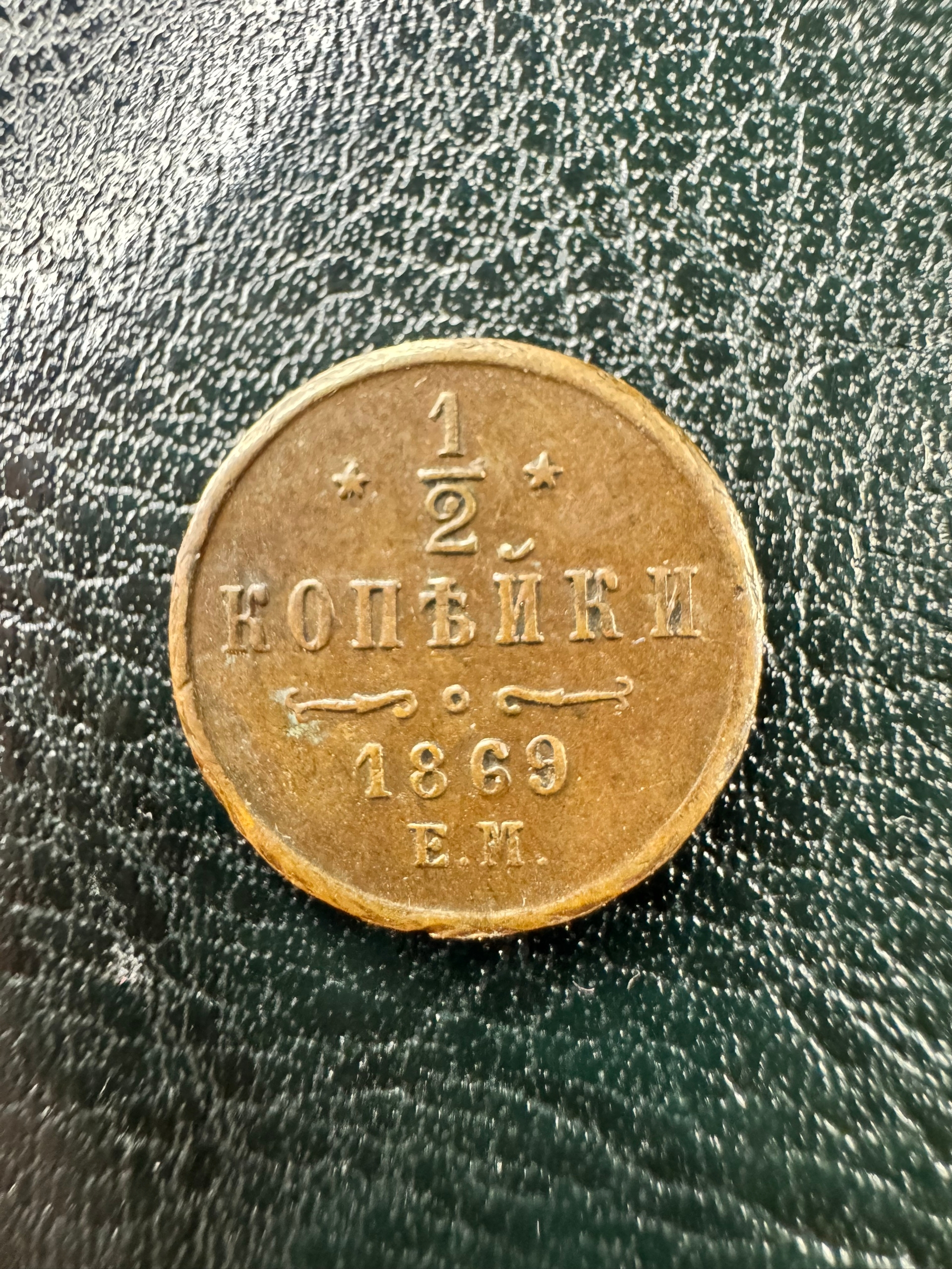 Медная монета номиналом 1/2 копейки 1869 года, отчеканенная на Екатеринбургском монетном дворе (знак «ЕМ») в период правления императора Александра II. Монета является оригиналом, что подтверждается консенсусом в комментариях сообщества, где её признали нормальной и не вызвавшей подозрений в подлинности.