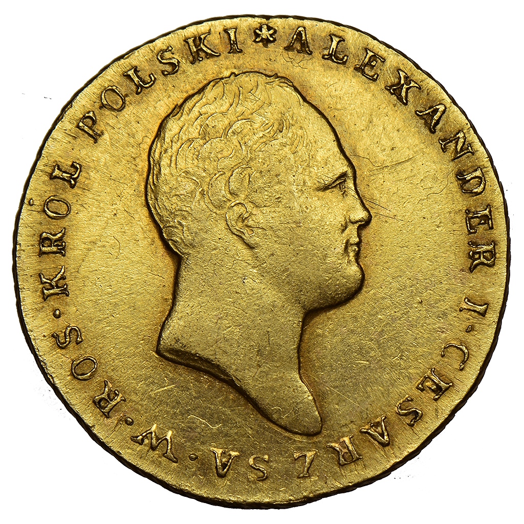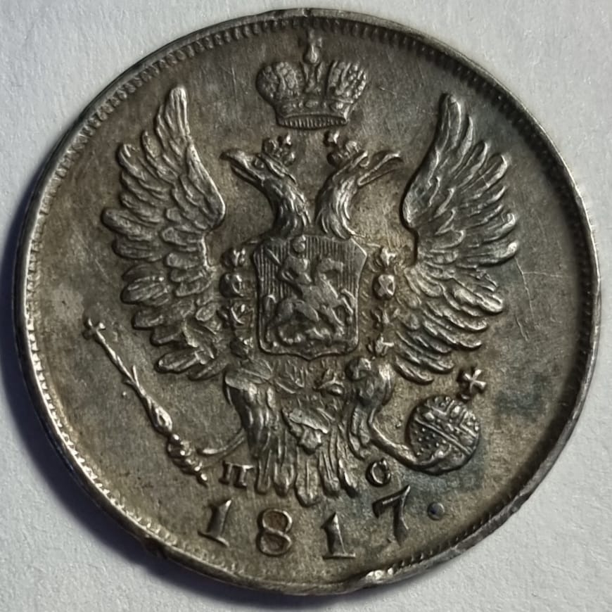 Монета номиналом полтина (50 копеек) периода правления Александра I. Отчеканена предположительно из серебра. Эксперты единогласно признали её фейком из-за несоответствия деталей штемпеля, качества металла и отсутствия признаков подлинной чеканки.