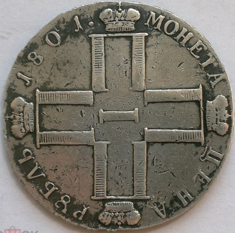 Монета представляет собой рубль 1801 года, отчеканенный в начале правления императора Александра I. Однако, судя по консенсусу в комментариях, это современная подделка. Эксперты отмечают кривой крест на реверсе и общее низкое качество исполнения, характерное для сувенирных копий.