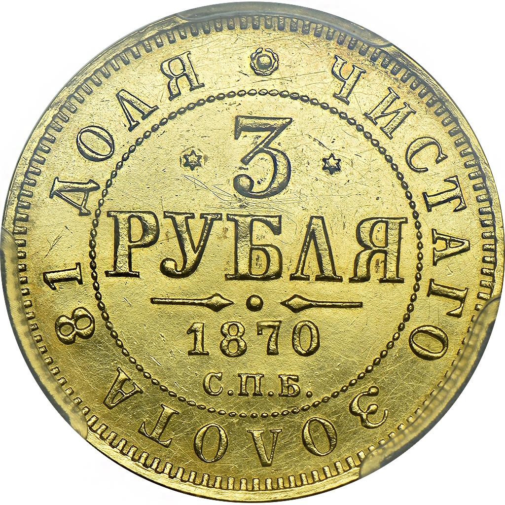 Золотая монета номиналом 3 рубля 1870 года, отчеканенная в период правления Александра II. Это известная на рынке высококачественная подделка, выполненная из драгоценного металла и упакованная в сертифицированный слаб PCGS. Экземпляр представляет серьёзную опасность для коллекционеров из-за своего качества и наличия поддельного сертификата.