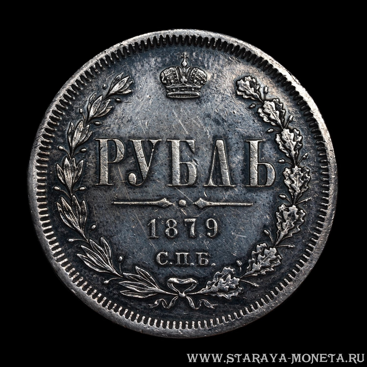 Монета представляет собой рубль 1879 года, отчеканенный при императоре Александре II на Санкт-Петербургском монетном дворе (обозначение СПБ). В исходном посте автор напрямую указывает, что это подделка. Подлинные рубли этого периода чеканились из серебра 868-й пробы и имеют чёткие детали гурта и портрета.