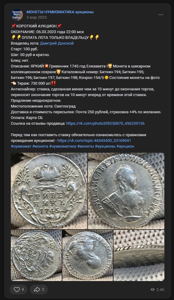 В посте из группы нумизматов представлена монета без описания и чётких фотографий. Комментарии не содержат профессиональной оценки атрибутов или подлинности, а лишь личную переписку. Без визуальных данных и экспертных мнений определить параметры и оригинальность монеты невозможно.