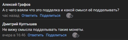 В посте представлена фотография монеты без указания ключевых атрибутов. Комментарии не содержат экспертной оценки подлинности, а лишь задают вопросы по контексту публикации. На основе имеющейся информации невозможно определить ни параметры монеты, ни её оригинальность.