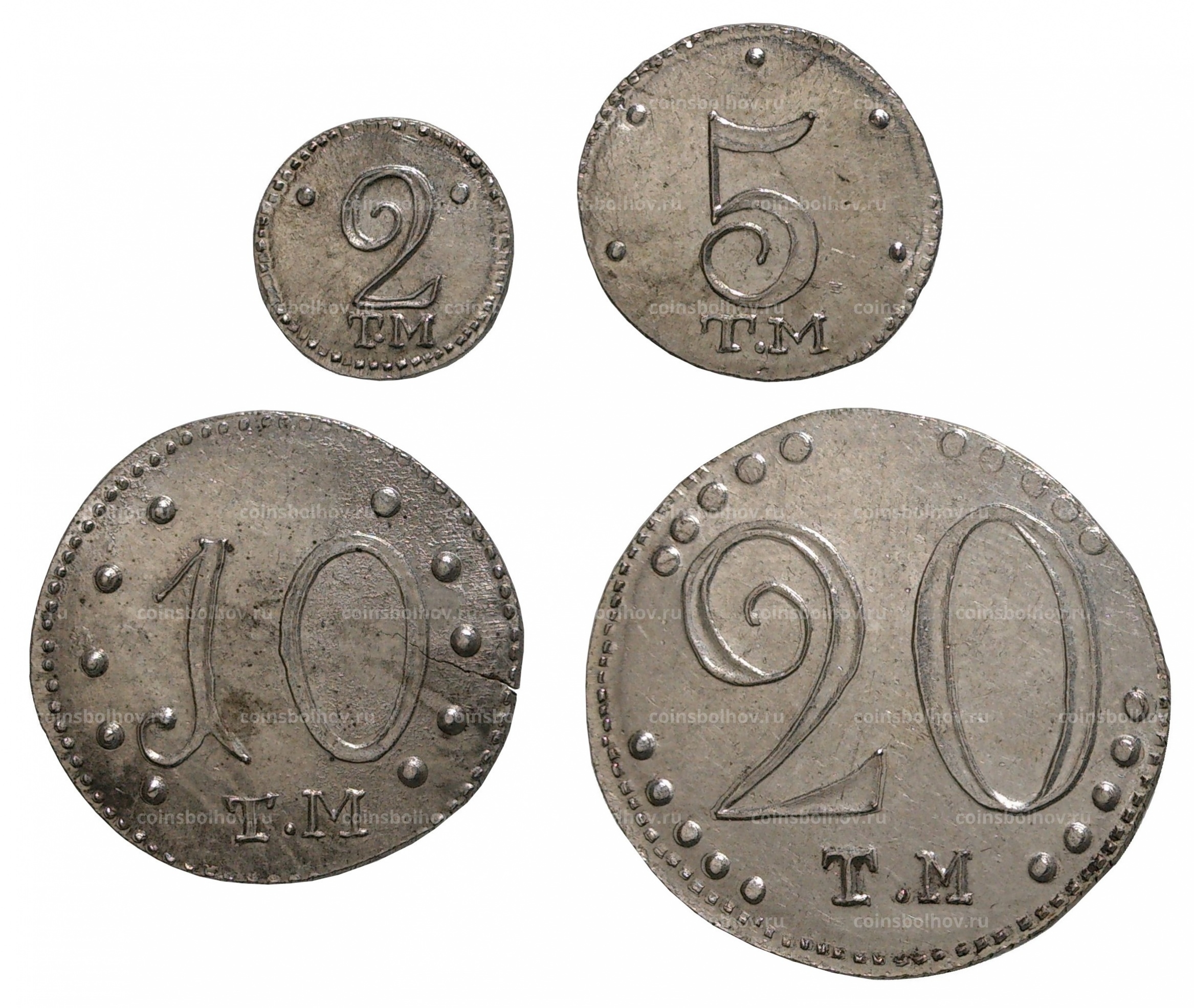 Представлены две сомнительные серебряные монеты, стилизованные под чешуйки XVI века. Первая имитирует полушку Ивана Грозного с нечитаемыми и некаталогизированными легендами, вторая — денгу с фантазийными аверсом и реверсом. Обе признаны фальшивками (фуфлом) из-за отсутствия аналогов в каталогах, аномально хорошей сохранности и характерных для сувенирного производства 70-80-х годов признаков.