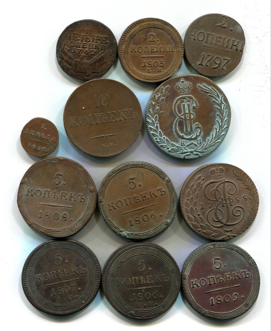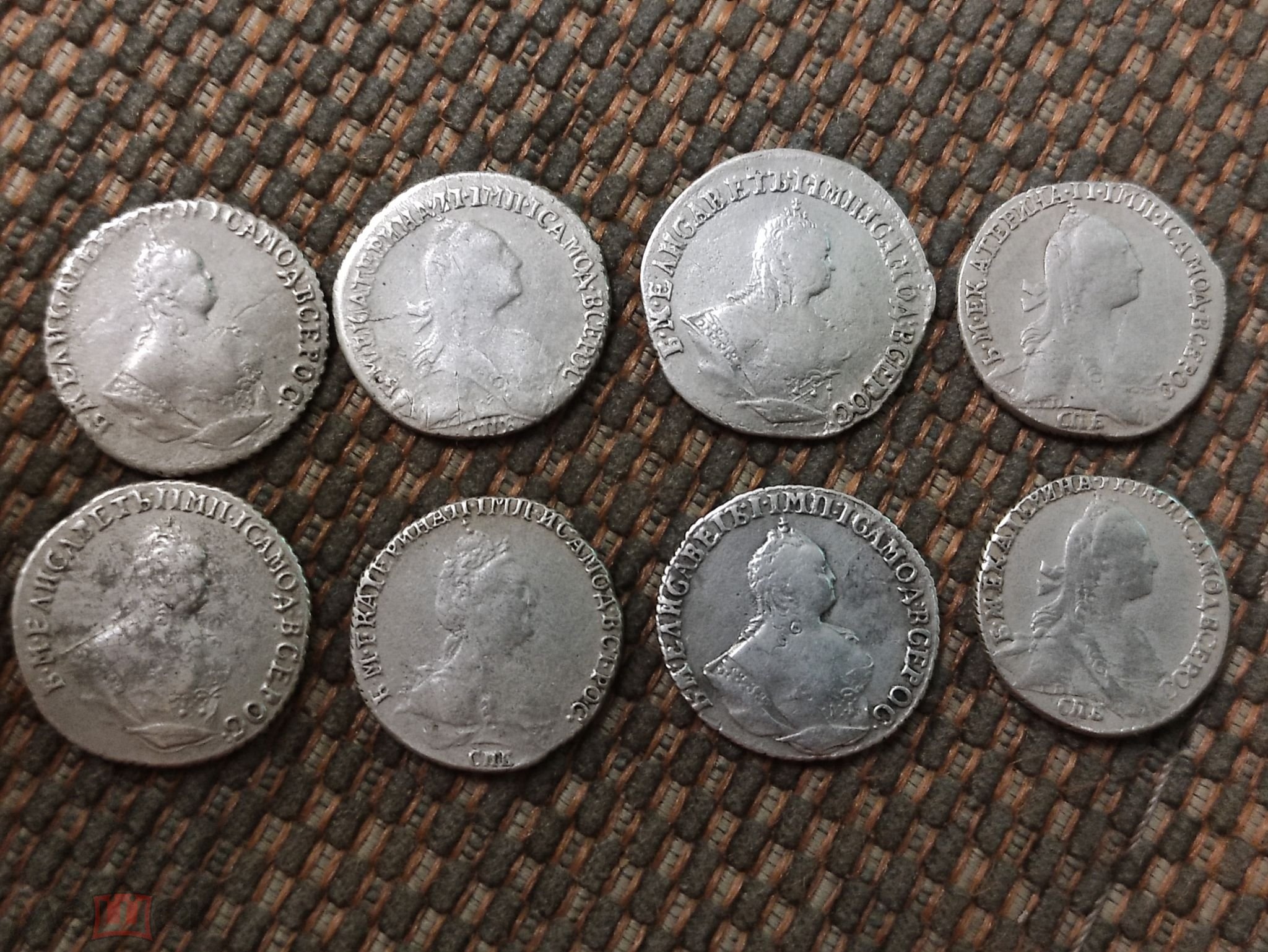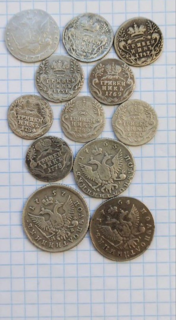На фото представлена группа мелких серебряных монет периода правления императриц Елизаветы Петровны и Екатерины II. Обсуждение в сообществе показало, что монеты являются литыми копиями. Определить подлинность по общему фото без детальных снимков гурта и веса невозможно, но консенсус экспертов склоняется к вердикту «фейк».