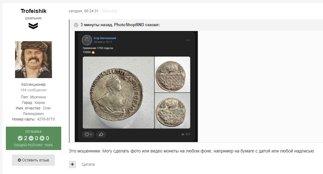 В сообществе нумизматов предупреждают о продавце, торгующем поддельными монетами. Ссылка ведёт на страницу пользователя, чьи товары вызывают серьёзные сомнения в подлинности. Термин «фуфло» в нумизматическом сленге однозначно указывает на фальшивку или низкокачественную копию.