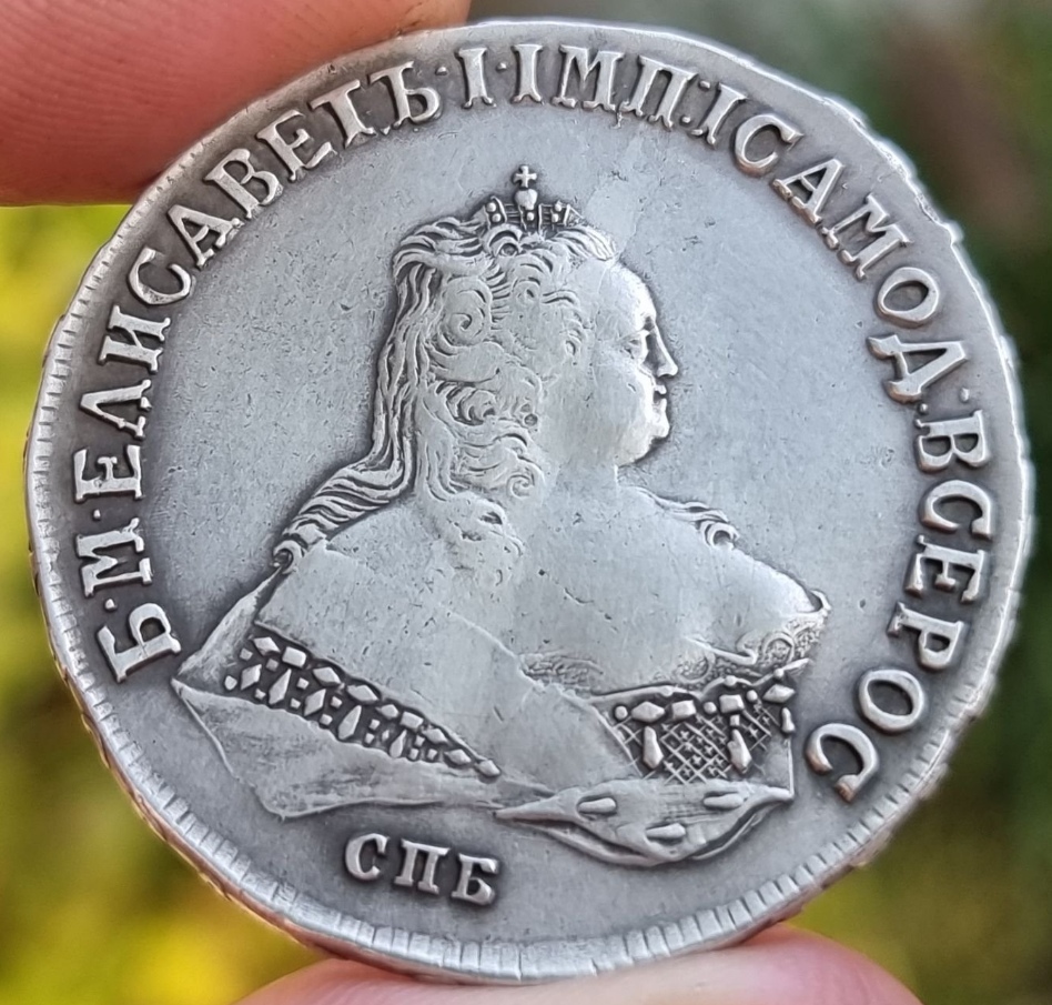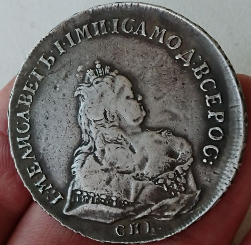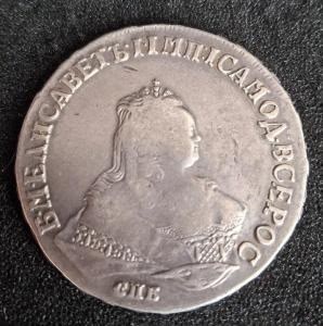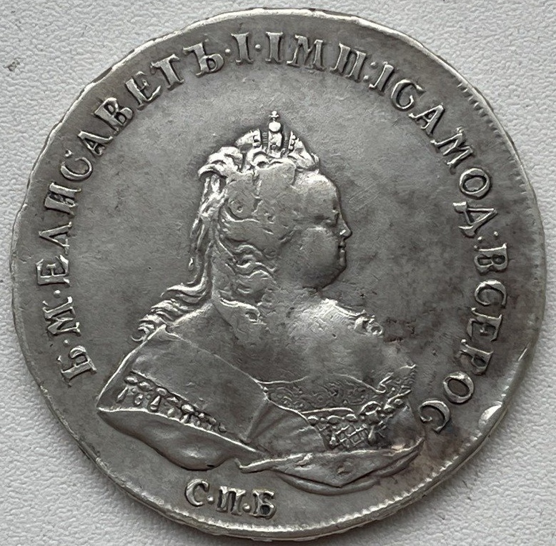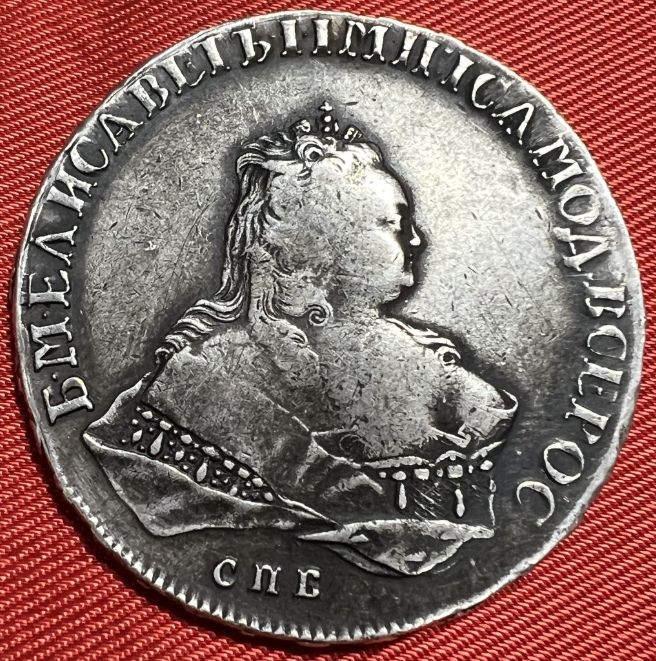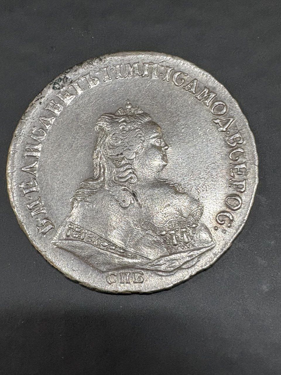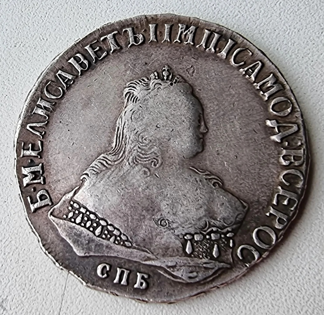 Монета номиналом 1 рубль, отчеканенная в 1741 году в Санкт-Петербурге (СПБ) в правление императрицы Елизаветы Петровны. Оригинальные рубли этого года являются редкими и ценными коллекционными экземплярами. Представленный в посте экземпляр является подделкой, о чём прямо указал автор публикации.