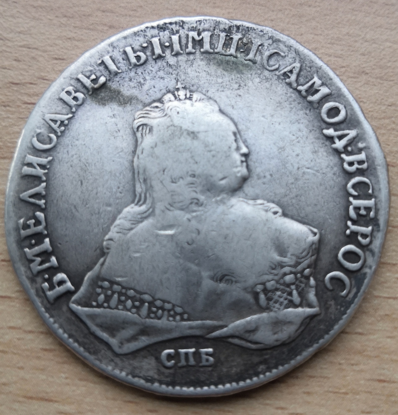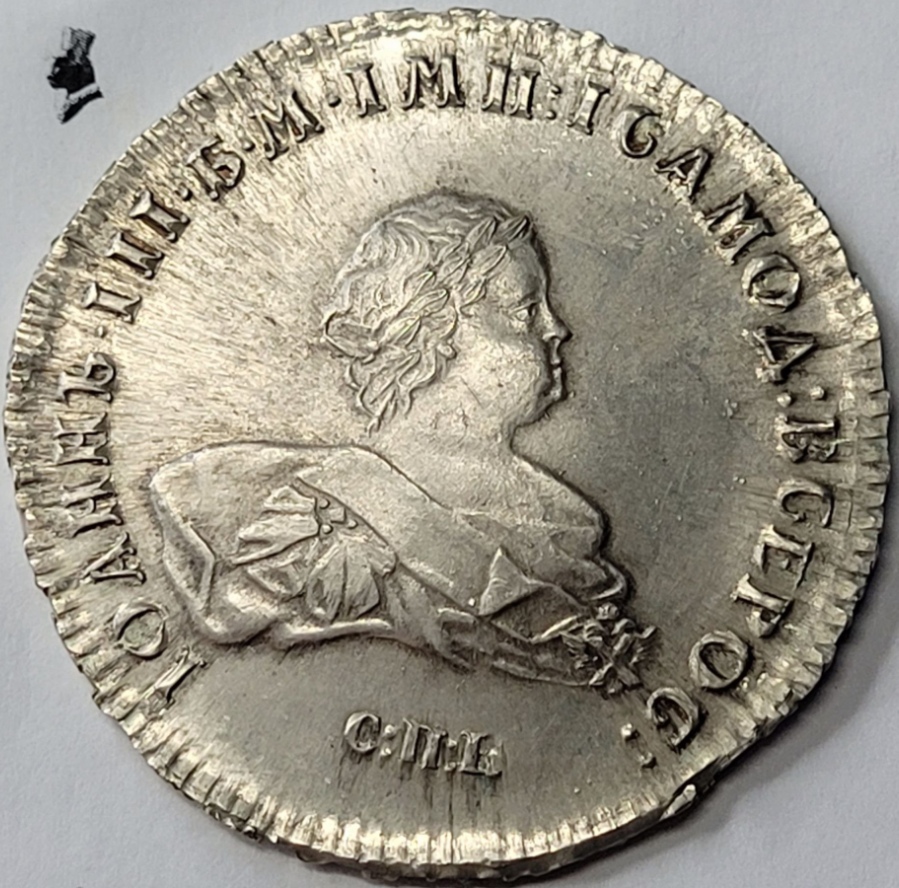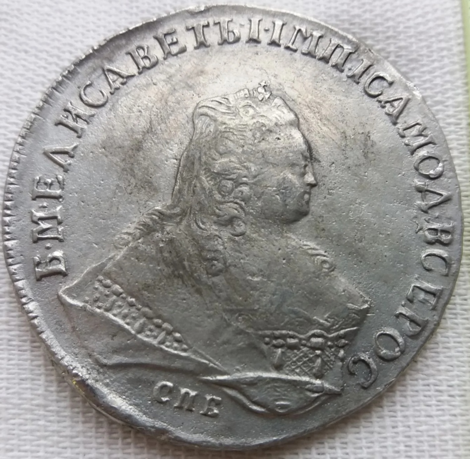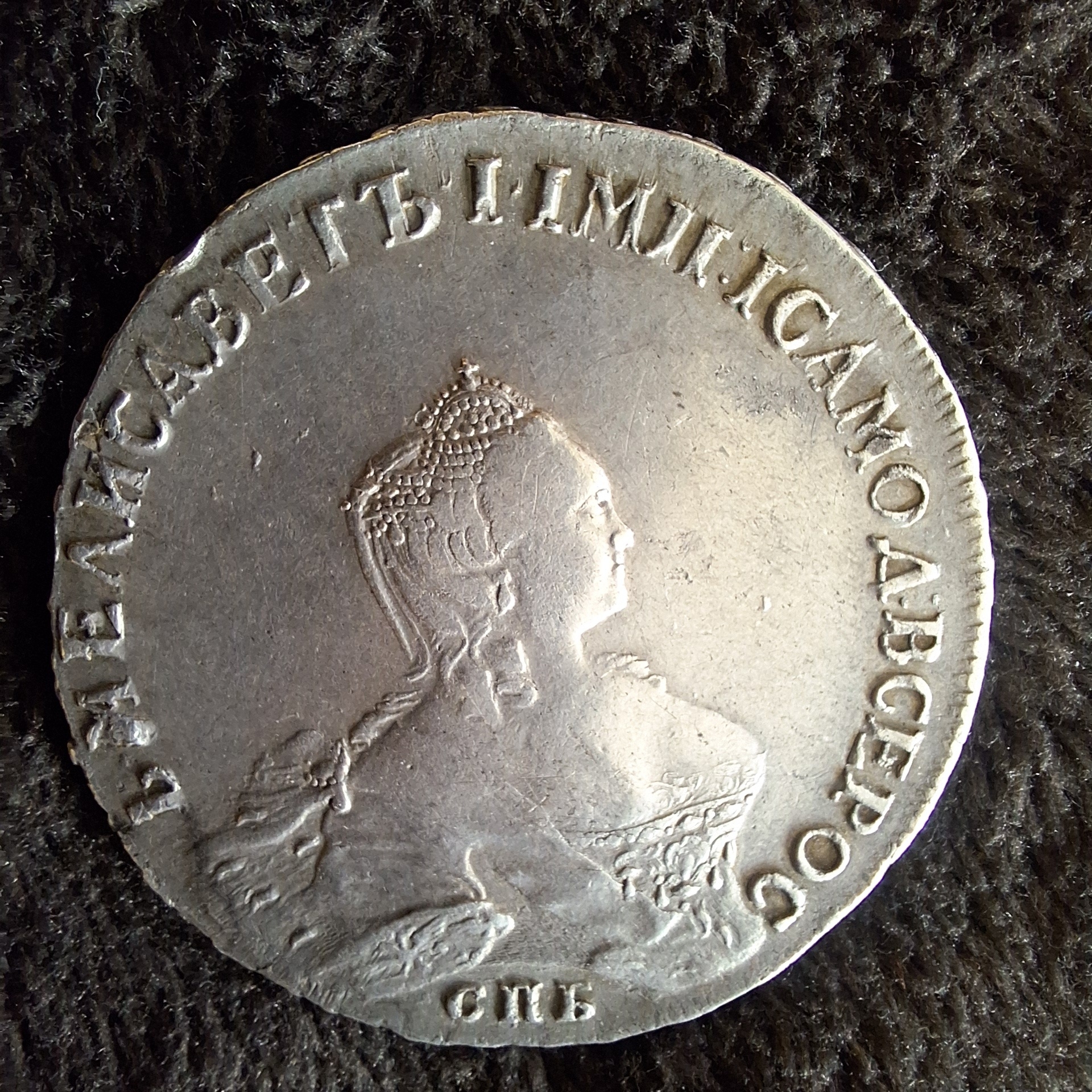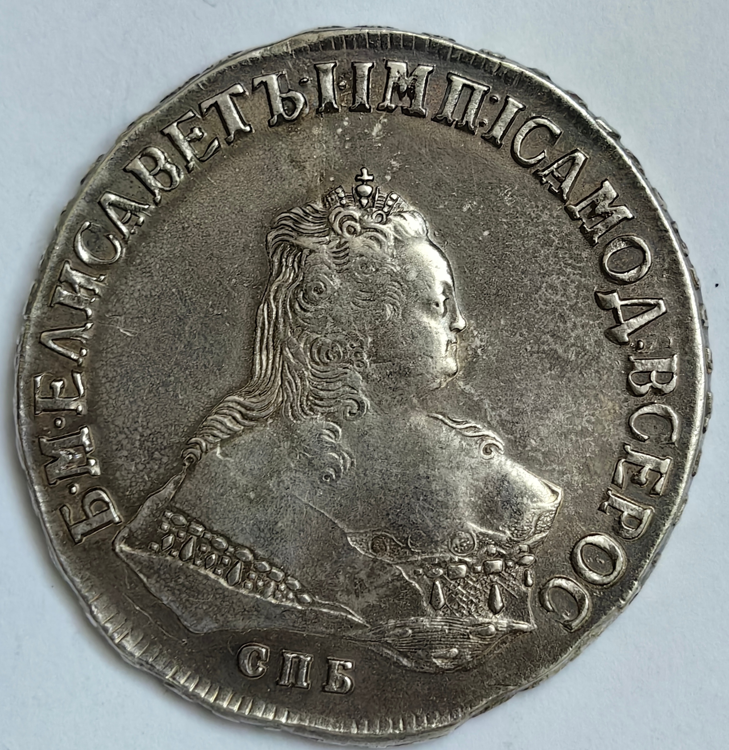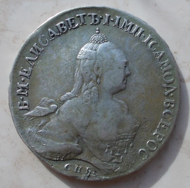 Монета номиналом 1 рубль, отчеканенная в 1741 году в Санкт-Петербурге (СПБ) в правление императрицы Елизаветы Петровны. Оригинальные рубли этого года являются редкими и ценными коллекционными экземплярами. Представленный в посте экземпляр является подделкой, о чём прямо указал автор публикации.