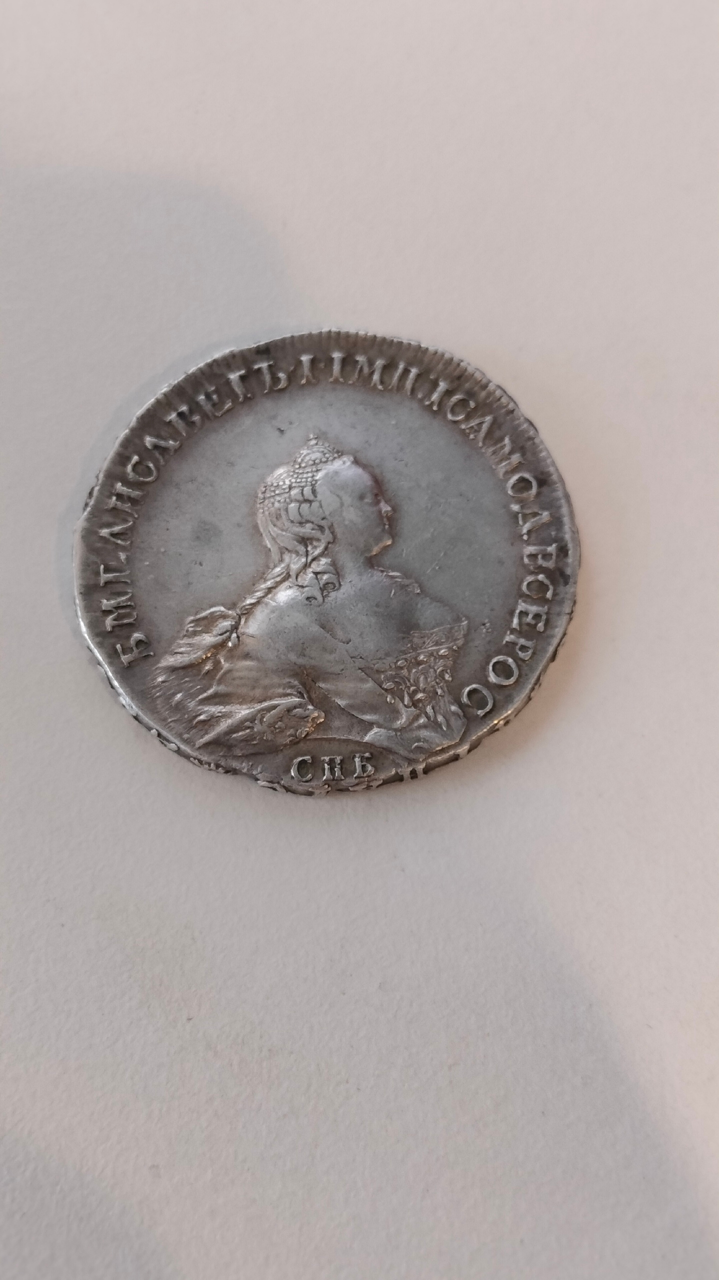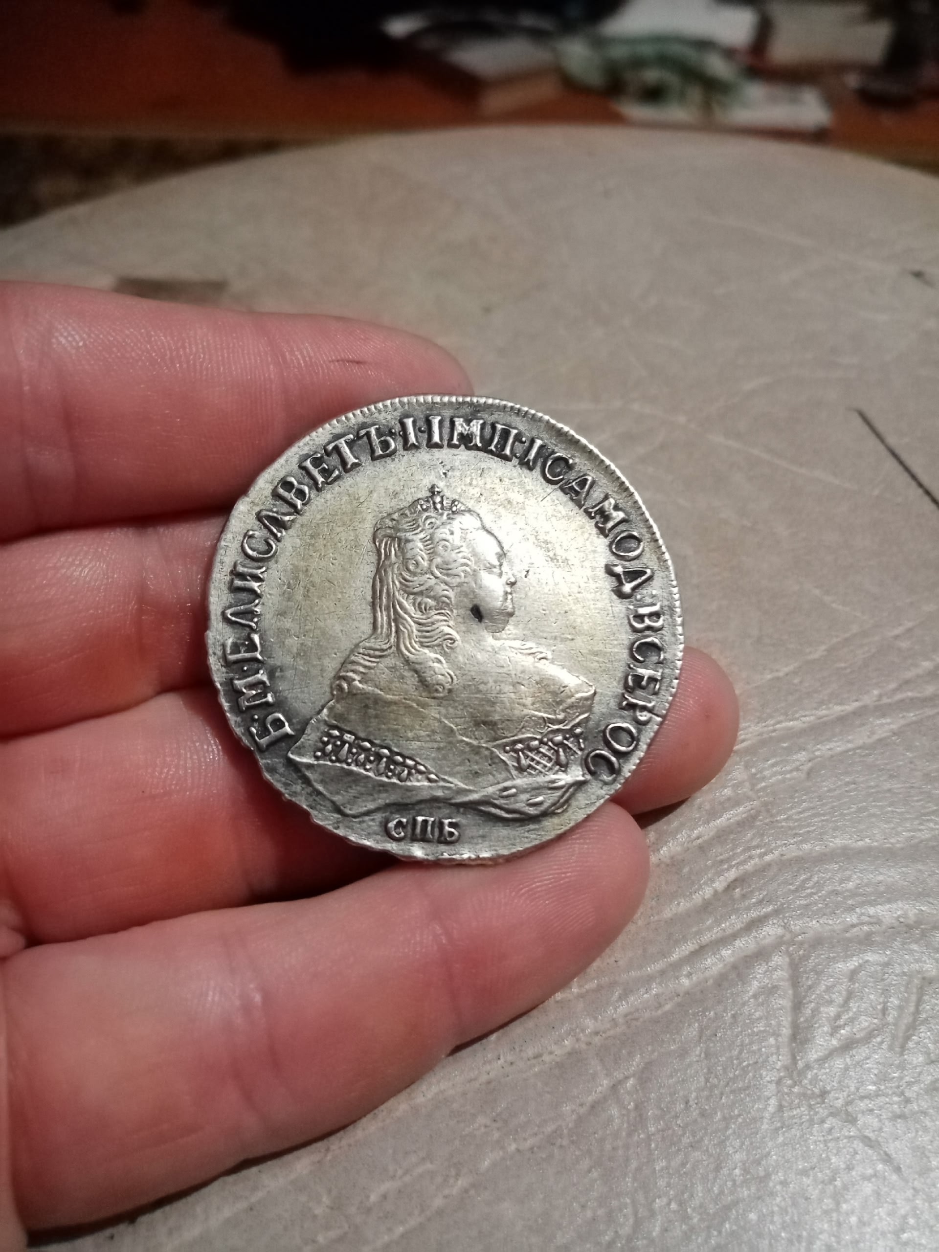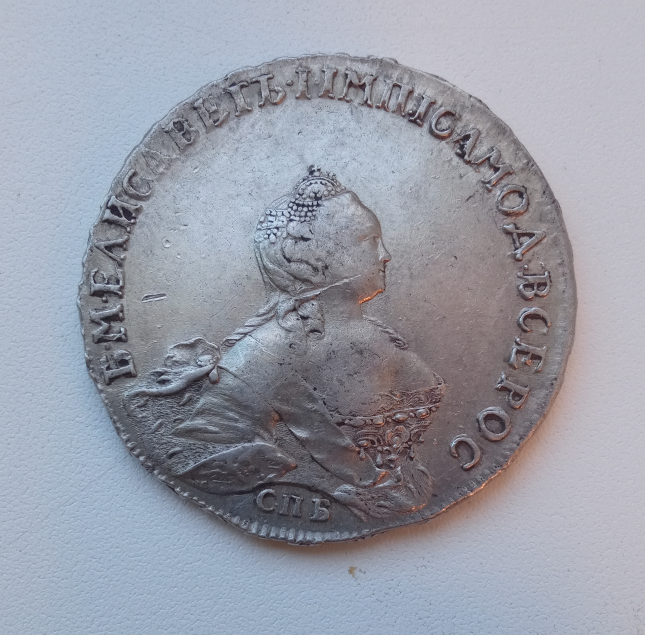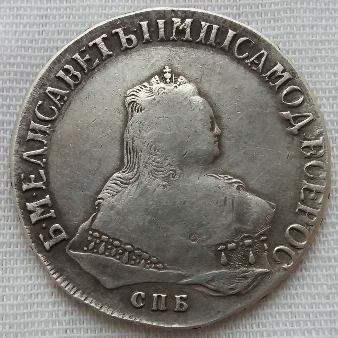 Монета номиналом 1 рубль, отчеканенная в 1741 году в Санкт-Петербурге (СПБ) в правление императрицы Елизаветы Петровны. Оригинальные рубли этого года являются редкими и ценными коллекционными экземплярами. Представленный в посте экземпляр является подделкой, о чём прямо указал автор публикации.