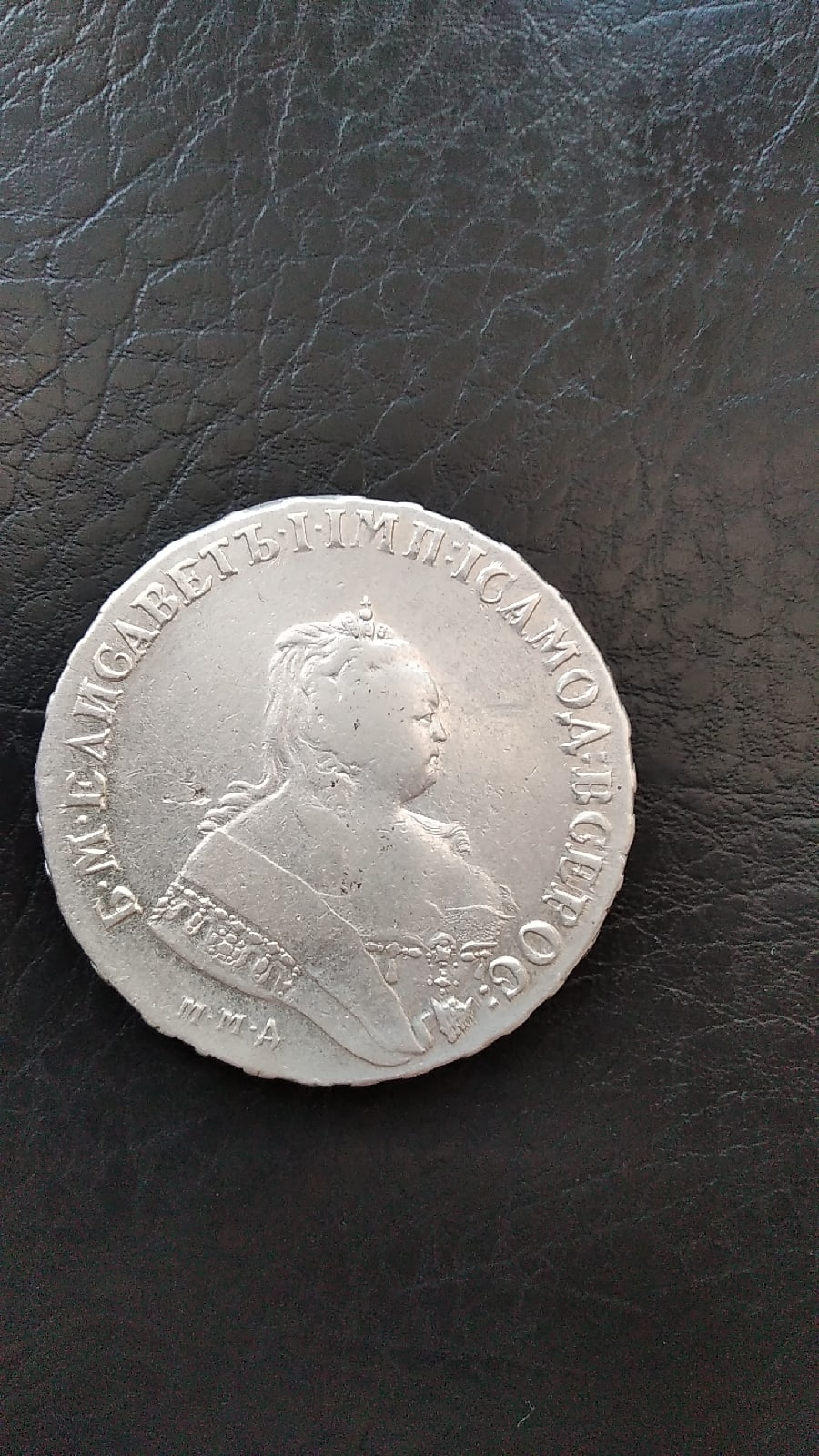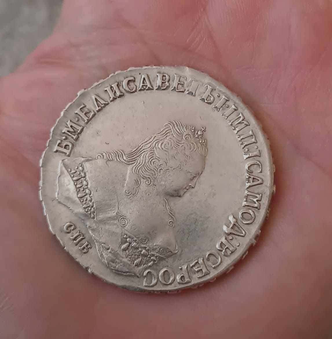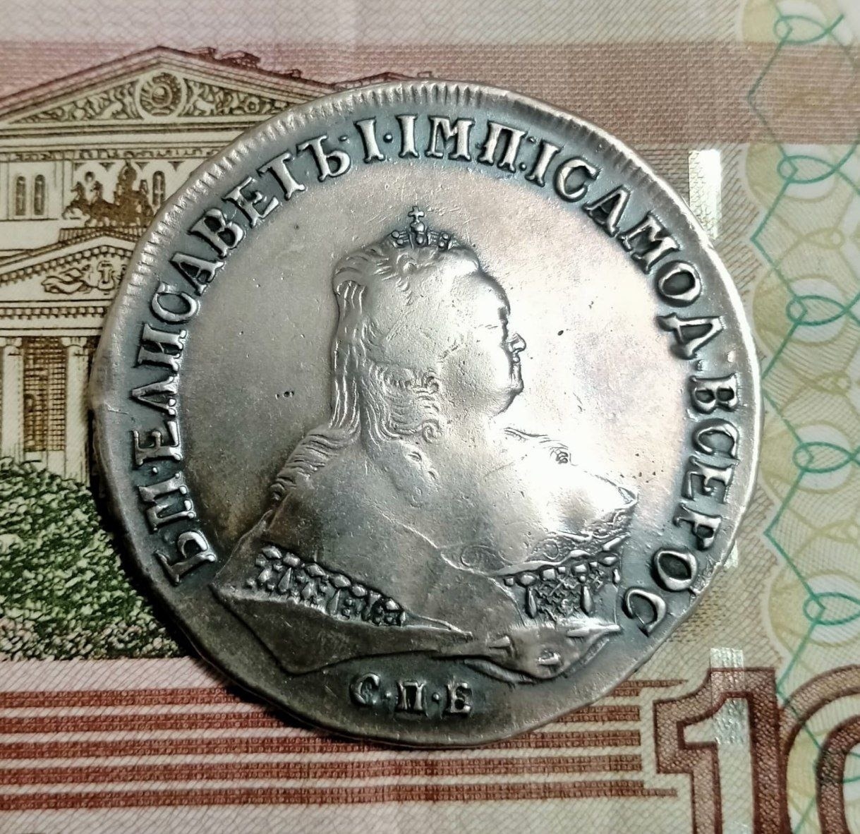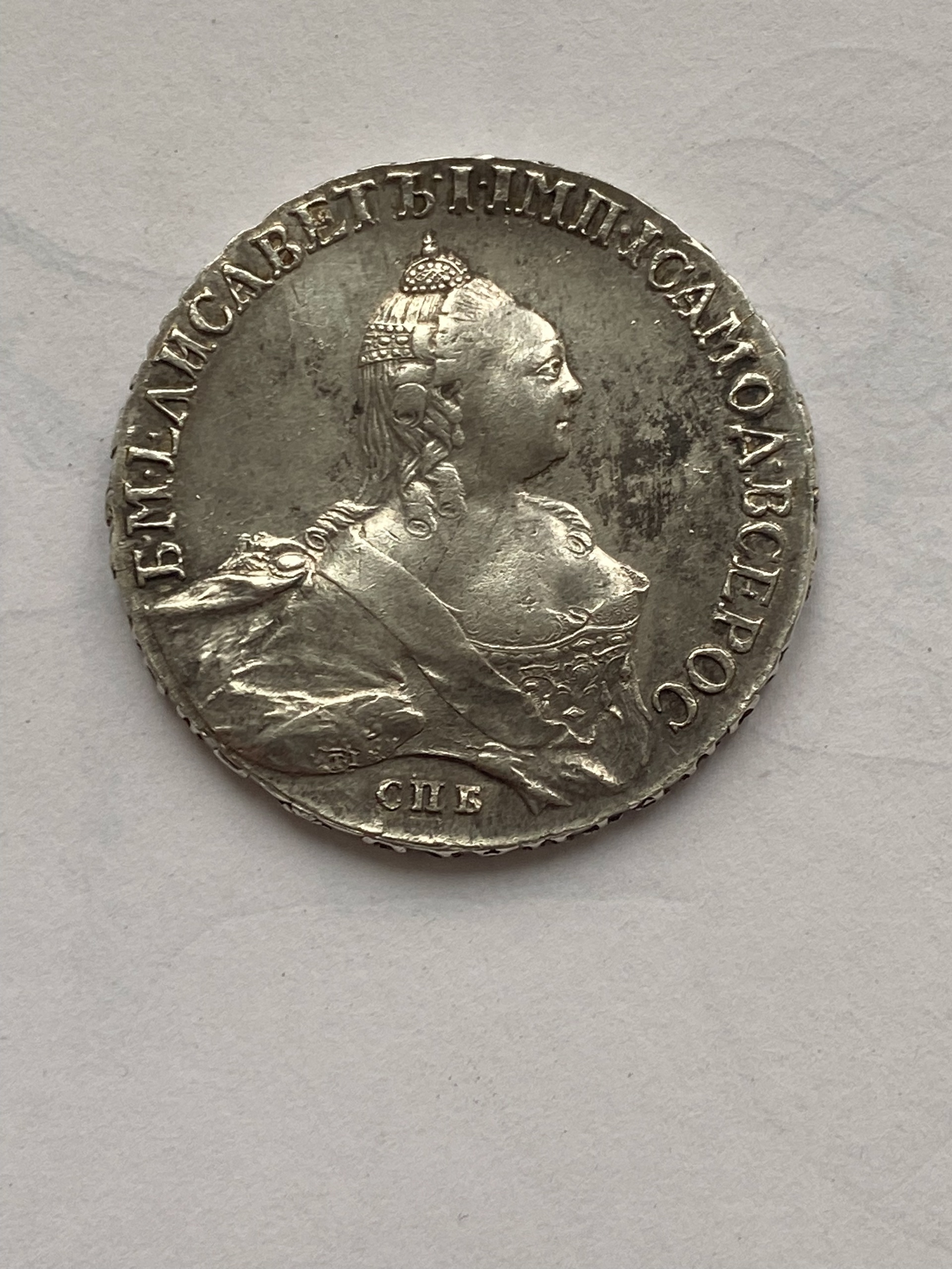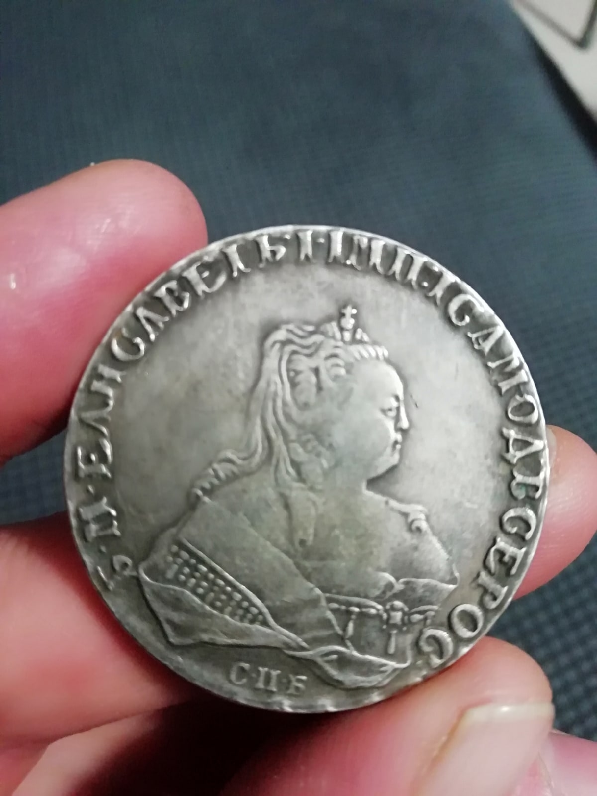 Монета номиналом 1 рубль, отчеканенная в 1741 году в Санкт-Петербурге (СПБ) в правление императрицы Елизаветы Петровны. Оригинальные рубли этого года являются редкими и ценными коллекционными экземплярами. Представленный в посте экземпляр является подделкой, о чём прямо указал автор публикации.