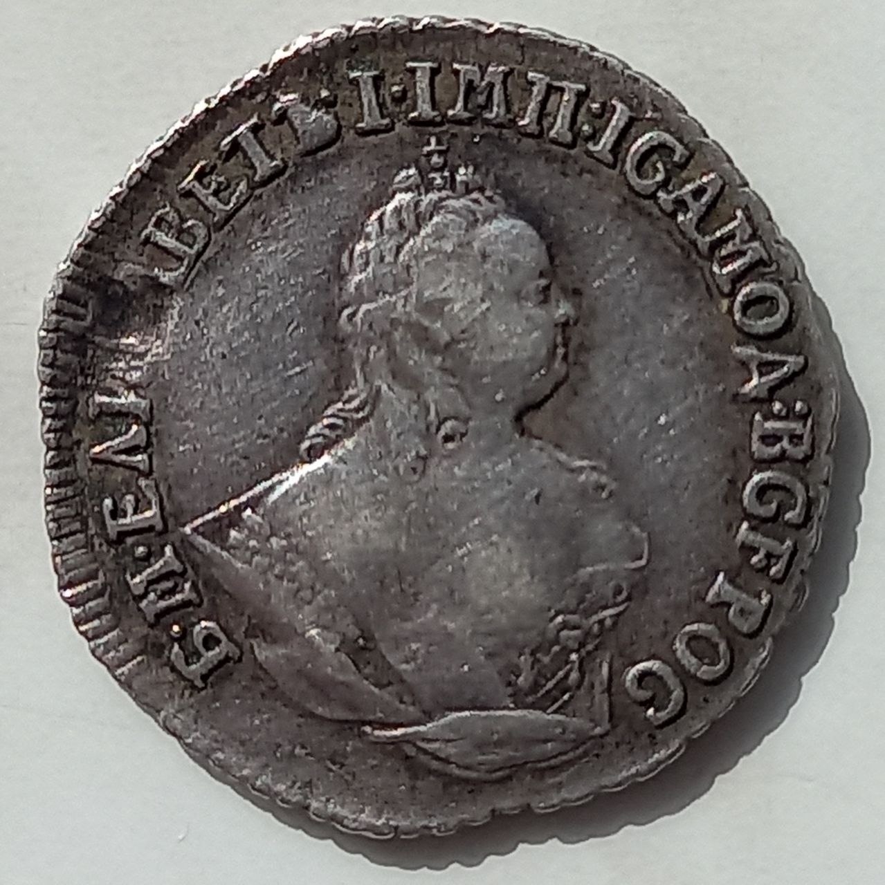 Монета представляет собой копию серебряного гривенника (10 копеек) времён правления императрицы Елизаветы Петровны. Оригинальные монеты этого типа чеканились на Санкт-Петербургском монетном дворе. Данный экземпляр является современной репликой, о чём прямо указано в описании поста.