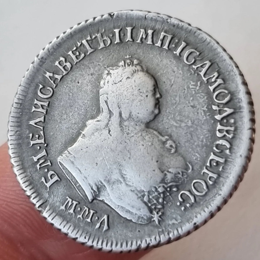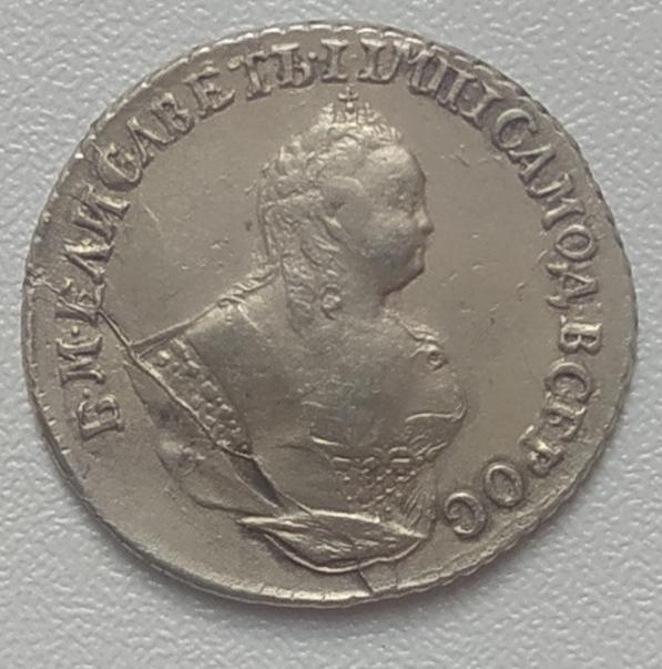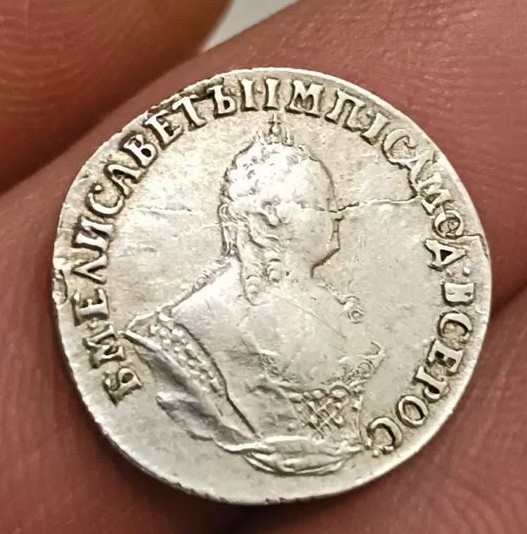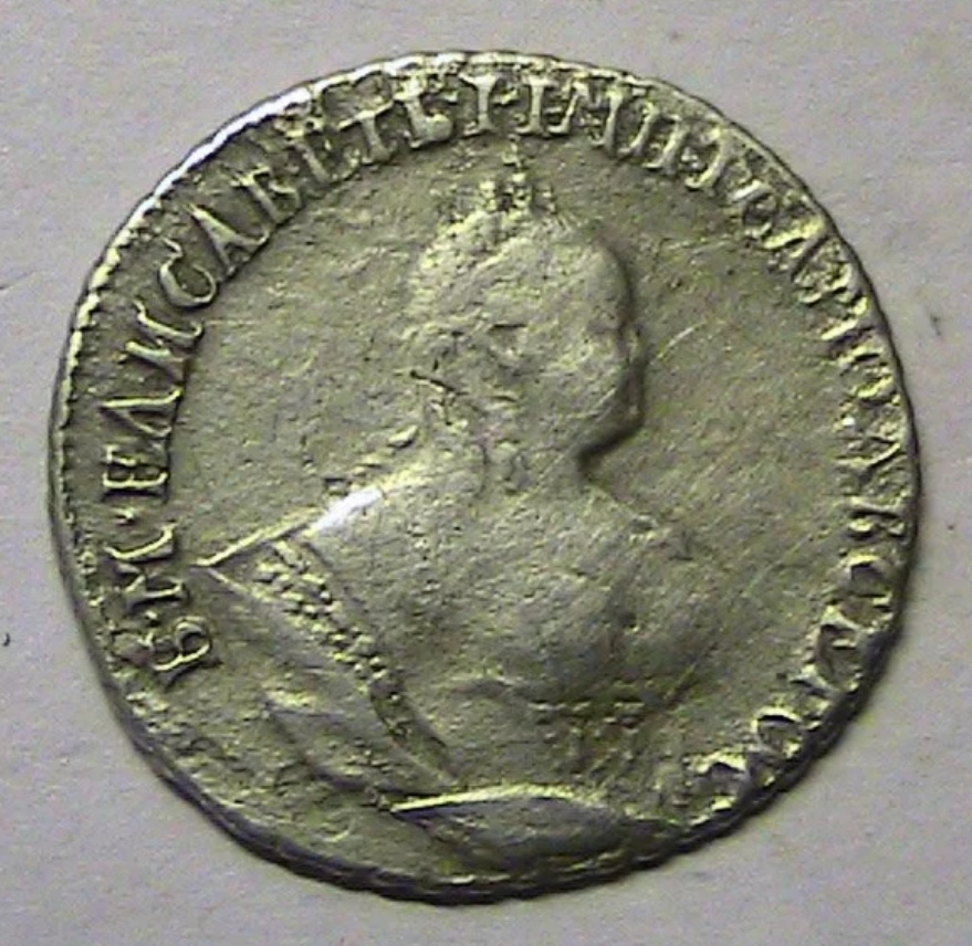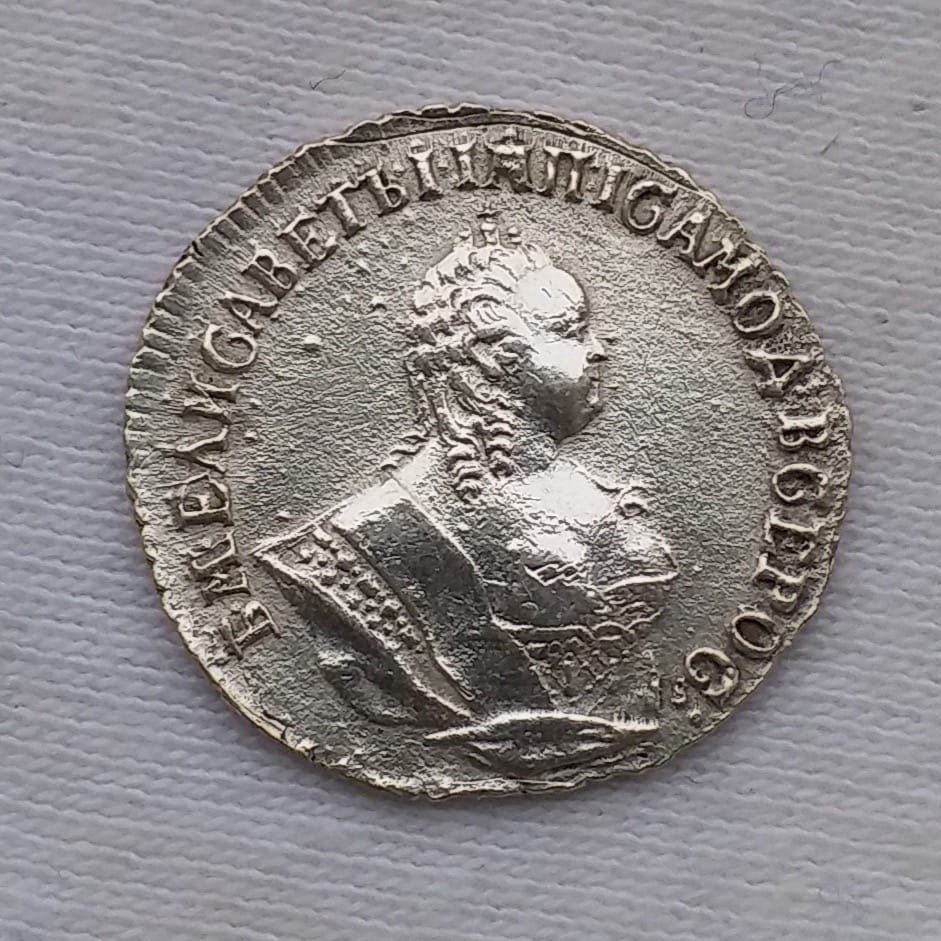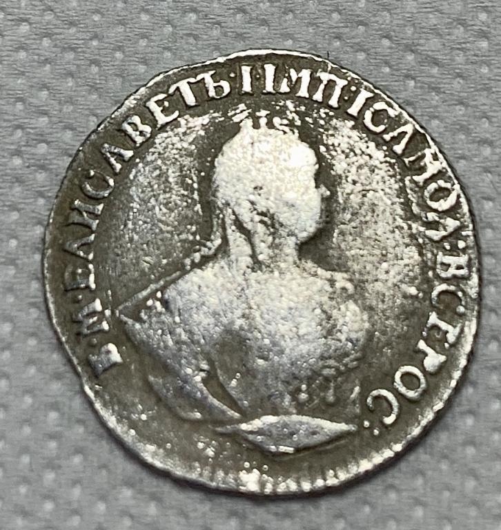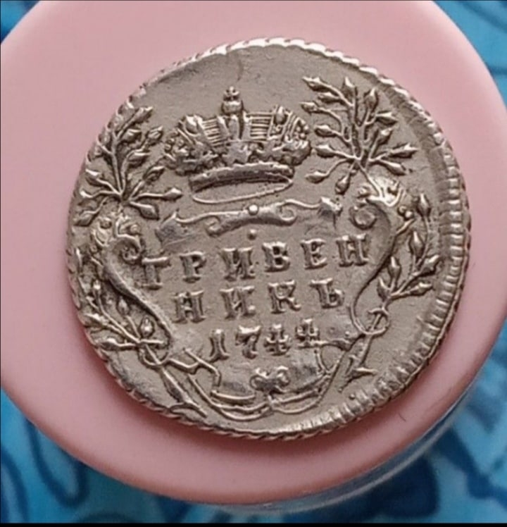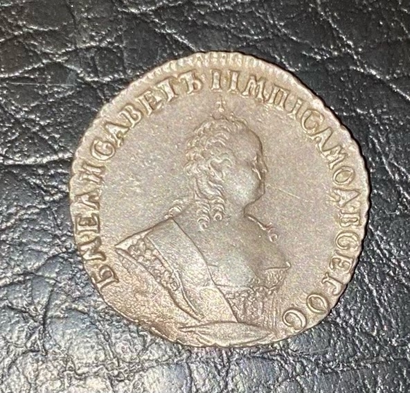 Монета представляет собой гривенник (10 копеек) времён правления императрицы Елизаветы Петровны, отчеканенный в 1744 году. Оригинальные экземпляры этого периода являются редкими и ценными. Представленный в посте экземпляр является копией, что прямо указано автором и подтверждено комментаторами.